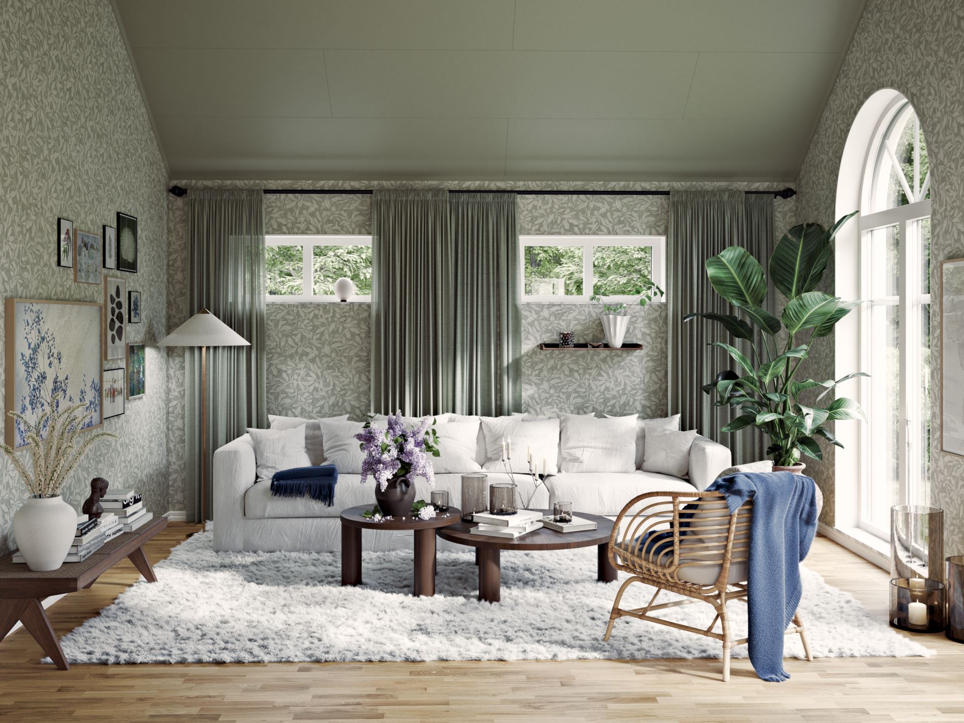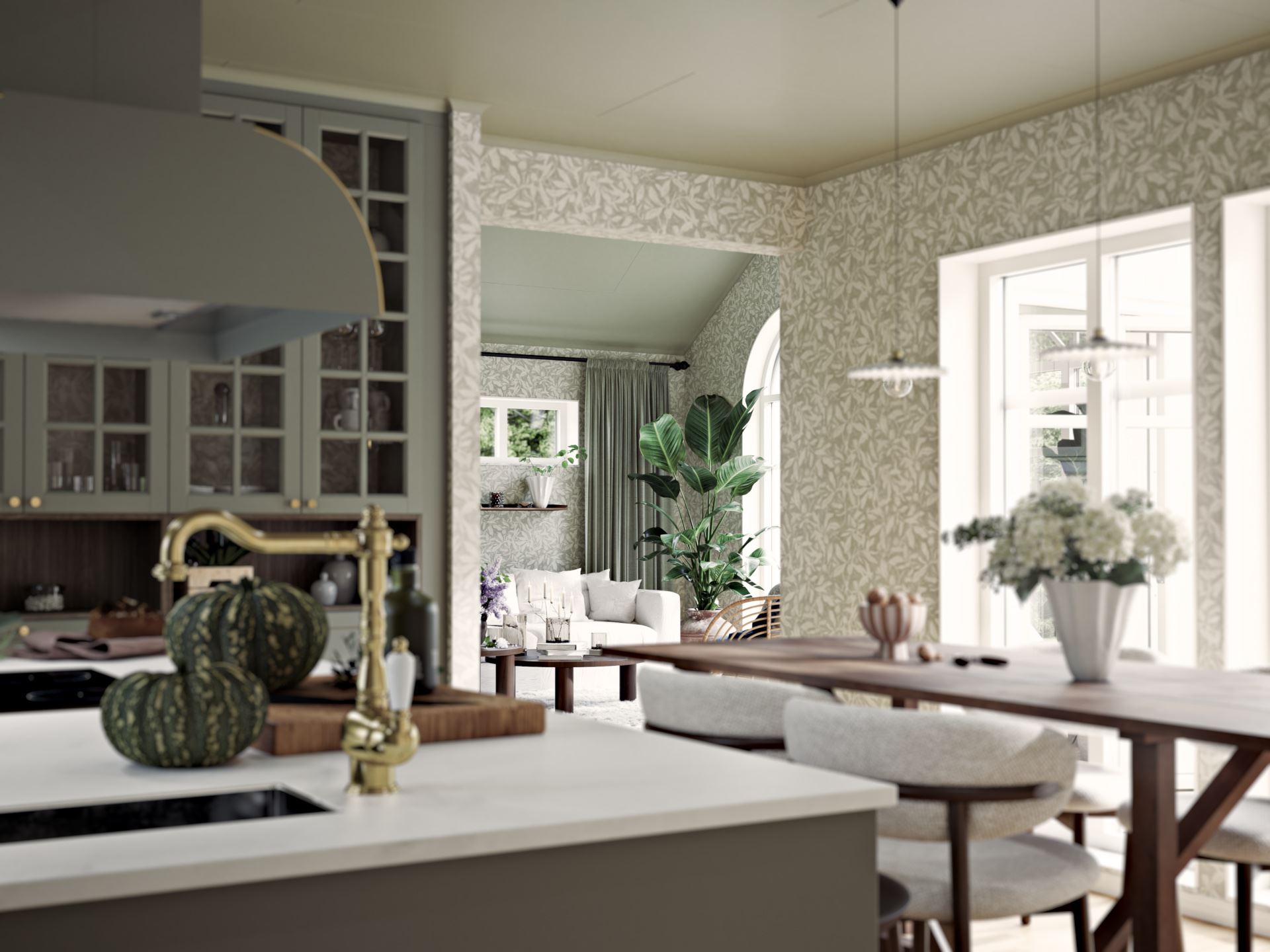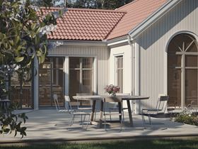 Pärldagg i lantlig stil bjuder på en tidlös gestaltning som får det lilla extra genom sina vackra halvmånefönster. Som kronan på verket toppar de den generösa fönstersättningen – vackert spröjsad, såklart. Färgsättningen ger ett inbjudande intryck, där fasadens stående träpanel i en lite varmare vit nyans kombineras på ett utsökt vis med grågröna fönster och ett klassiskt tegelrött tak.