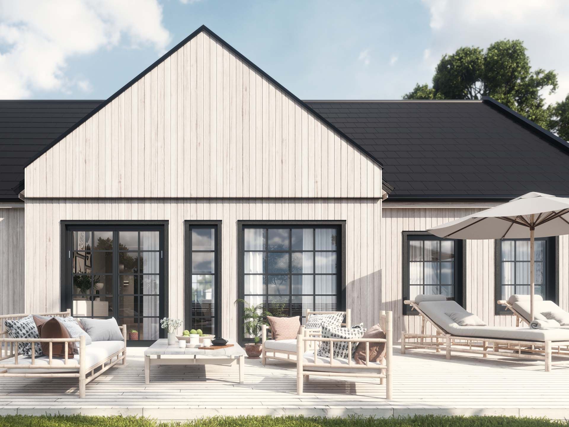 Industrifönster och svarta plåtdetaljer för tankarna till de gamla industribyggnaderna med sina strama raka linjer där svärtan ger vacker kontrast mot fasadens ljusgrå stående panel. Med vår tolkning av den industriella stilen får du mycket ljusinsläpp och öppna ytor.