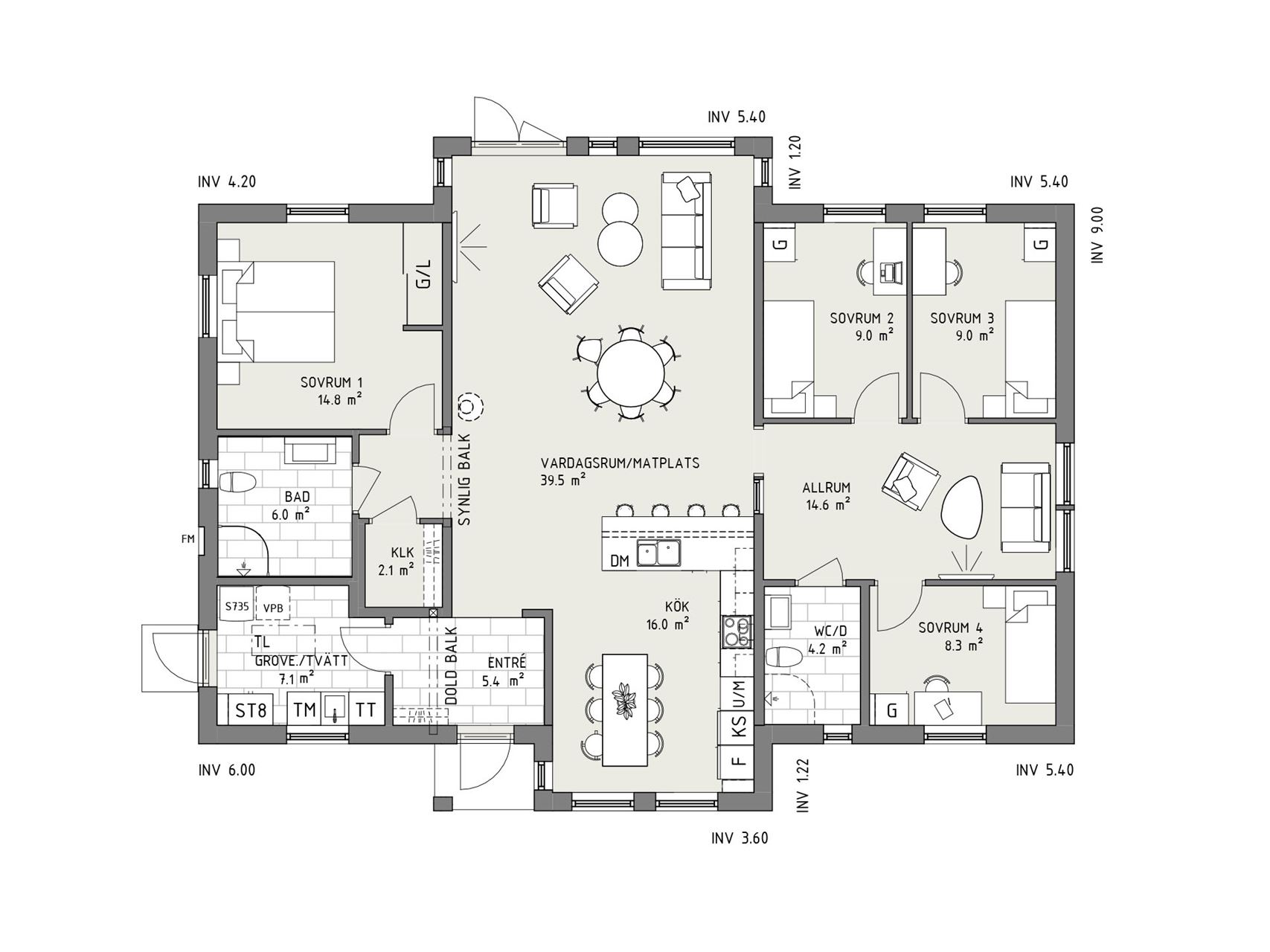 På ena sidan av husets härlighet ligger tre sovrum grupperade runt ett trivsamt allrum samt toalett med dusch. Kanske blir det barnens egen domän? Kanske vill du driva verksamhet hemma? Polstjärna är ett hus med många möjligheter. Master bedroom hittar vi istället på andra sidan av huset, i gott sällskap av badrum och klädkammare. Husets fina tvättstuga hittar vi i anslutning till entrén.