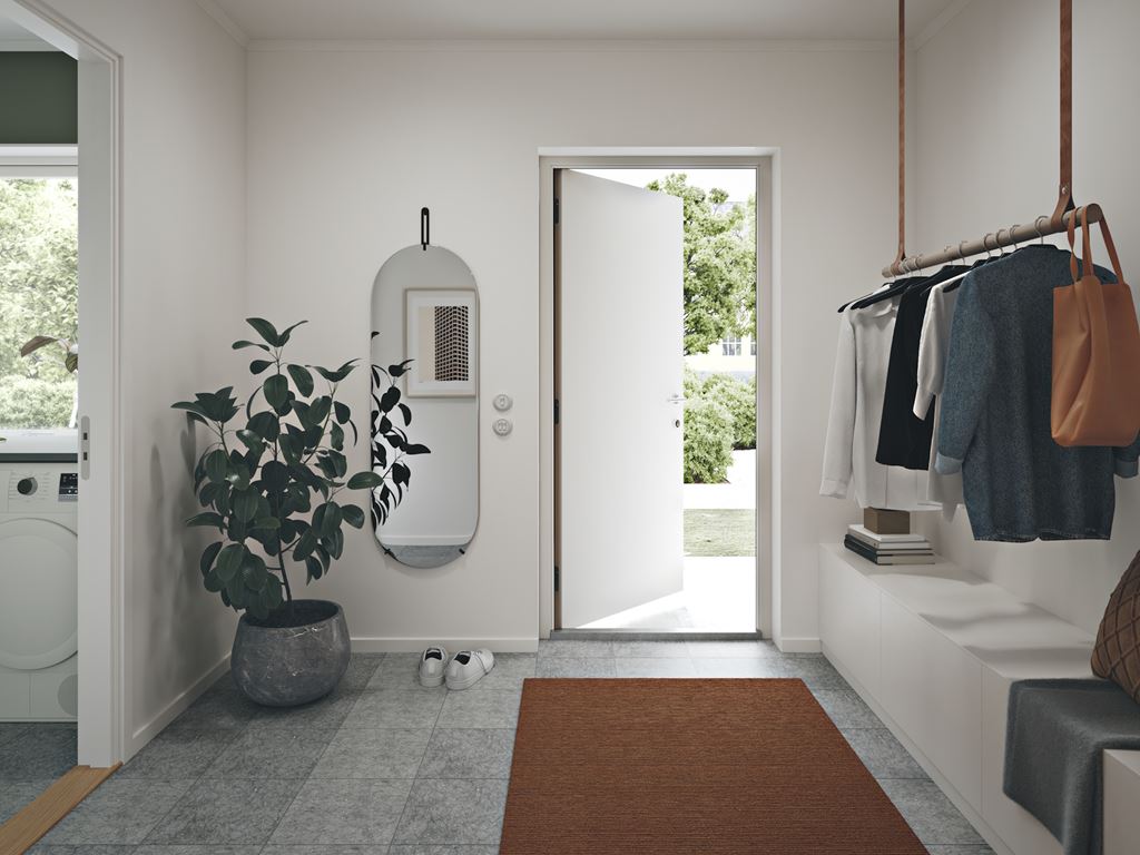 Precis som polstjärnan är en mittpunkt på himlen har det här huset en härlig mittpunkt i form av sin stora gemensamma umgängesyta, som sträcker sig från entrén tvärs igenom husets bredd och skjuter ut mot trädgårdssidan. Redan i entrén har du en inbjudande siktlinje mot trädgårdens uteplats. Men här finns också ett kök i sin egen rätt, där du samtidigt har fin kontakt med gatan. Köket är dessutom öppet mot vardagsrummet, inramat av en trevlig bardisk.