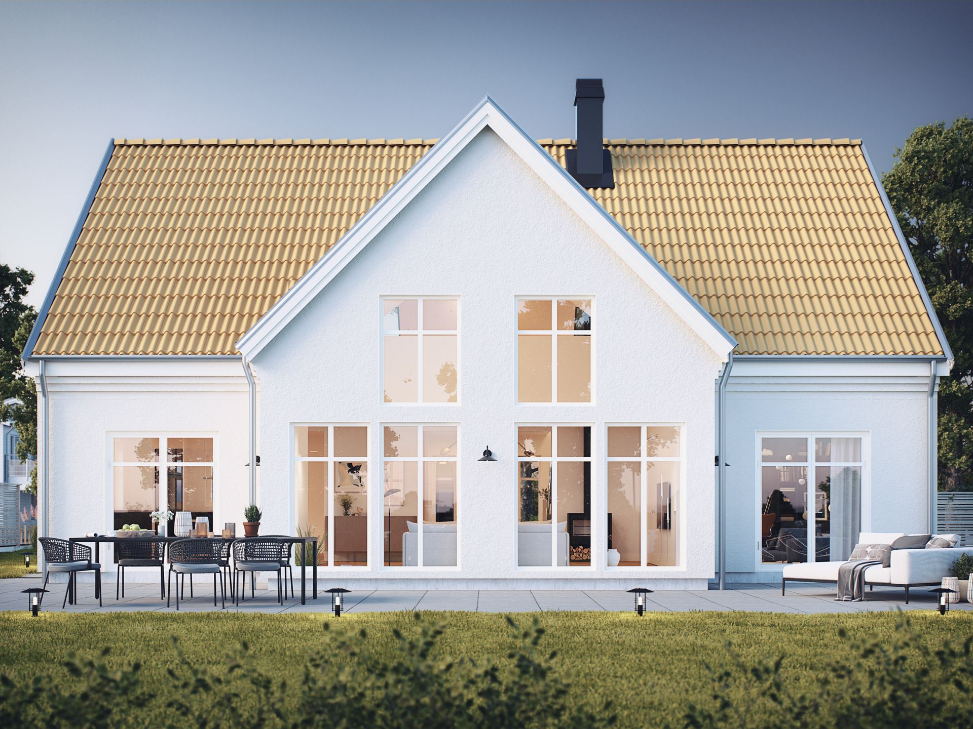 I lantlig stil blir Sandsten ett vackert hus med klassiska stildrag som lämpar sig perfekt för en naturnära miljö. Huset har vitputsad fasad, havregula takpannor och symmetrisk fönstersättning som får det att smälta in i en lantlig kontext på ett självklart sätt. Ett stilval för dig som önskar ett modernt boende med rötter i den skånska, lantliga exteriöra traditionen