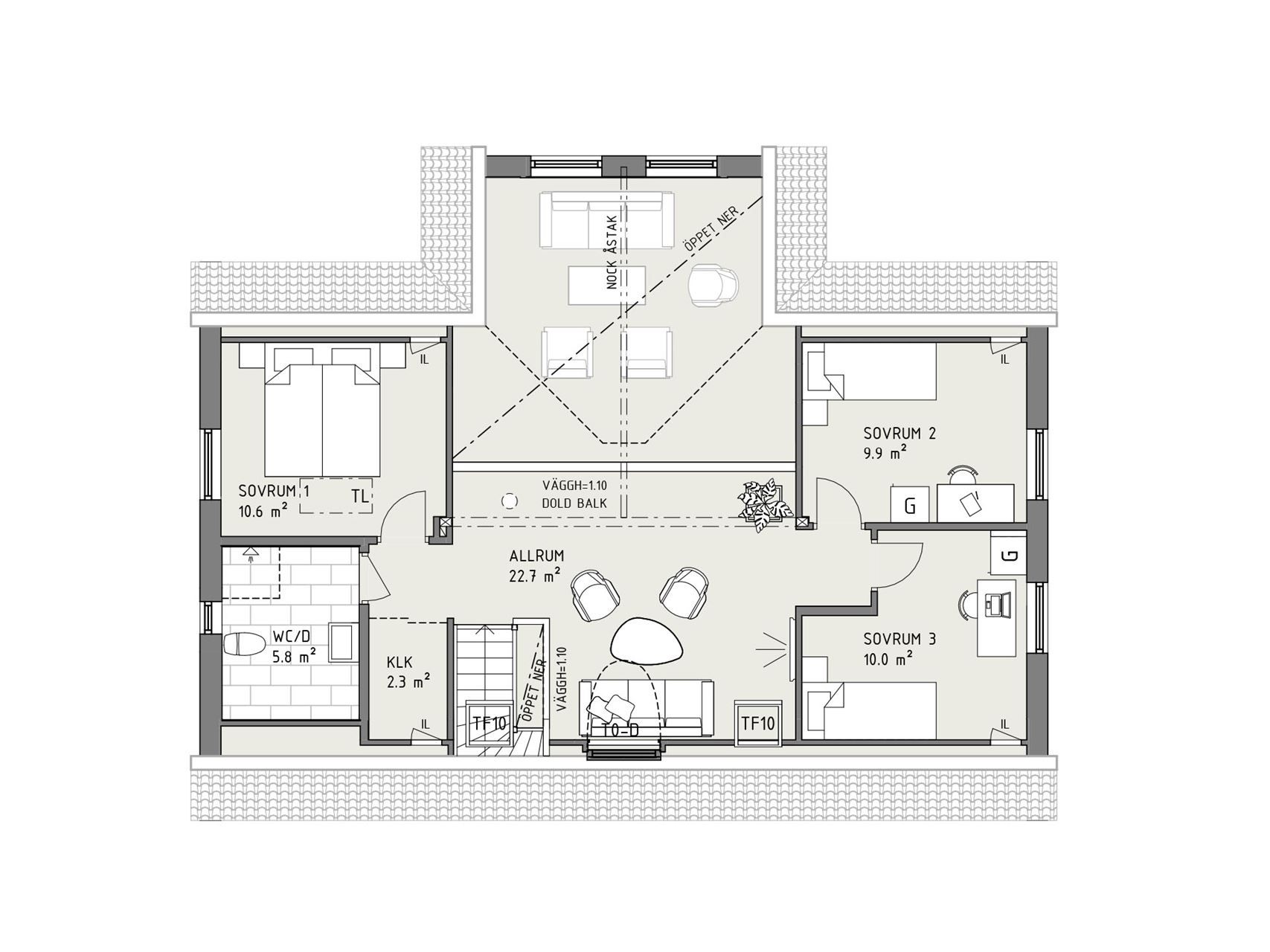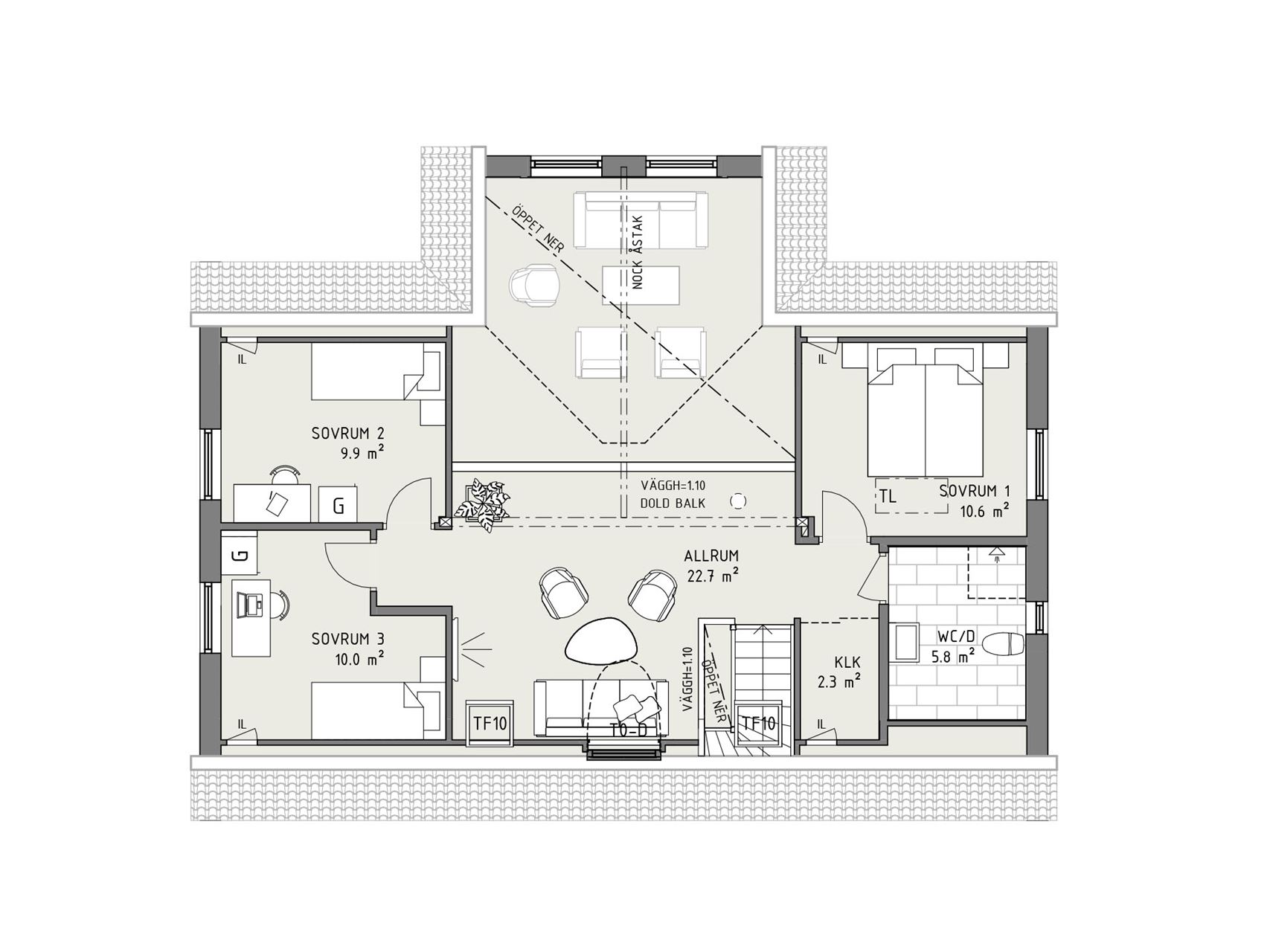 En trappa upp möts vi av ett ljust och trevligt allrum, samt husets tre sovrum, toalett med dusch och en praktisk klädkammare. På tal om praktiska detaljer, så finns det förstås även ett badrum på entrévåningen – liksom en fin tvättstuga med groventré.