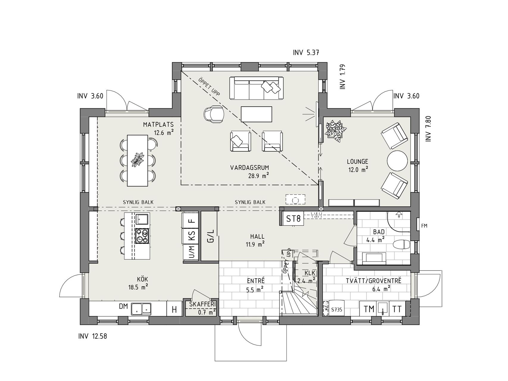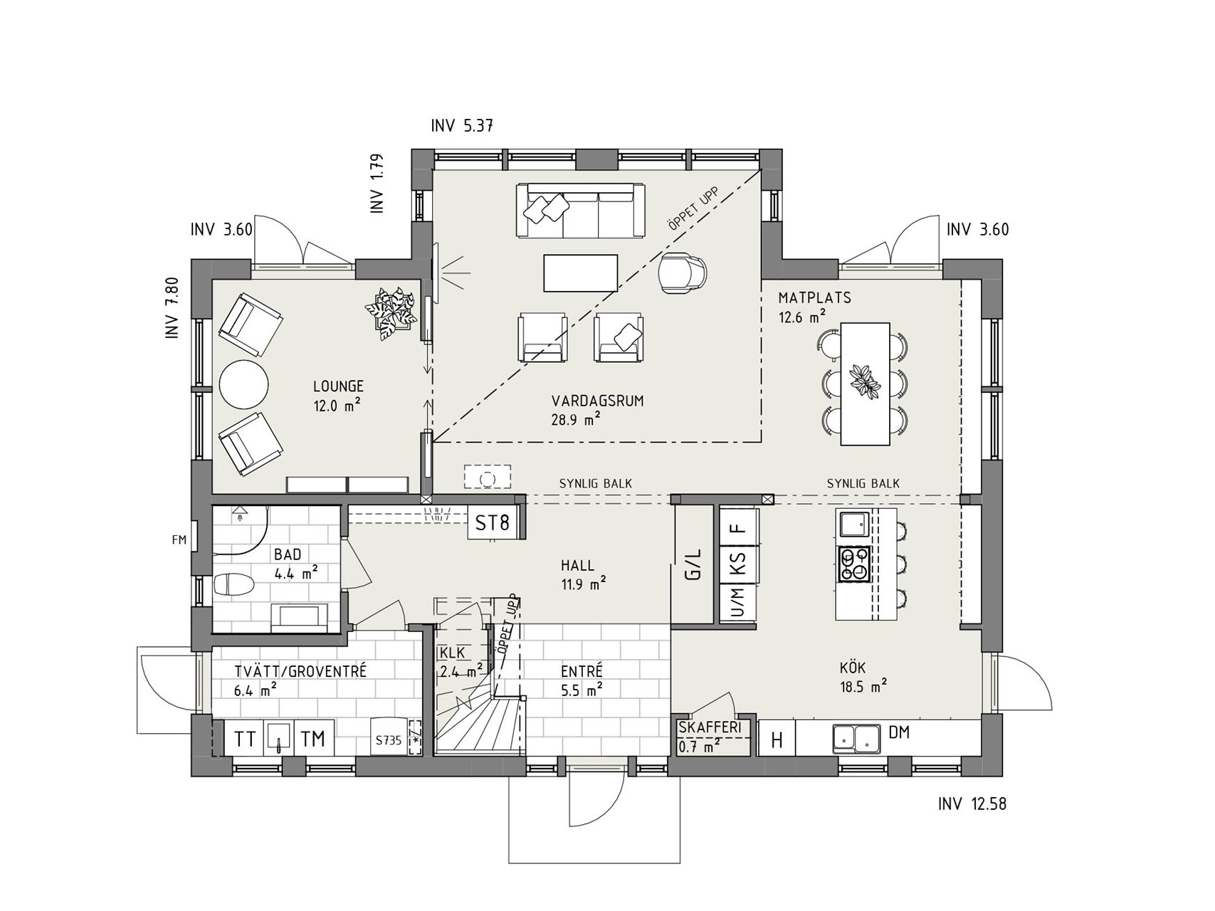 Sandsten välkomnar oss med en rymlig entré med en fin siktlinje rakt in i hemmets sociala härlighet. En väldigt ljus och inbjudande öppen planlösning, där både kök, matplats och vardagsrum ändå har sin egen identitet. Vardagsrummets takhöjd blir extra generös då det är öppet upp till nock, och stora fönster låter ljuset flöda. Vid sidan av vardagsrummet finns också ett extra rum, som passar lika bra som lounge, bibliotek – eller kanske ditt hemmakontor.
