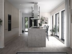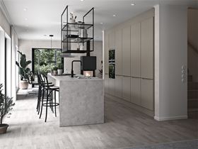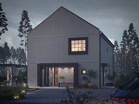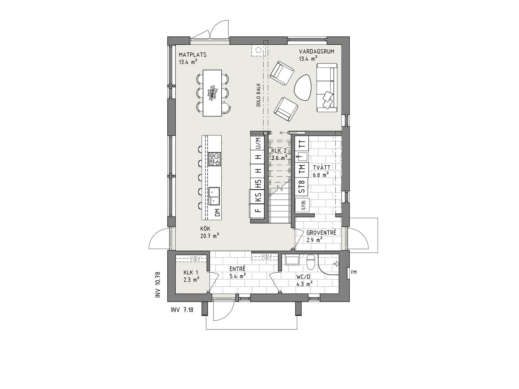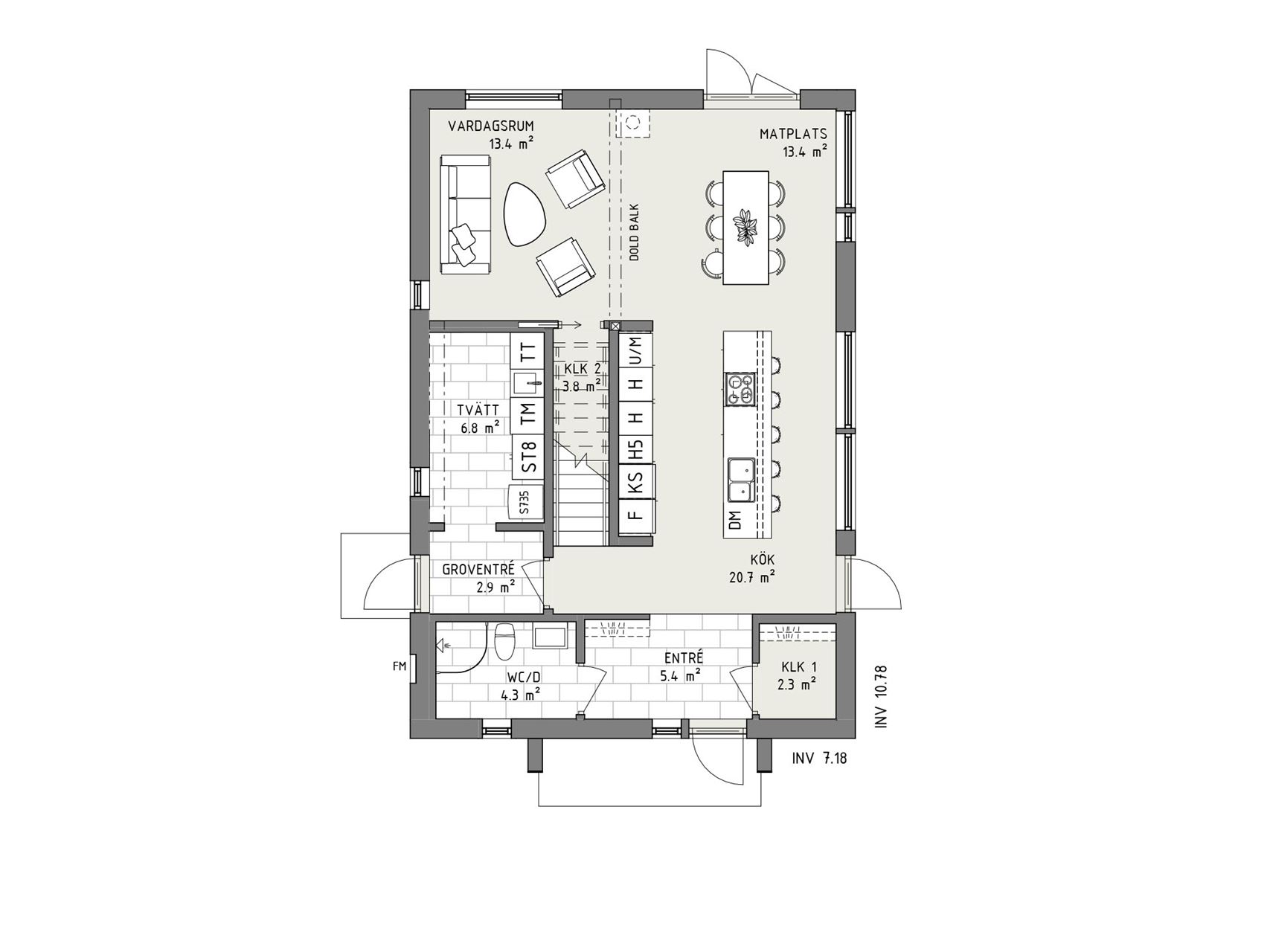 När du kliver innanför dörren möter du ljuset från de generöst uppglasade partierna i motsatta gaveln. I entrén finns ingång till toalett med dusch, liksom en välplacerad klädkammare, och rakt framför dig väntar kök, matplats och vardagsrum i en öppen planlösning. Den inbjudande köksön blir en given mittpunkt i tillvaron, och flera altandörrar ger smidig access till uteplats och trädgård. Ett praktiskt plus är också den rejäla tvättstugan med groventré.