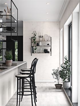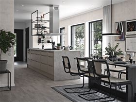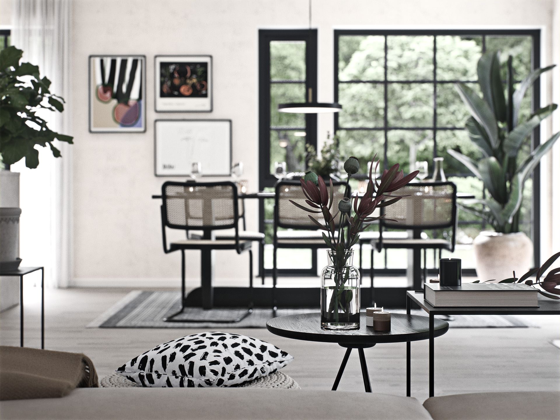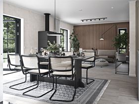 Redan från den gavelställda entrén ser du den generösa, småspröjsade inglasningen i motsatt gavel. Den öppna, luftiga planlösningen mellan kök, matplats och vardagsrum gör det enkelt att umgås och få överblick.