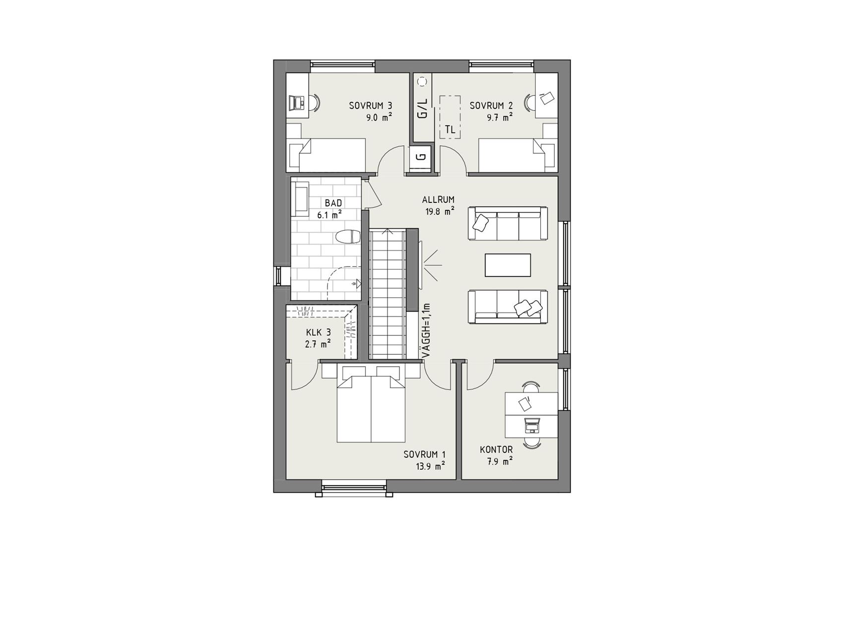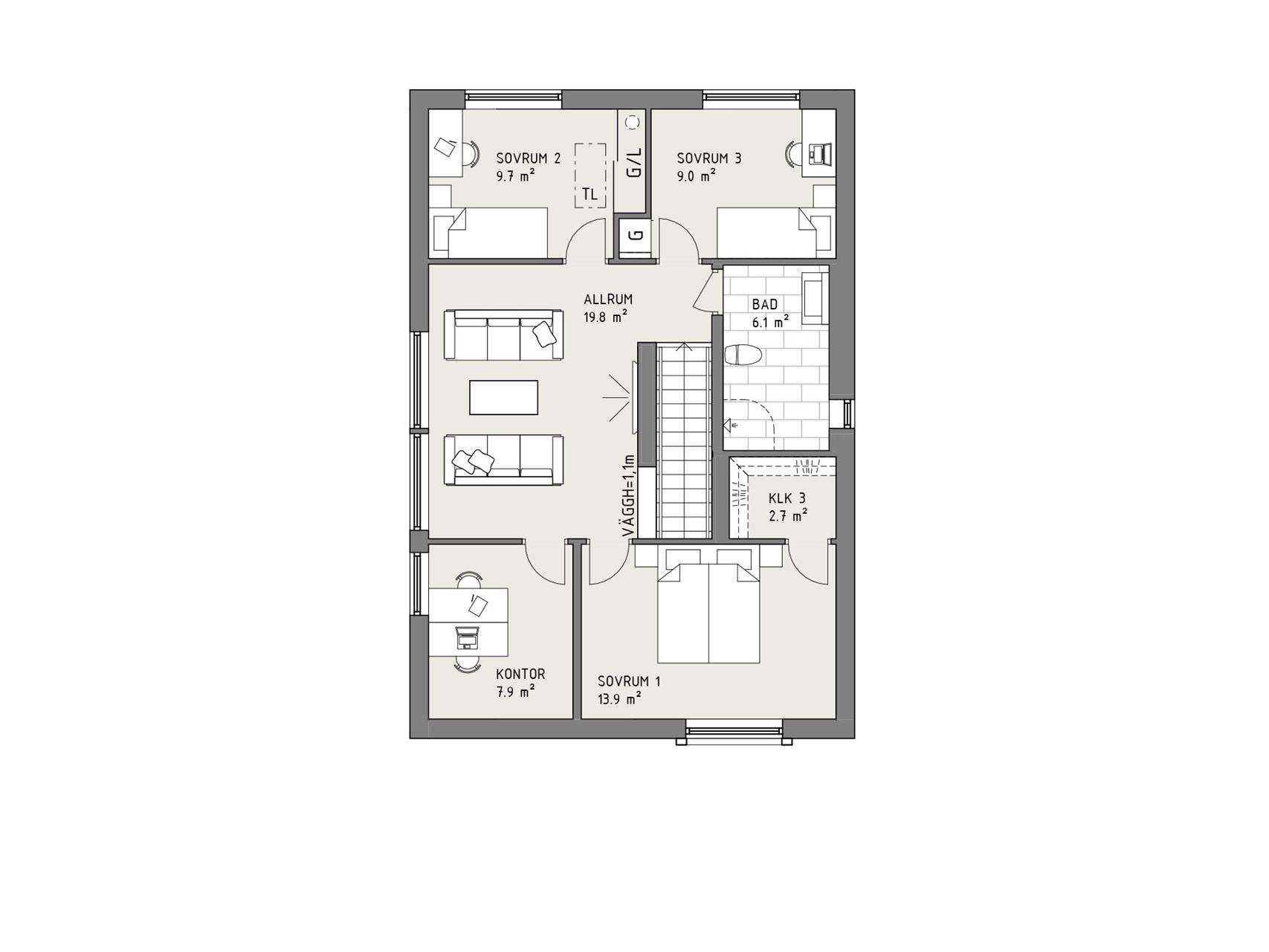 På övervåningen väntar familjens mer privata zoner, de når du via den snygga raka trappan som ligger i anslutning till entrén och groventrén. Här finns ett trevligt allrum, badrum, master bedroom med egen klädkammare och ytterligare tre sovrum. Det mindre av dem kan med fördel användas som hemmakontor.