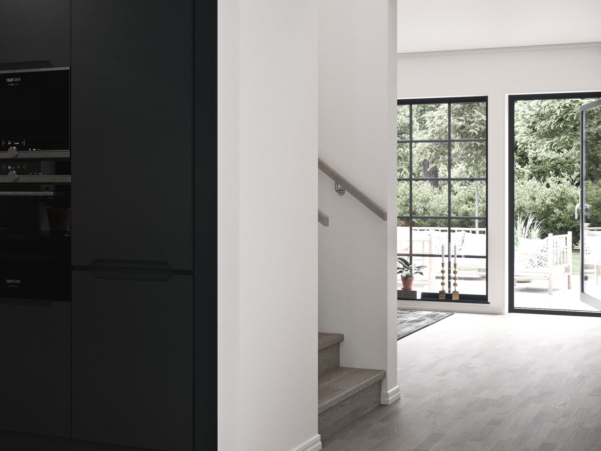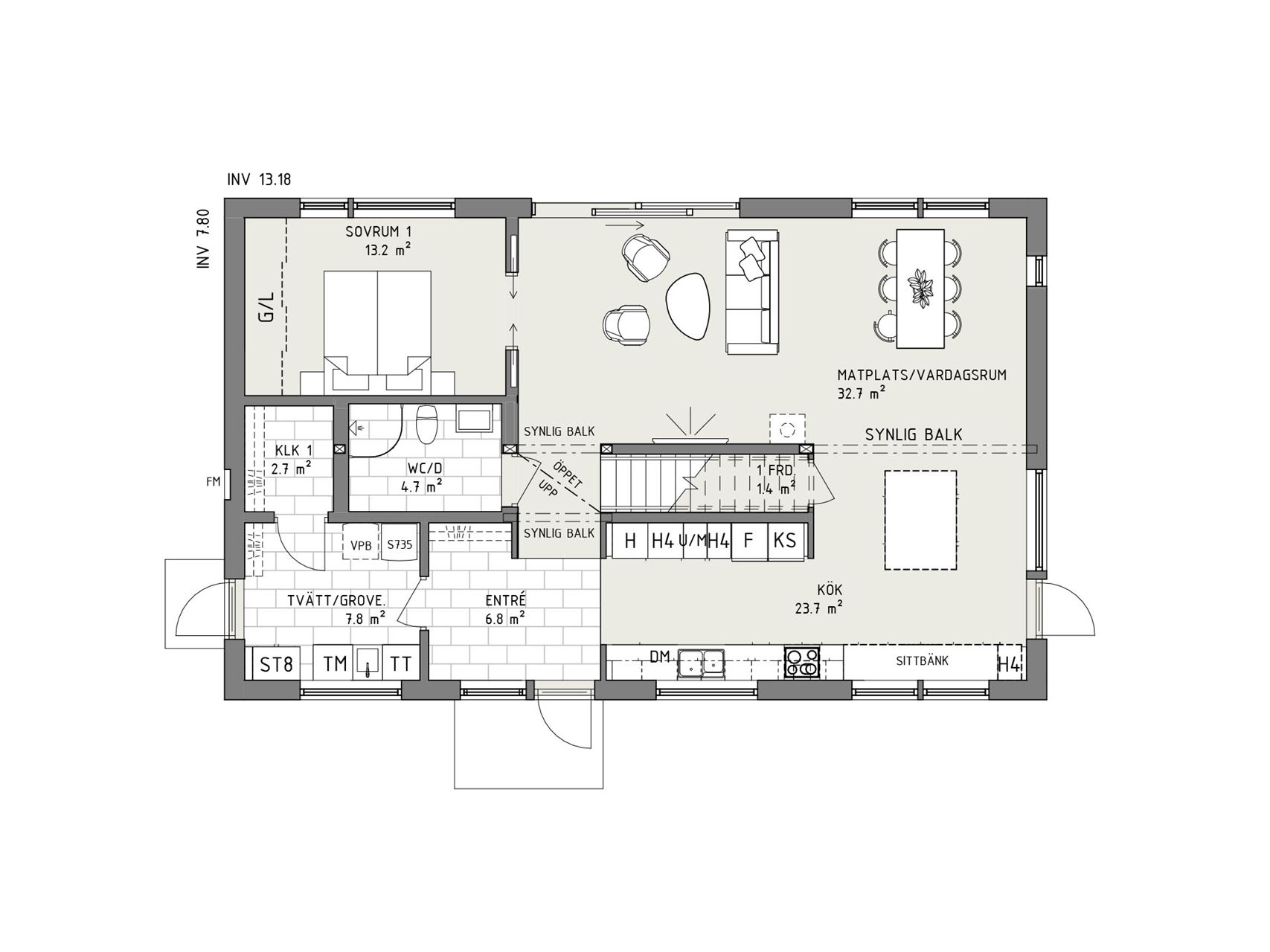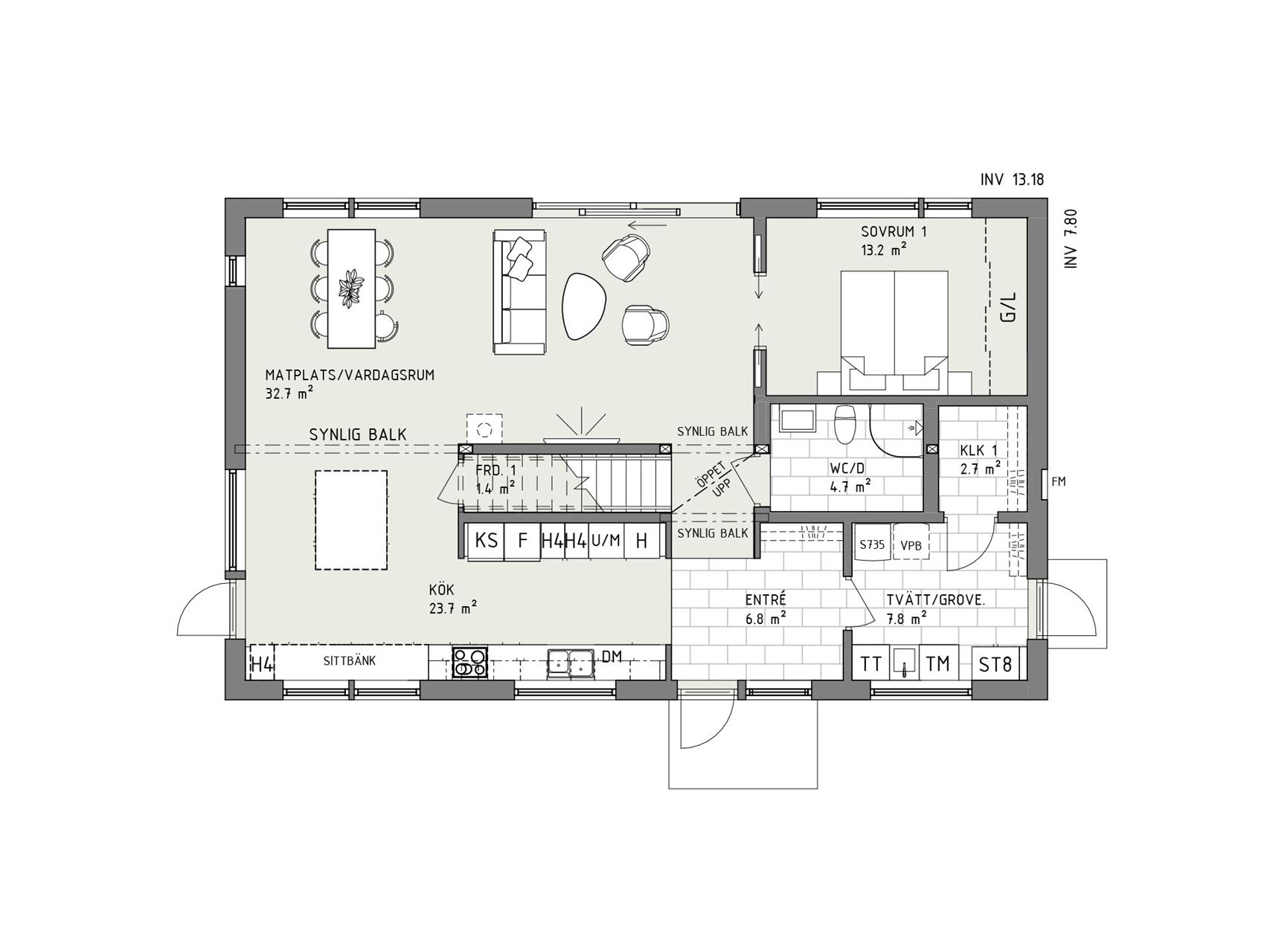 I den ljusa entrén kan du antingen välja att svänga in i köket eller kliva rakt in i den öppna ytan för matplats och vardagsrum. En stor del av hemligheten bakom Skiffers trivsamhet ligger i det naturliga flödet mellan rummen som skapas kring den integrerade raka trappan upp till övervåningen – som dessutom ger huset en effektfull touch. Här på entrévåningen finns även ett generöst sovrum, liksom praktiska guldkorn i form av bra förvaring, tvättstuga med groventré och toalett med dusch.