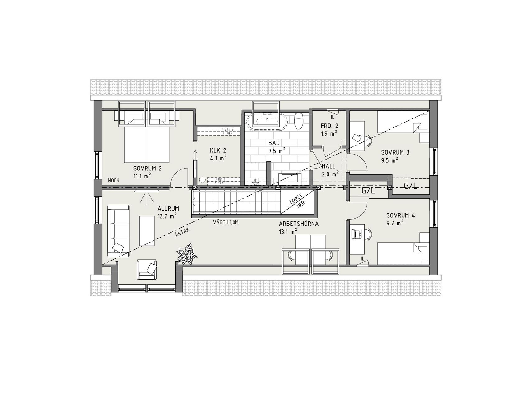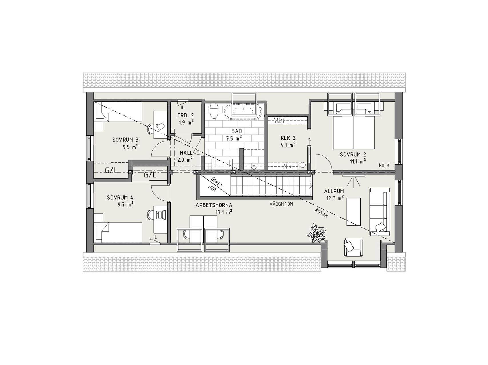 På övervåningen är det öppet upp i nock, med 45° taklutning – vilket skapar en härligt luftig känsla. Övervåningens allrum får det lilla extra tack vare husets takkupa, och erbjuder även plats för en trivsam arbetsplats. Här uppe finns även tre sovrum, varav ett med egen walk-in-closet, ett rejält badrum och ett praktiskt förråd. Det här är ett hus som uppfyller många nutida husdrömmar.