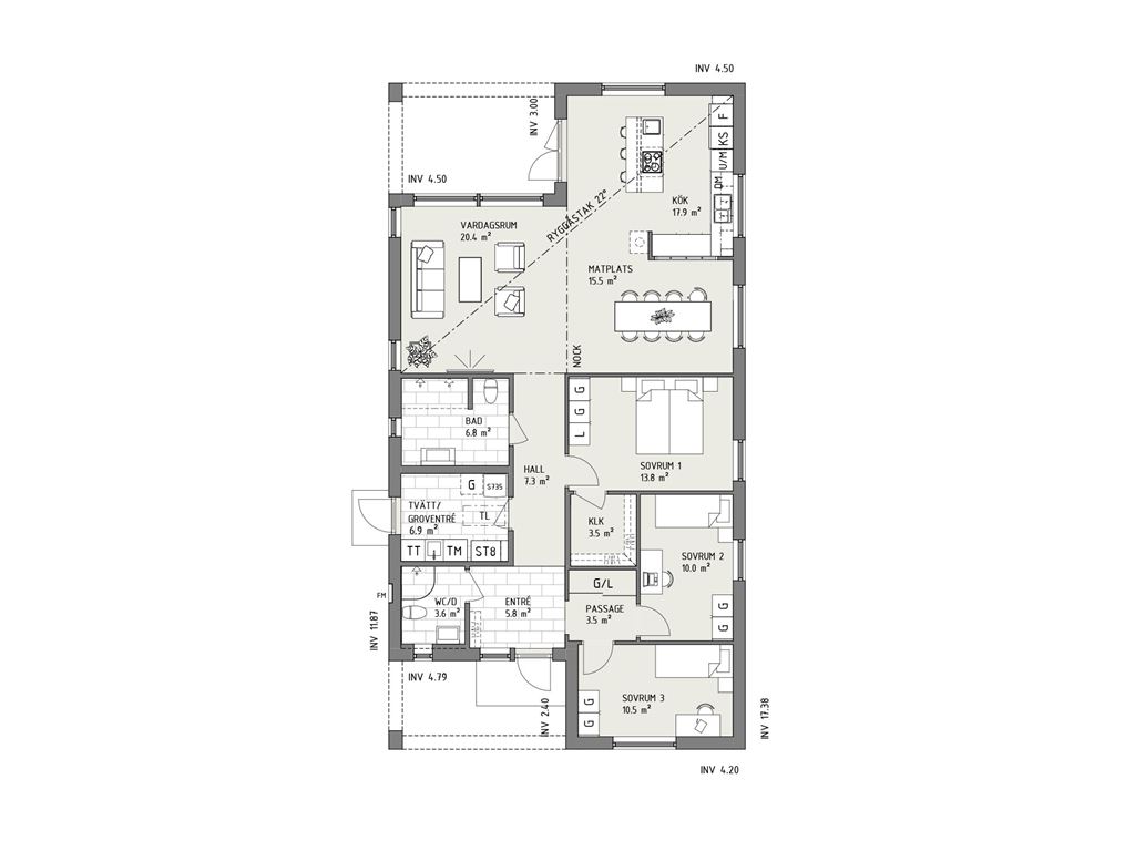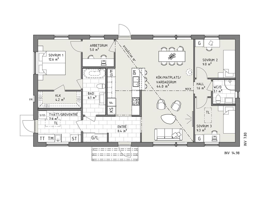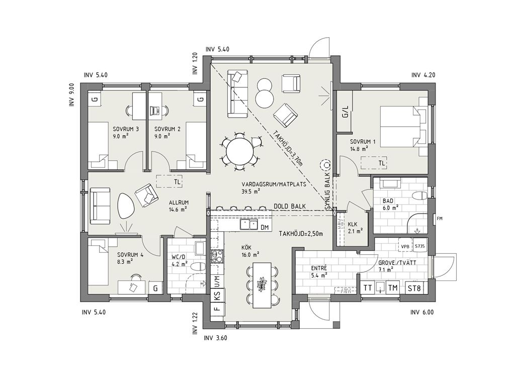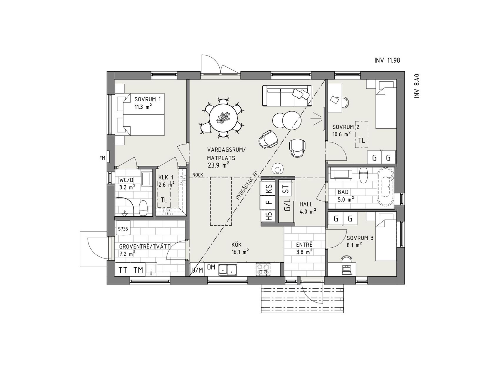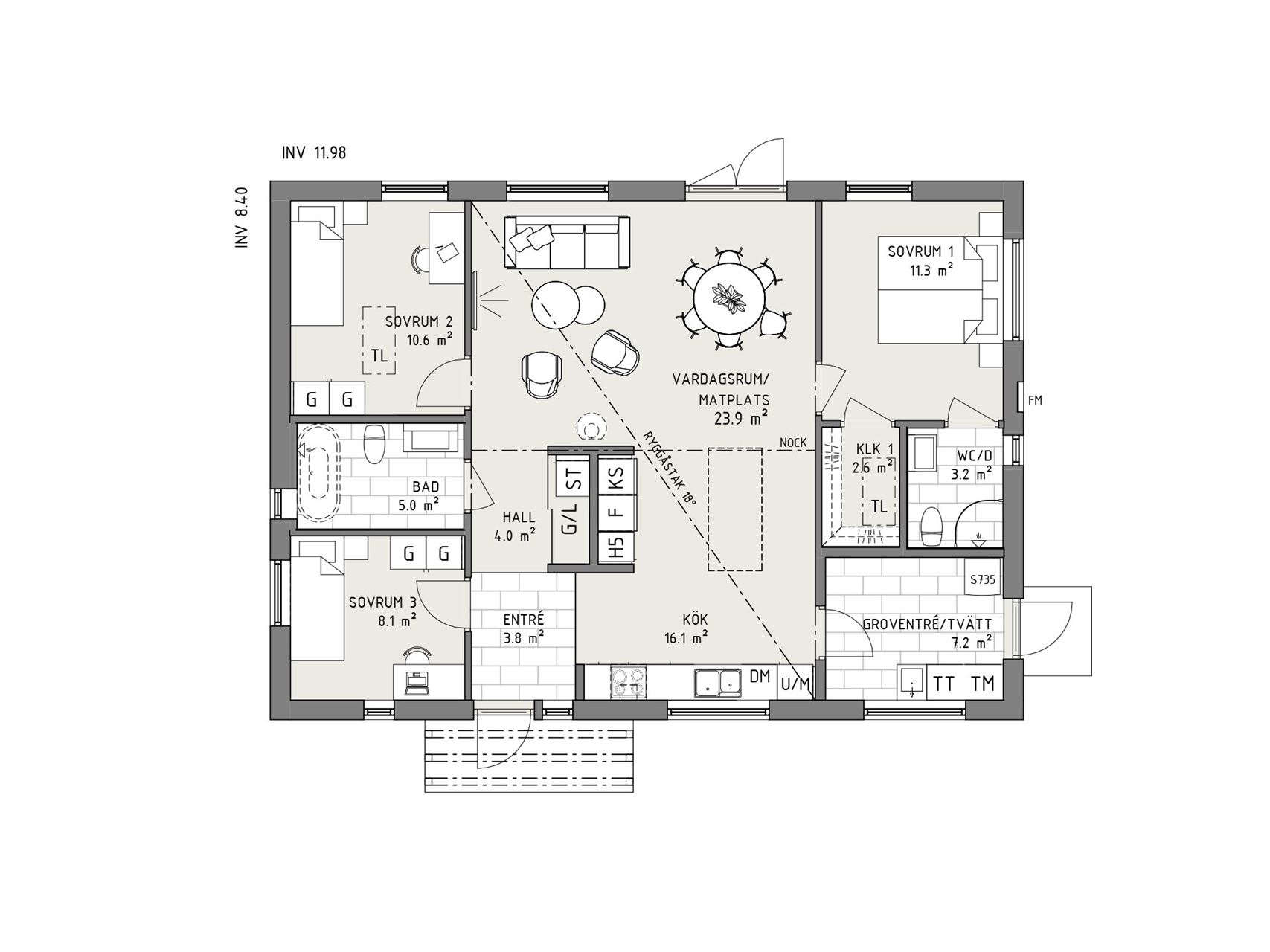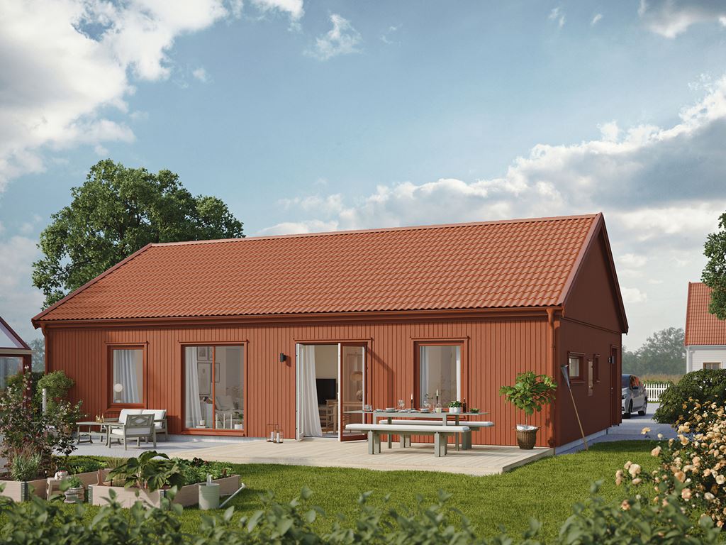 Låt dig inte luras av siffran: Smart 100 är ett smart planerat enplanshus med mycket fin funktion per kvadratmeter. Tre sovrum, där master bedroom har egen walk-in-closet och egen toalett med dusch, en inbjudande öppen planlösning för kök och vardagsrum – med mera.
