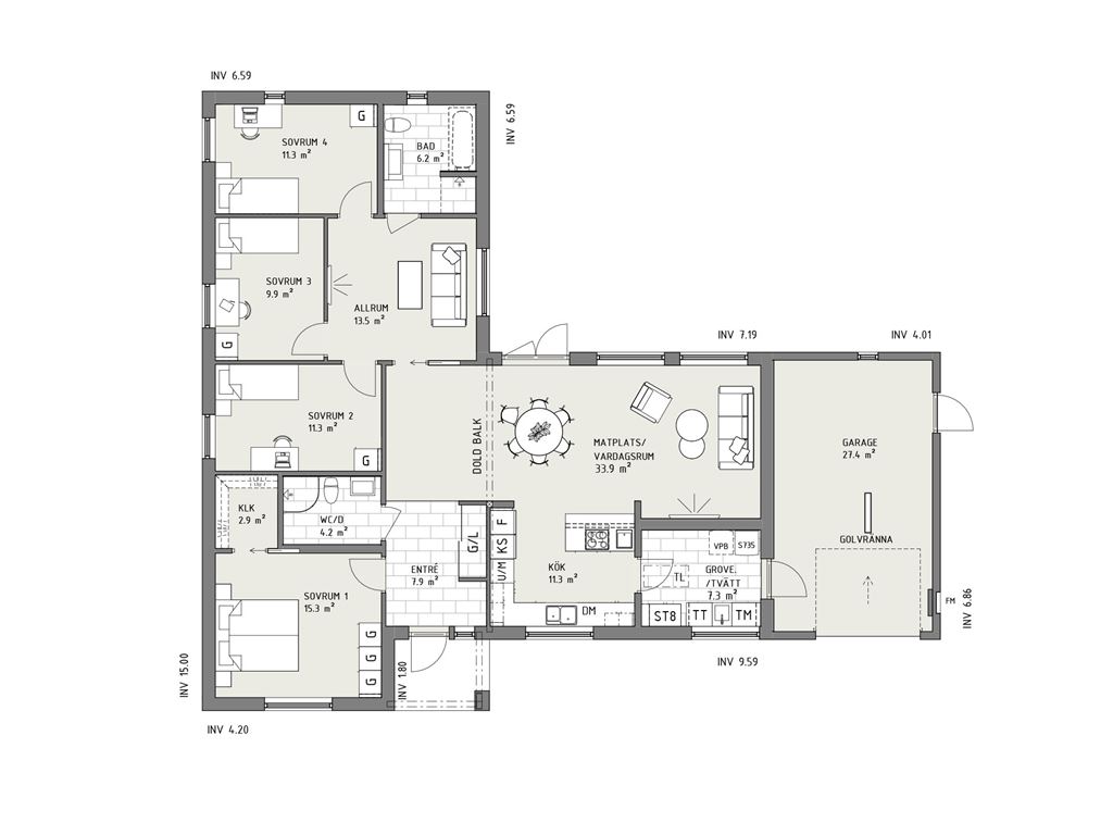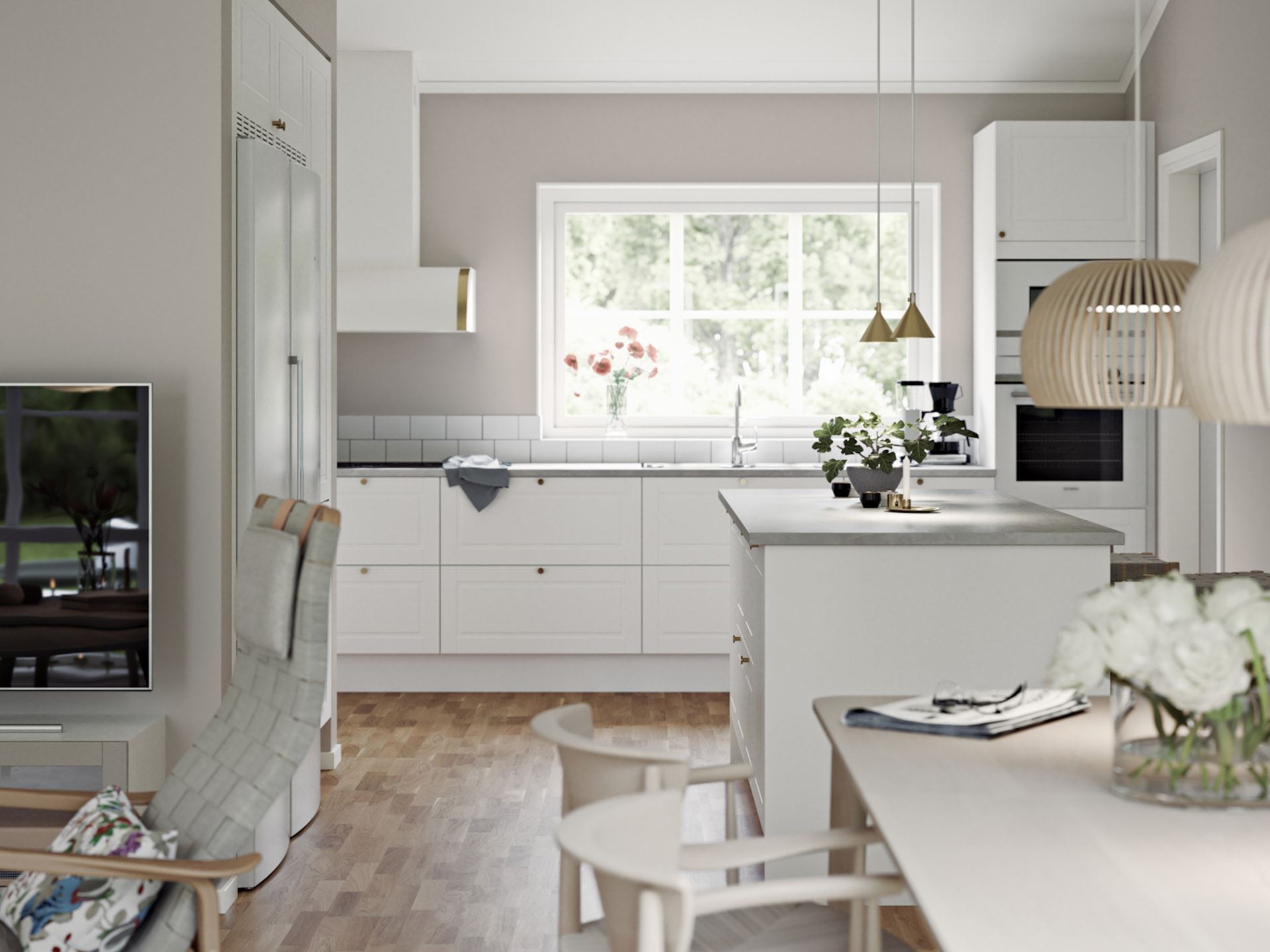 Redan i entrén möts vi av en härlig siktlinje rakt igenom huset. Här kan vi antingen fortsätta in i den ljusa öppna ytan för vardagsrum och matplats, och kanske vidare ut i trädgården? Eller så kan vi smita direkt in i köket, och därifrån vidare ut i tvättstugan med groventré. I köket finns ett perfekt placerat fönster så att du kan diska med utsikt och samtidigt spana ut mot entrésidan och se när gästerna anländer.