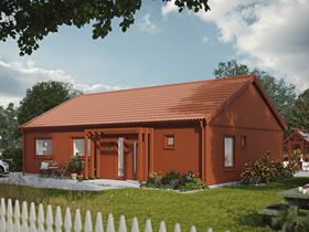 I modern stil får Smart 100 en monokrom röd färgsättning som förhöjer de rena linjernas elegans. Här ser vi en härligt enkel och avskalad arkitektur med nätta takfötter, ospröjsade fönster och stående funkispanel. På entrésidan dras blicken till husets signum: den stilrena pergolan som ramar in och definierar entrén.