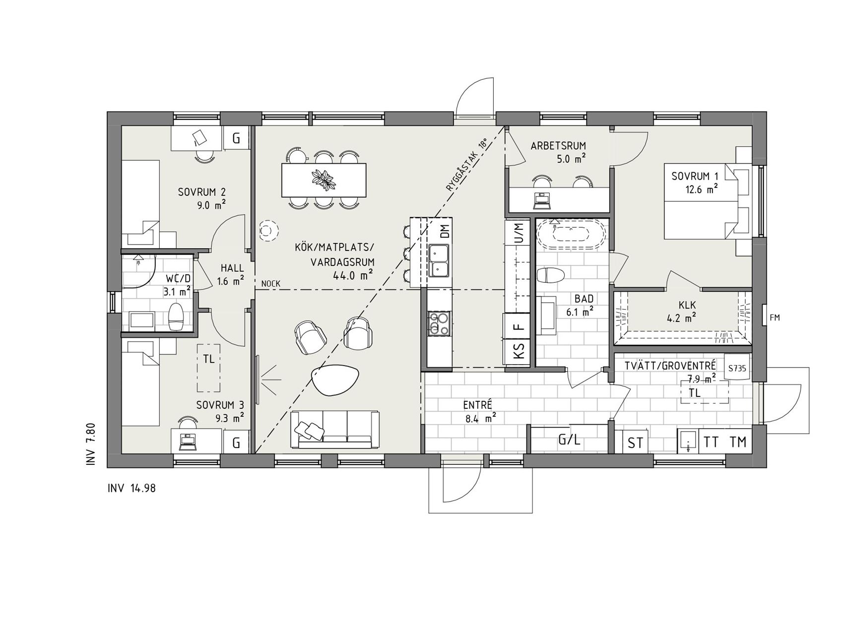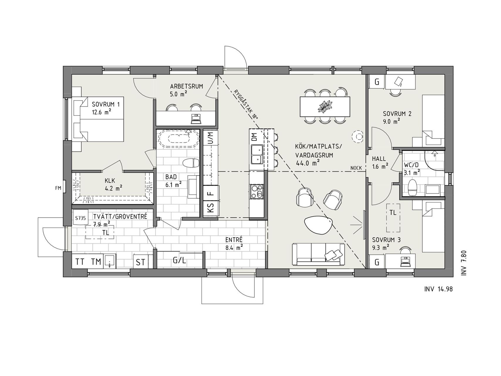 Redan i den rymliga entrén fångas vi av siktlinjen rakt genom huset. I husets mitt trivs det sociala livet i en ljus öppen planlösning där kökets placering gör att rumskänslan ändå är närvarande. På var sin sida om den väntar husets mer privata delar. Dels barnens domän med två sovrum och toalett med dusch. Dels det luftiga föräldrasovrummet, som nås via genomgångsrummet som passar utmärkt som hemmakontor – eller kanske som första rum för familjens minsting? Lika smarta fördelar är det fina klädvårdsutrymmet med groventré och badrummets extra ingång som skapar hotellkänsla i föräldrasovrummet.