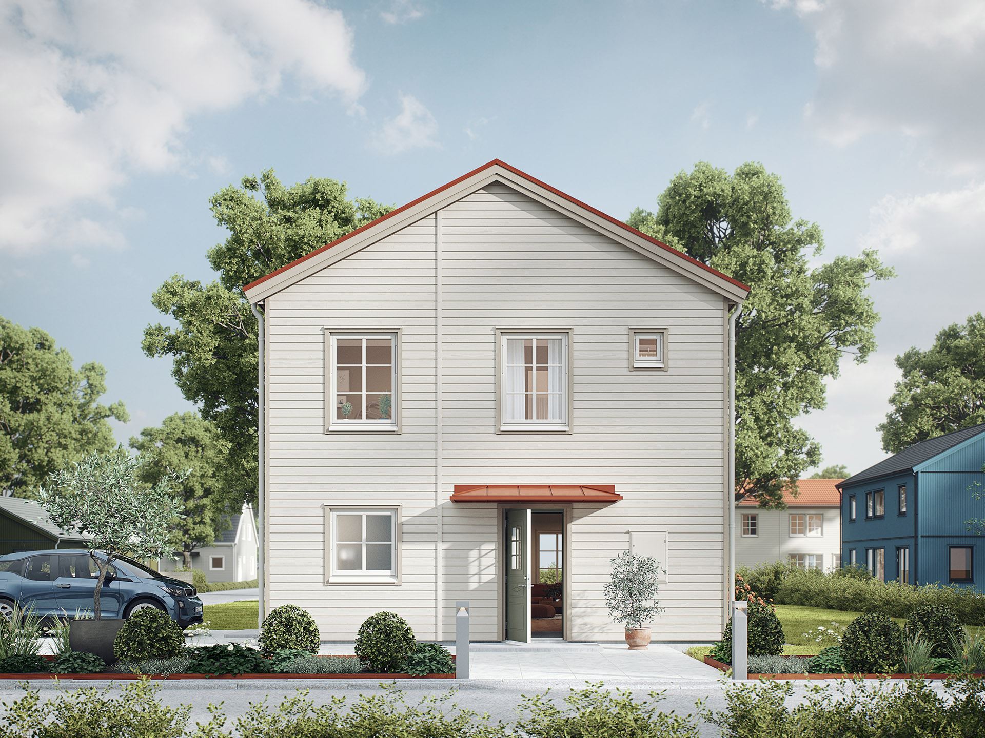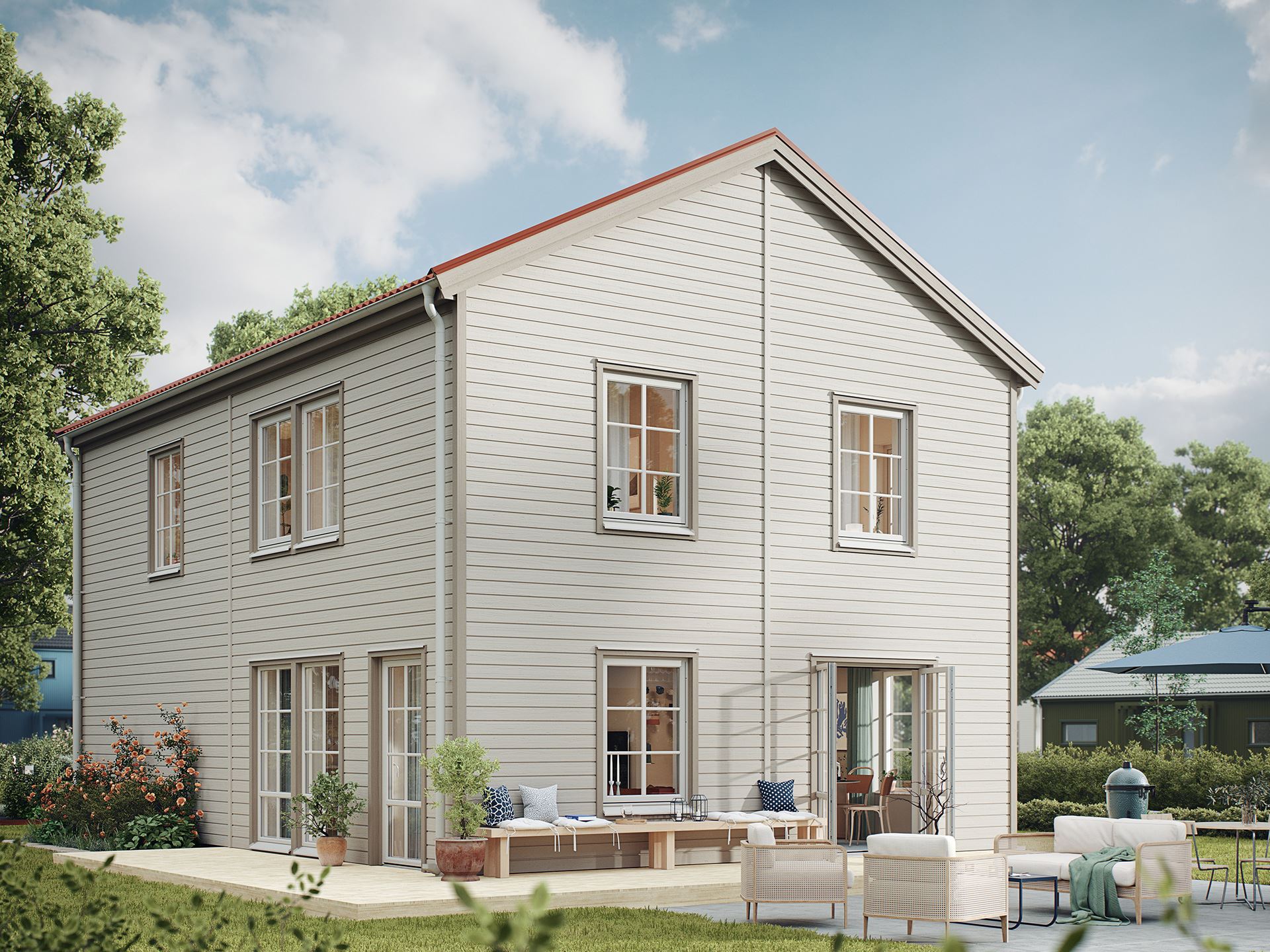 Smart 133 i lantlig stil bjuder på ett tidlöst välkomnande intryck. Här får fasaden en ljus greige kulör, kompletterat med knutar och detaljer i en något mer mättad nyans som går ton-i ton. Tillsammans med vita, vackert spröjsade fönster skapas en lugn och behaglig känsla. Alltsammans rundas av med ett klassiskt rött tak – och välkomnande gröna dörrar ger gestaltningen det lilla extra. Smart 133 i lantlig stil blir ett hem med en tidlös känsla, lika fint nu som i framtiden.