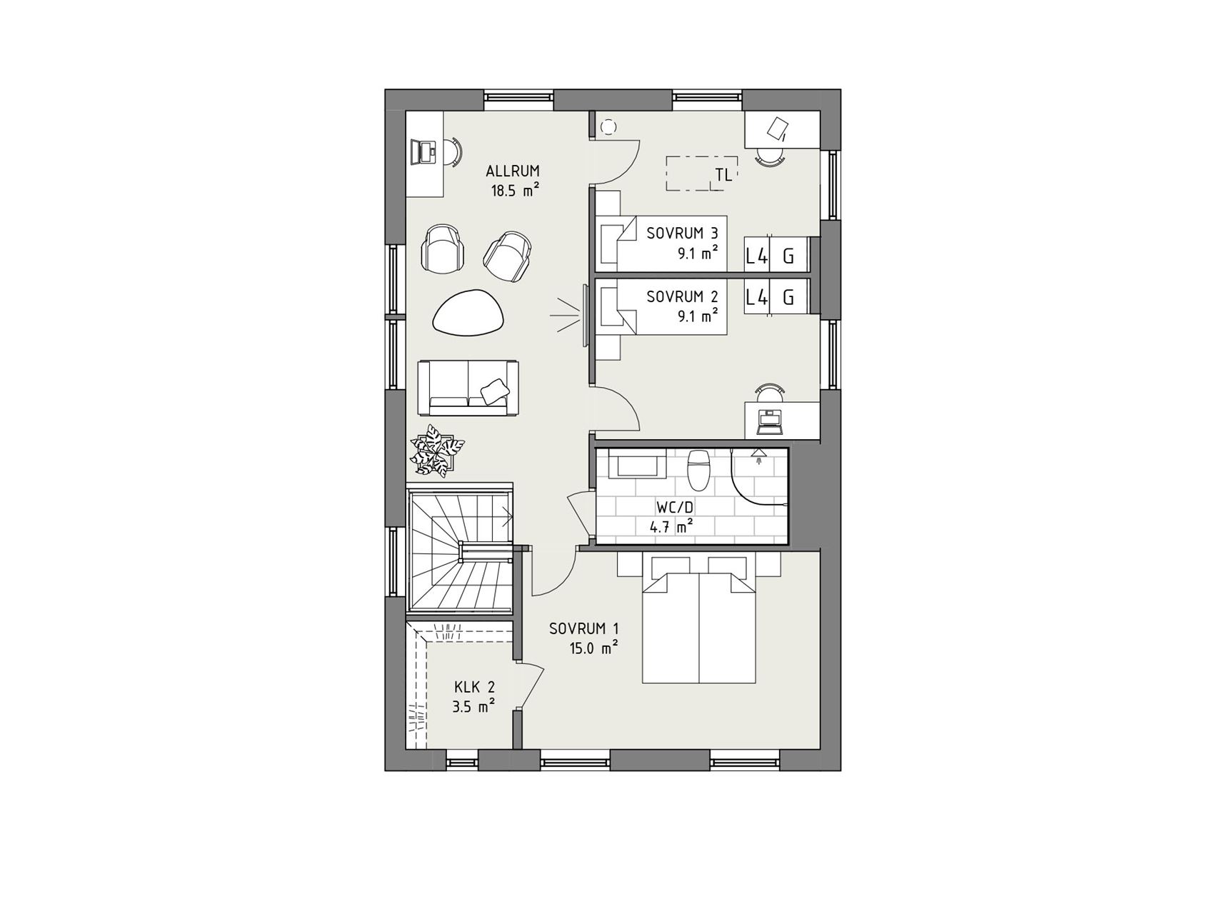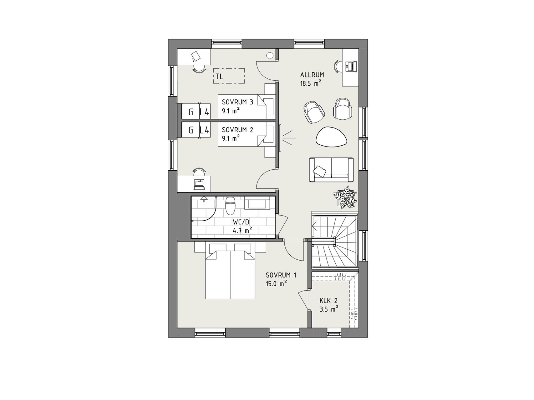 En trappa upp väntar tre trivsamma sovrum, varav ett rejält master bedroom med egen walk-in-closet som extra bonus. Den har dessutom ett fint litet fönster, vilket gör att du även kan ge den fler användningsområden. Kanske blir den ett första sovrum för familjens minsting? Ett inbjudande allrum med plats för arbetsplats och toalett med dusch ryms också här på övervåningen. Smart 133 checkar helt enkelt av många punkter på husönskelistan i ett smidigt, gavelställt format.