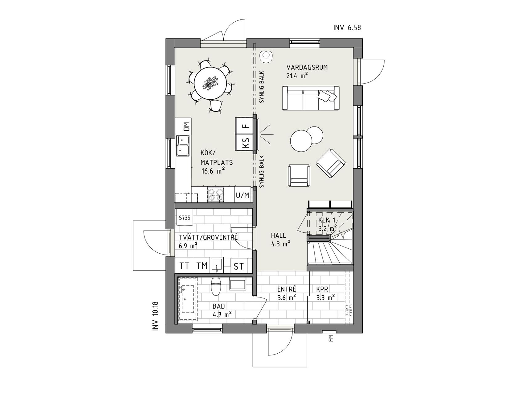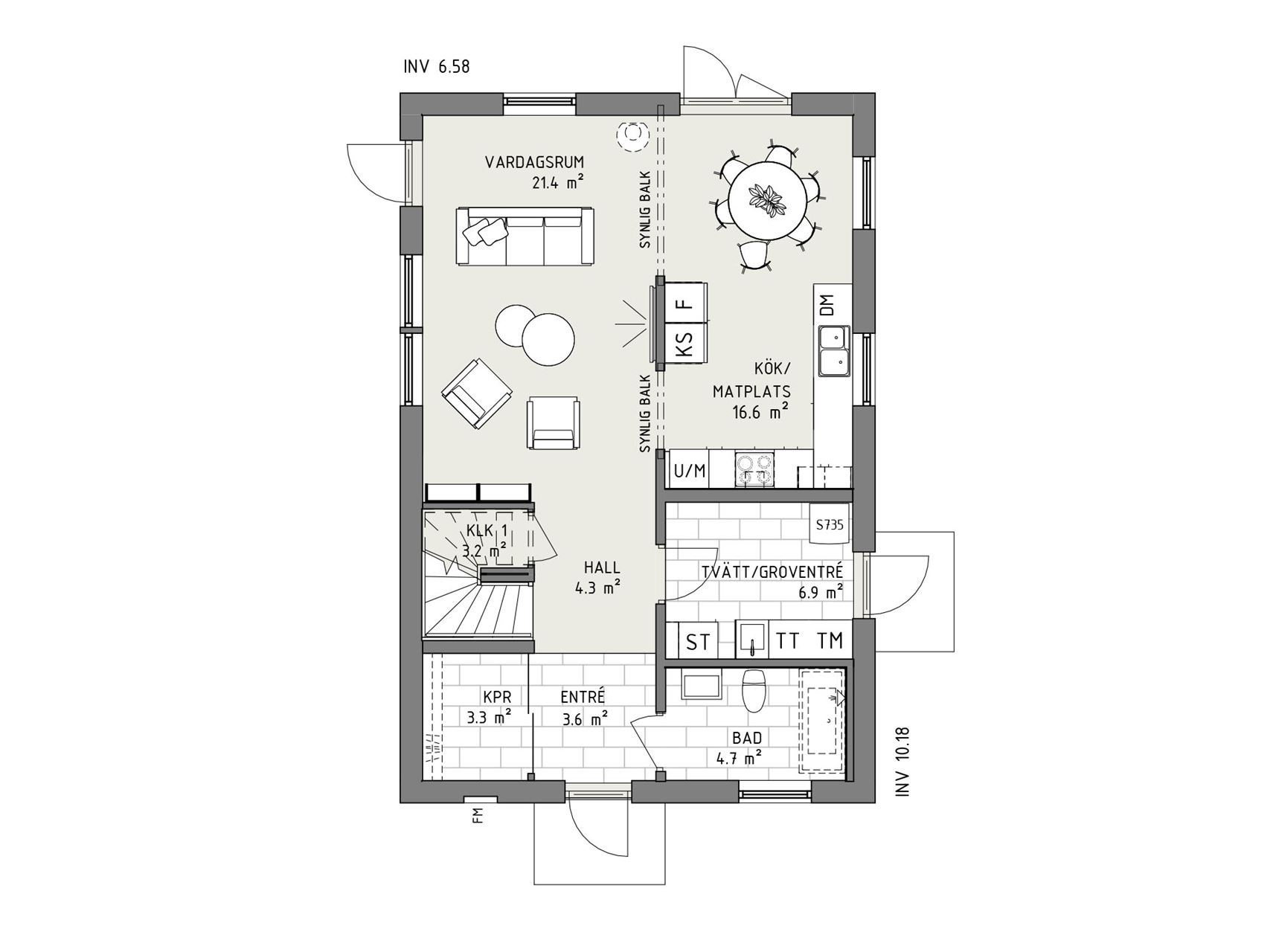 Smart 133 är ett trivsamt gavelställt tvåplanshus med en alldeles lagom öppen planlösning för kök, matplats och vardagsrum på entrévåningen och familjens privata domän med tre sovrum och ett fint allrum en trappa upp.