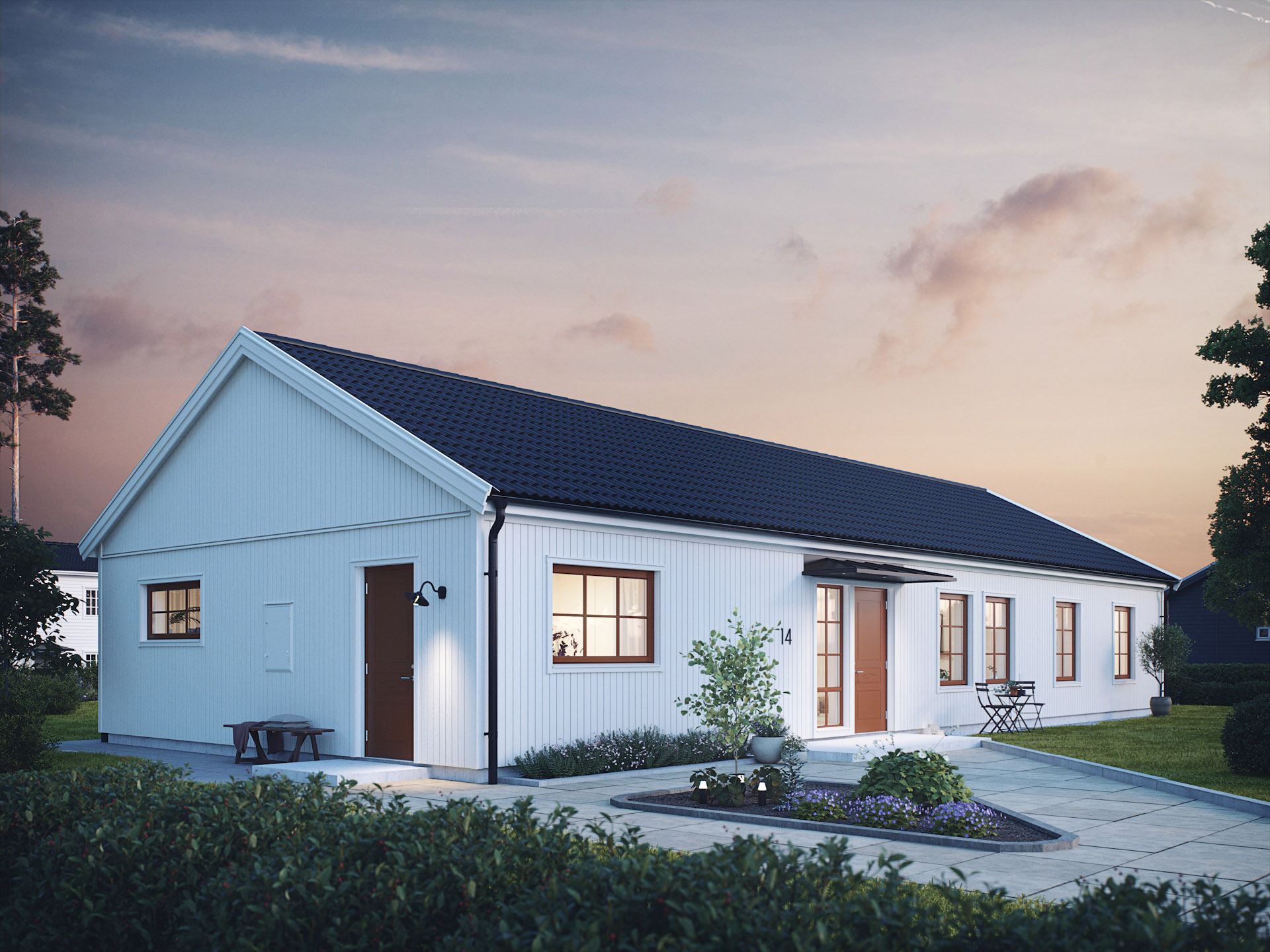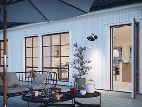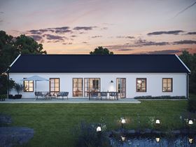 Här ser vi Smart 140 i sin lantliga stil. En ständigt aktuell husdröm med traditionell färgsättning och en mer vertikal fönstersättning med vackert spröjsade fönster som låter ljuset flöda in. Smart 140 erbjuds i två olika utföranden, var och en med sin egen fönsterkonfiguration som tillsammans med färgsättningen ger stora möjligheter att skapa olika uttryck. Huset i detta utförande klär också i en industriell kostym, medan den moderna versionen med stora fönster utan spröjs i sin tur skapar stora stilrena möjligheter. Vad väljer du?