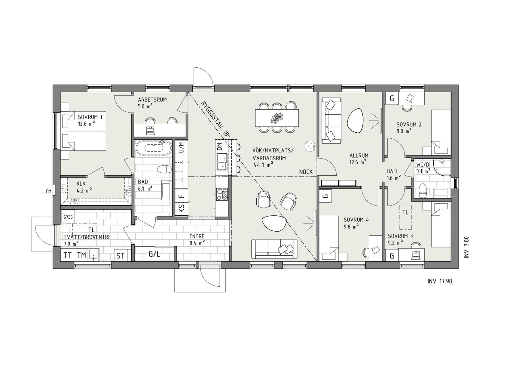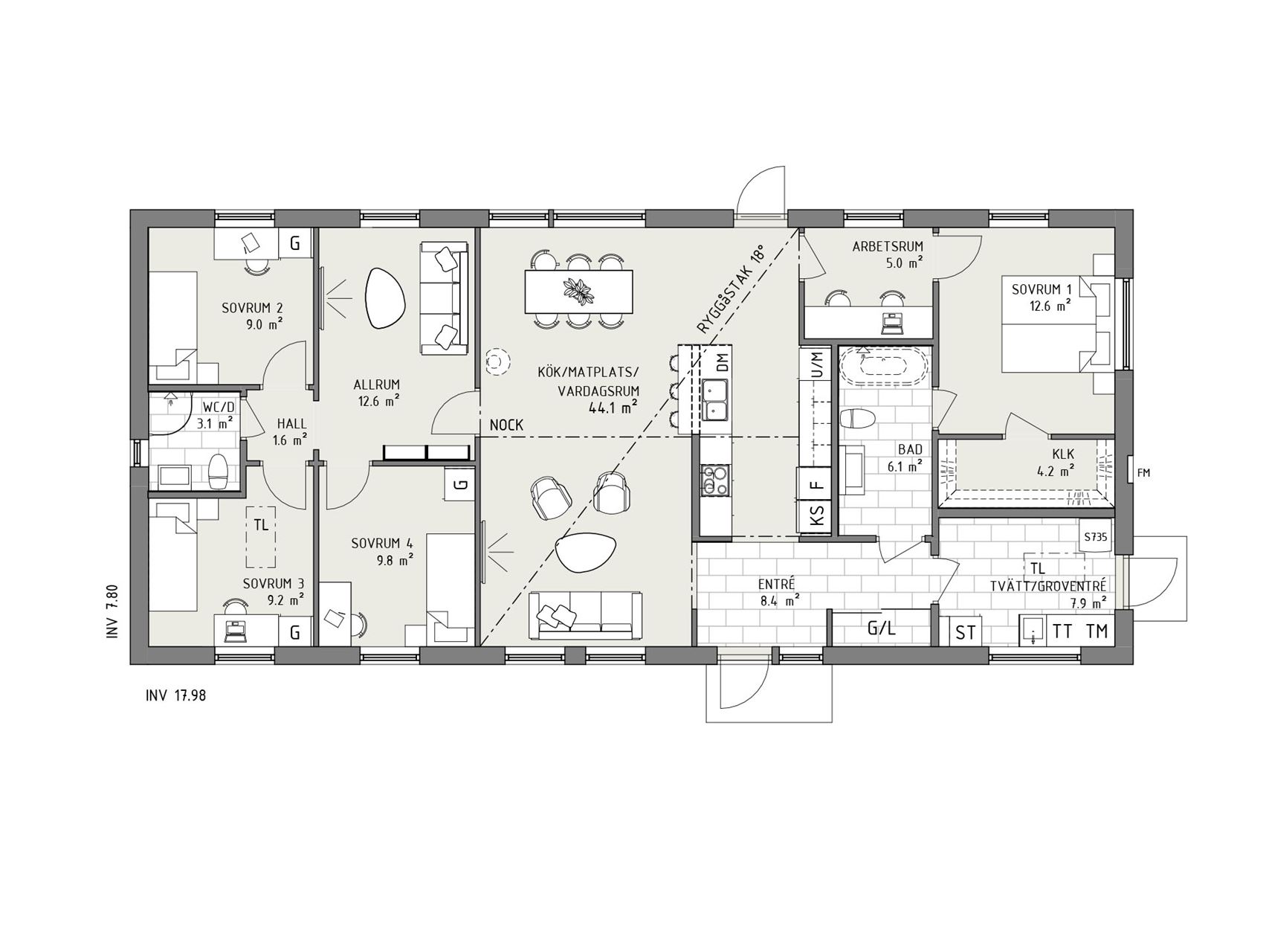 Den större versionen av Smart 117 har lika smarta lösningar: bra förvaring, föräldrasovrum med walk-in-closet och egen ingång till badrummet – liksom ett utmärkt hemmakontor. Men också hela fyra sovrum och ett extra allrum.