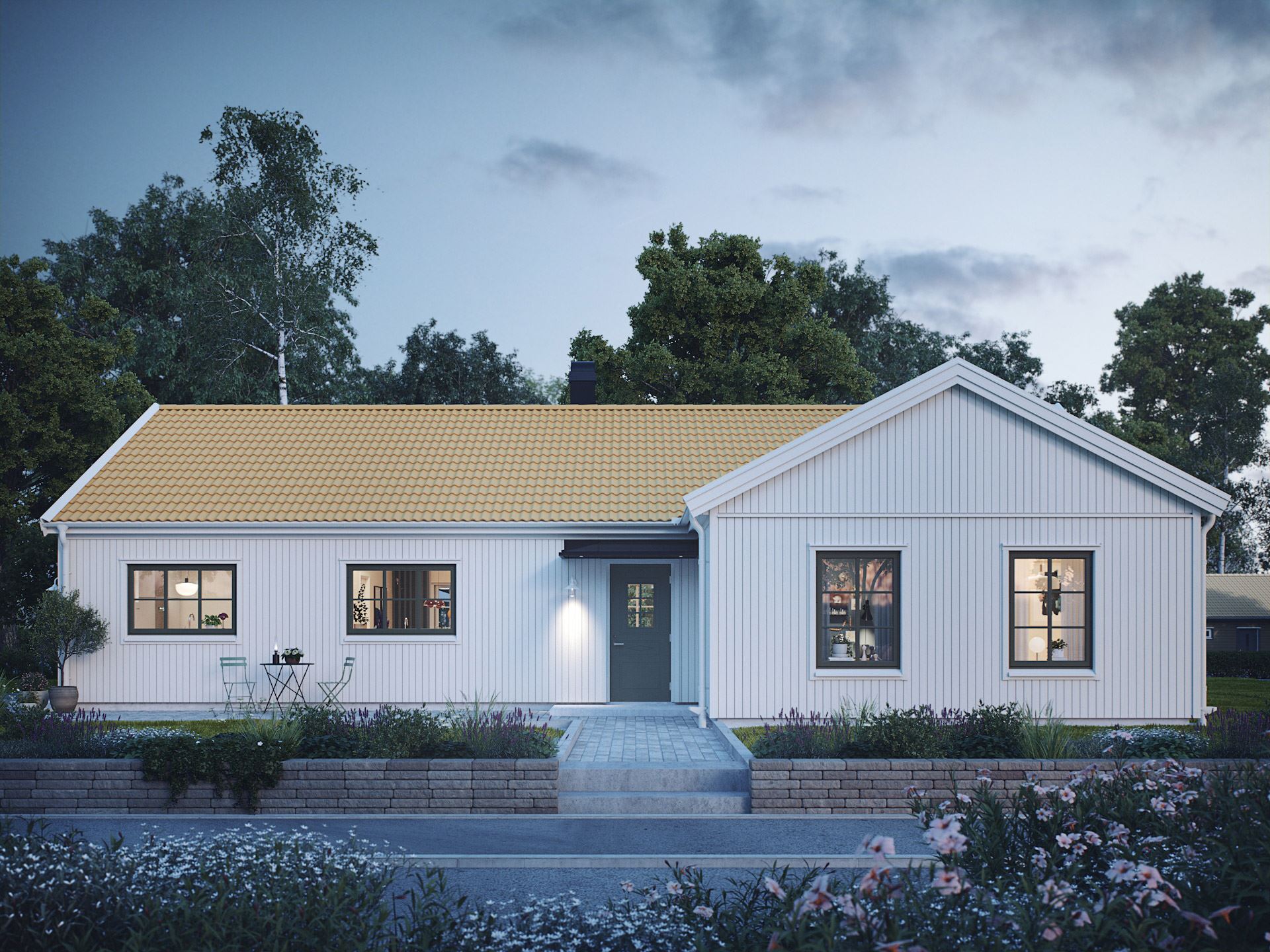 Smart 150 i lantlig stil är som gjort för det ljuva livet. Här lånar färgsättningen inspiration från skånsk byggtradition. Vit träfasad, gröna dörrar och fönster – med spröjs såklart – och ett gult tak som ger det lilla extra. En klassisk husdröm i modern tappning, som kommer lika väl till sin rätt på landet som i stan.