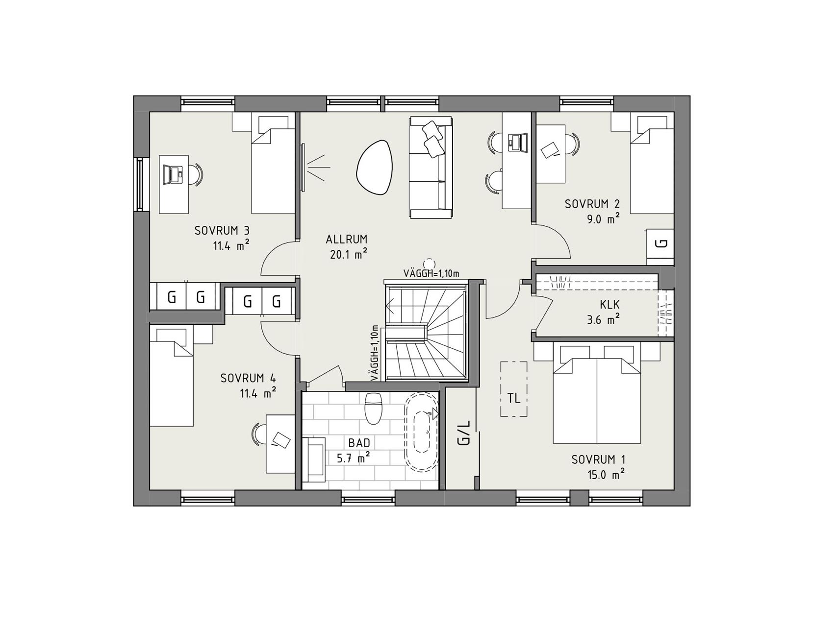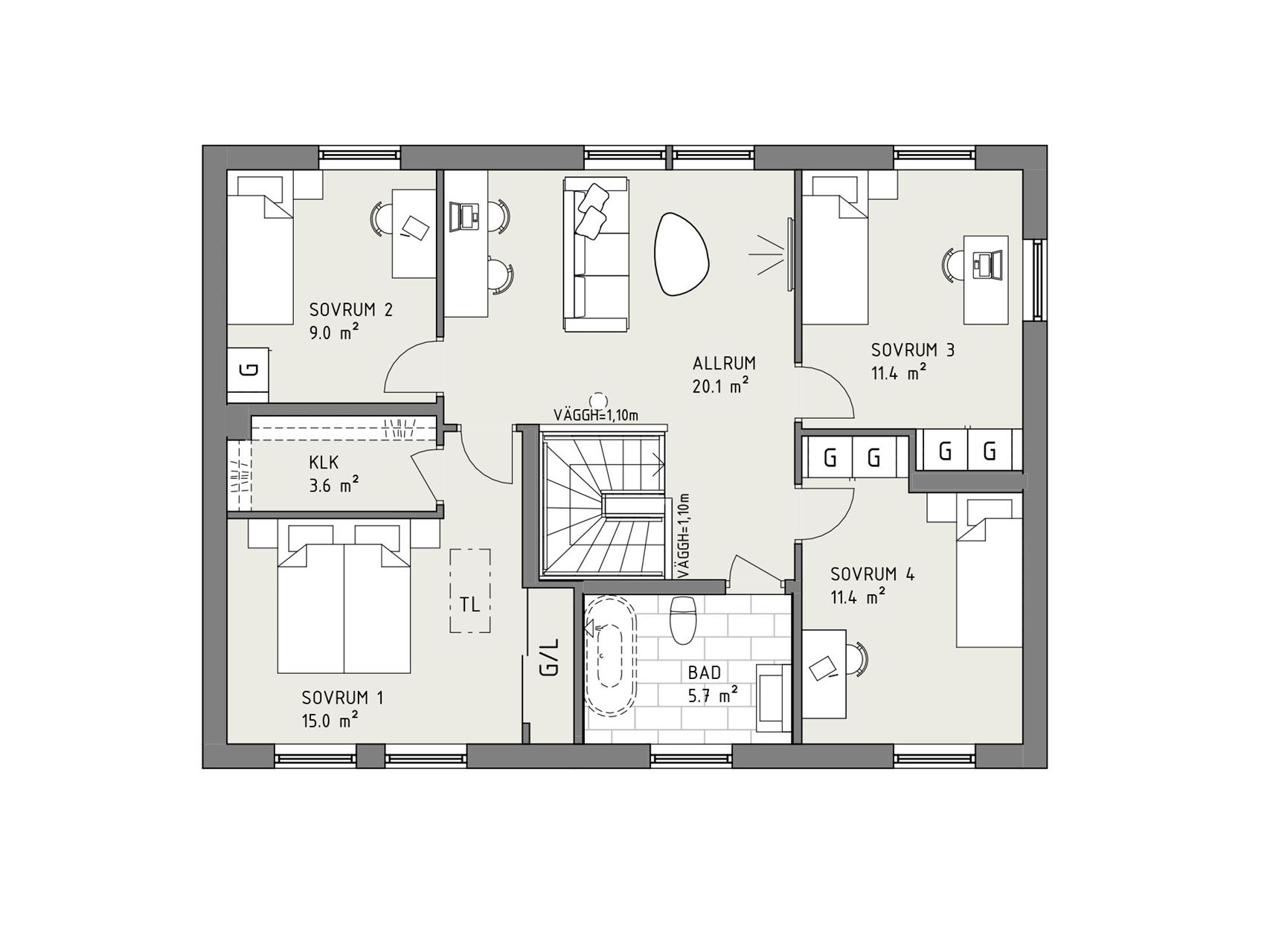 Att husets groventré och tvättstuga är placerad nära entré och kök är också en praktisk vardagslyx – liksom att Smart 166 har goda förvaringsmöjligheter. Som tillval kan entrévåningen även få ett sovrum, gästrum eller hemmakontor. En trappa upp finner vi sedan fyra fina sovrum samlade kring ett mysigt allrum. Här finns också ett fräscht badrum och en praktisk klädkammare.