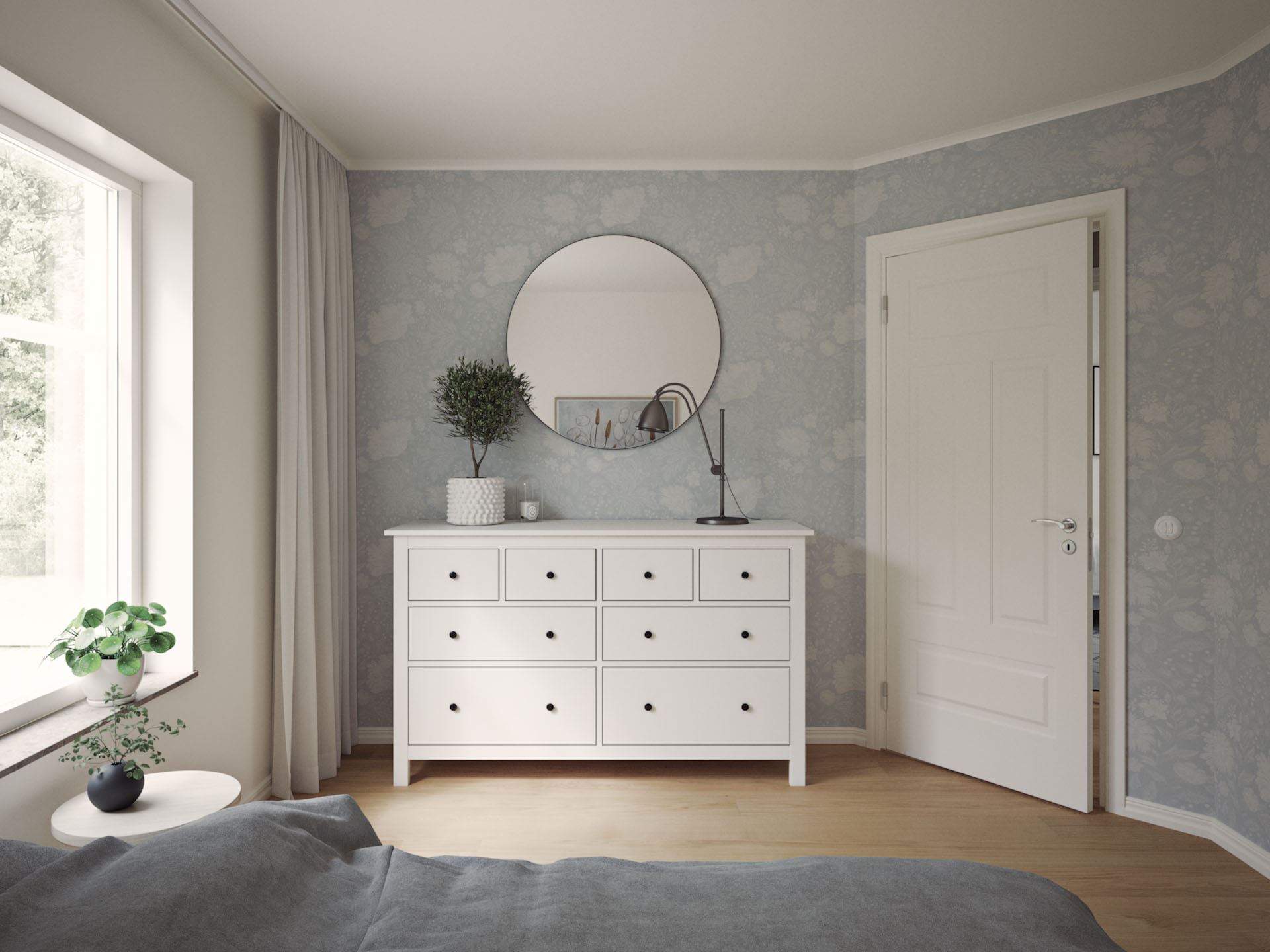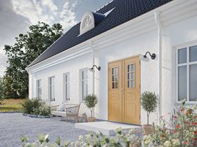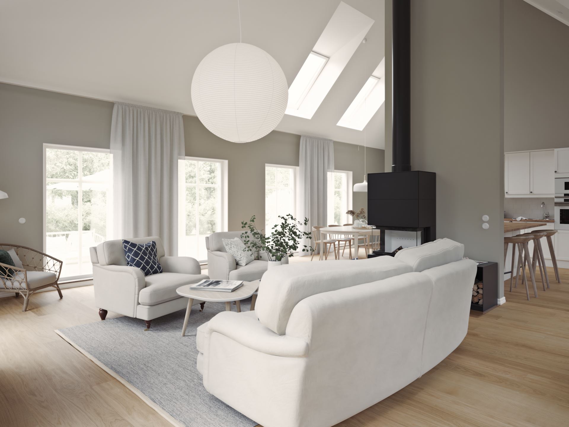 Solstrimma i lantlig stil med puts är den lantliga charmen personifierad. Här återskapas en rustik, lantlig stil – som gör traditionen rättvisa. Med putsad fasad, spröjsade fönster, nätt takfot och en symmetriskt fönstersättning. De halvmåneformade takfönstren i entréfasaden knyter an till gavelfasadens fönsterspråk och ger huset sin karaktär, medan den havregula entrédörren förstärker samspelet med naturen. Ett hus som gjort för landsbygden.