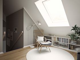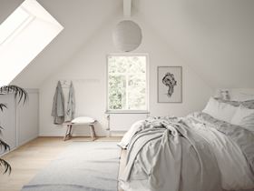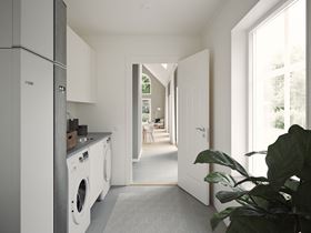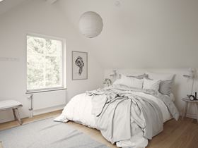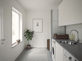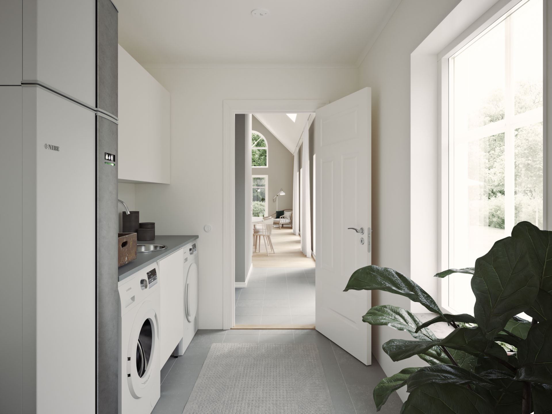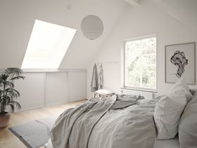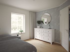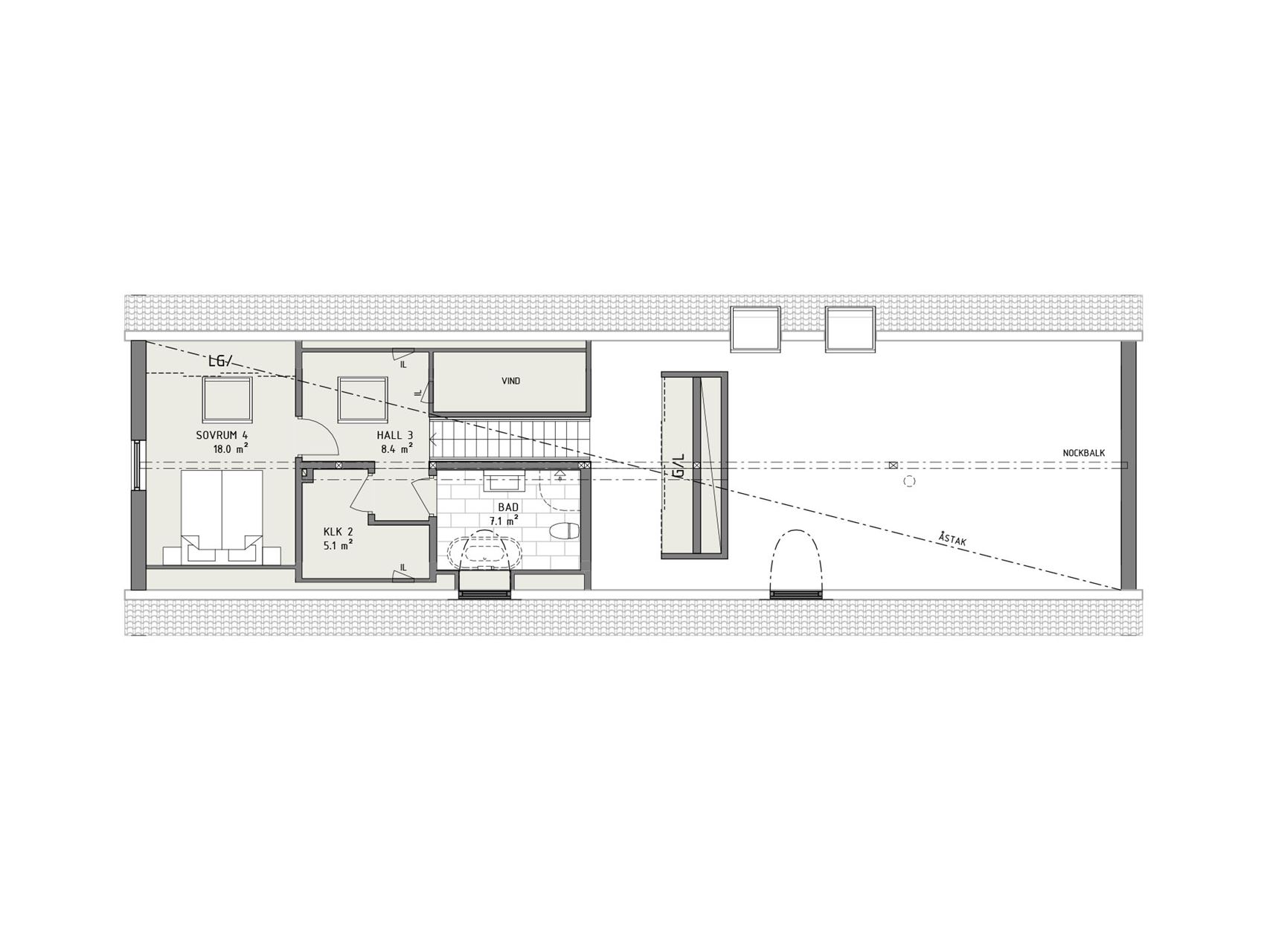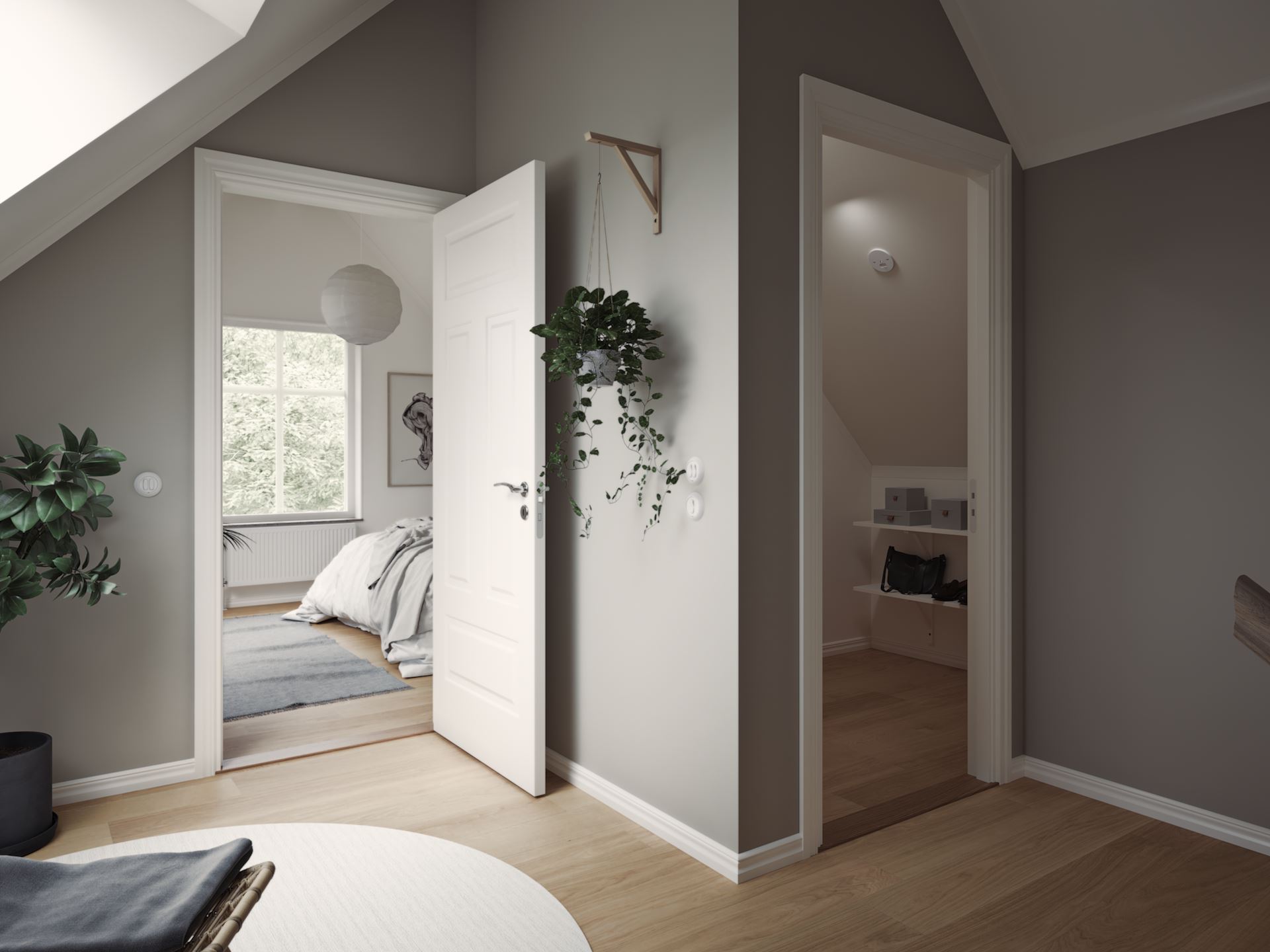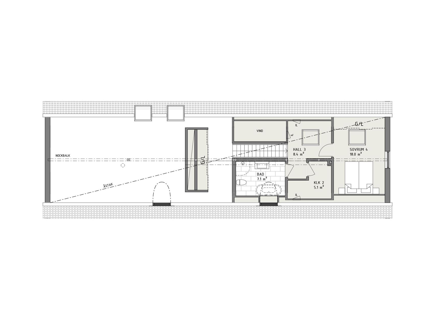 Solstrimmas andra del är konstruerad som ett 1,5-planshus och rymmer husets privata oaser. På entréplan hittar vi tre sovrum, varav ett med egen klädkammare, toalett med dusch och ett genomgångsrum som passar utmärkt för en arbetsplats. Självklart finns här också en praktisk tvättstuga. En trappa upp väntar sedan ett master bedroom i särklass, där snedtak och takfönster bjuder på ljuvlig loftkänsla. Här uppe finns också ett mindre allrum, husets stora badrum och en generös klädkammare.