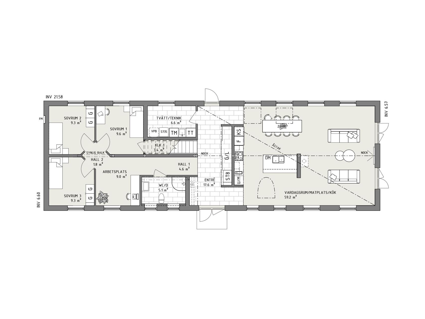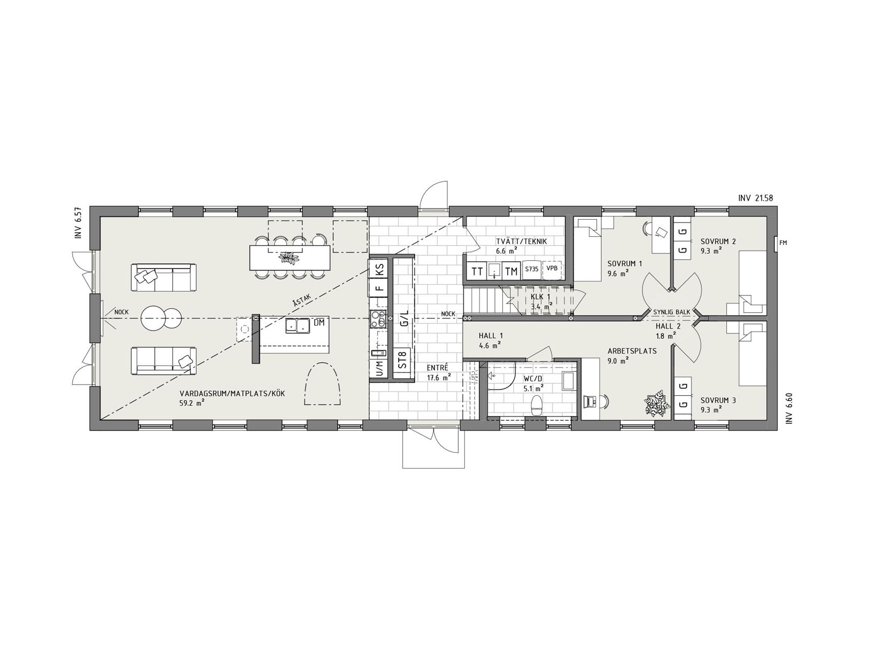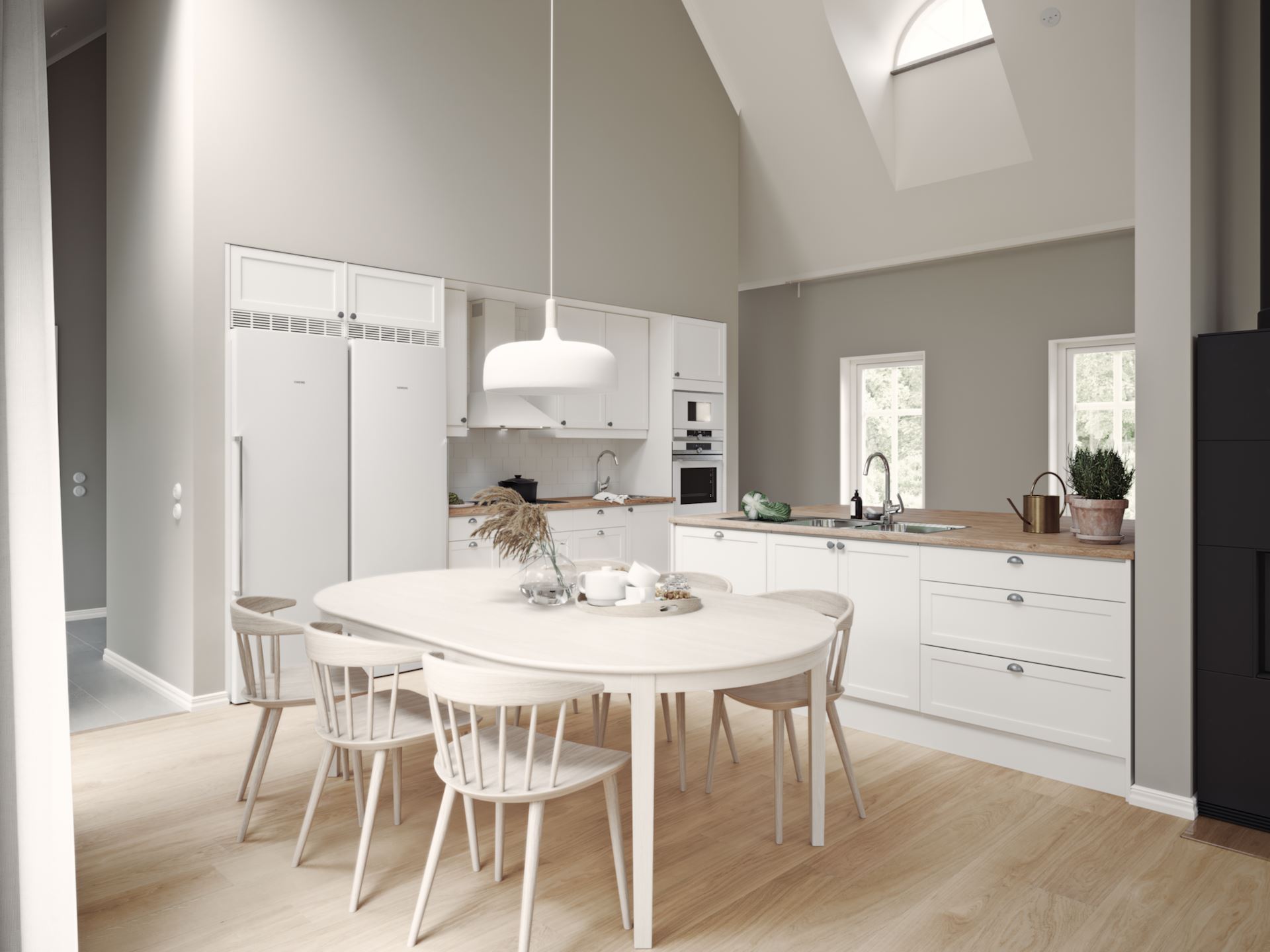 I Solstrimma förenas två olika huskroppar i en. Den ena delen av huset är skapat som ett 1-planshus och har en öppen planlösning med härlig takhöjd där kök och vardagsrum samspelar i fullkomlig harmoni. Generösa inglasningar låter ljuset flöda, det märks redan i entrén där siktlinjen från entrédörren mot altandörren på baksidan också knyter samman husets framsida med den mer privata trädgårdsdelen.