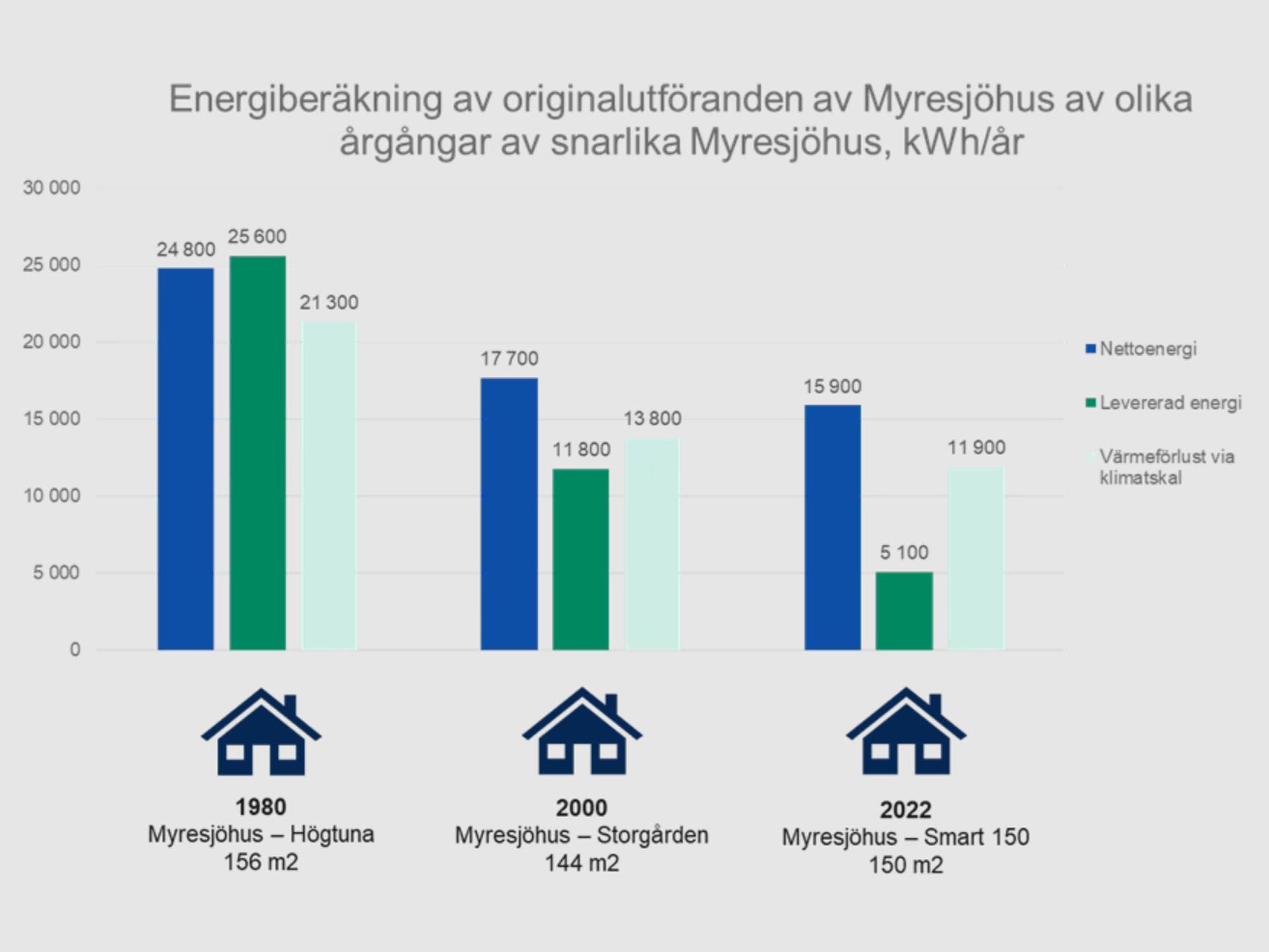 Undersökningen gjordes 2022 tillsammans med vår värmepumpsleverantör NIBE Energy Systems. Här har vi undersökt energieffektiviteten hos tre liknande Myresjöhusmodeller. Högtuna från 1980, Storgården från 2000, och Smart 150 från 2022 – alla med tidstypisk uppvärmning, och tänkt placering i Stockholmsområdet för att reflektera ett genomsnittsklimat i Sverige. Beräkningarna har huvudsakligen utförts enligt SS-EN ISO 52016-1:2017 och resultatet redovisas som nettoenergi, levererad energi, samt värmeförluster via klimatskal.