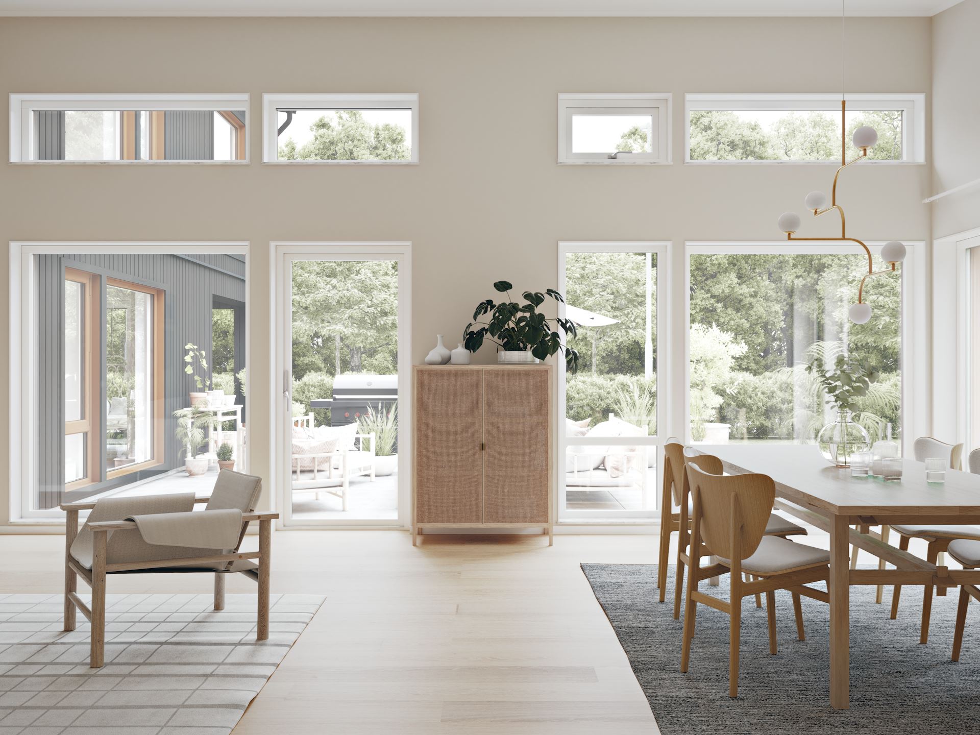 – Jag uppskattar en tydlig uppdelning mellan kök och vardagsrum, samtidigt som de uppglasade partierna skapar en tydlig koppling mellan dem. På så vis får man två ytor att umgås på, samtidigt som man inte störs av varandra. Andra favoritdetaljer är kapprummet i entrén, de stora fönsterpartierna på husets baksida – och den indragna uteplatsen vid köket som gör det enkelt att äta sin frukost ute. Det här huset har helt enkelt mycket av de ytor man önskar i sin vardag.