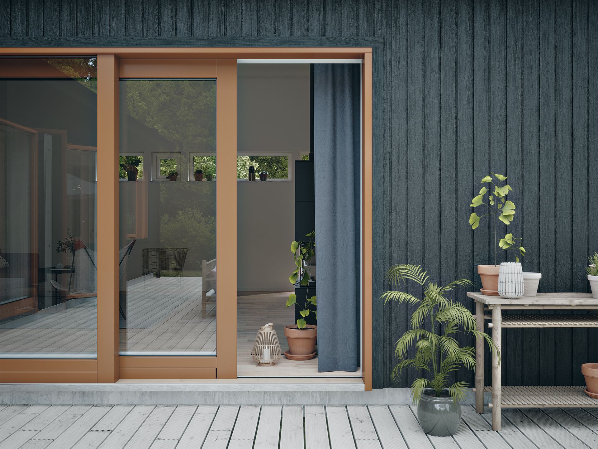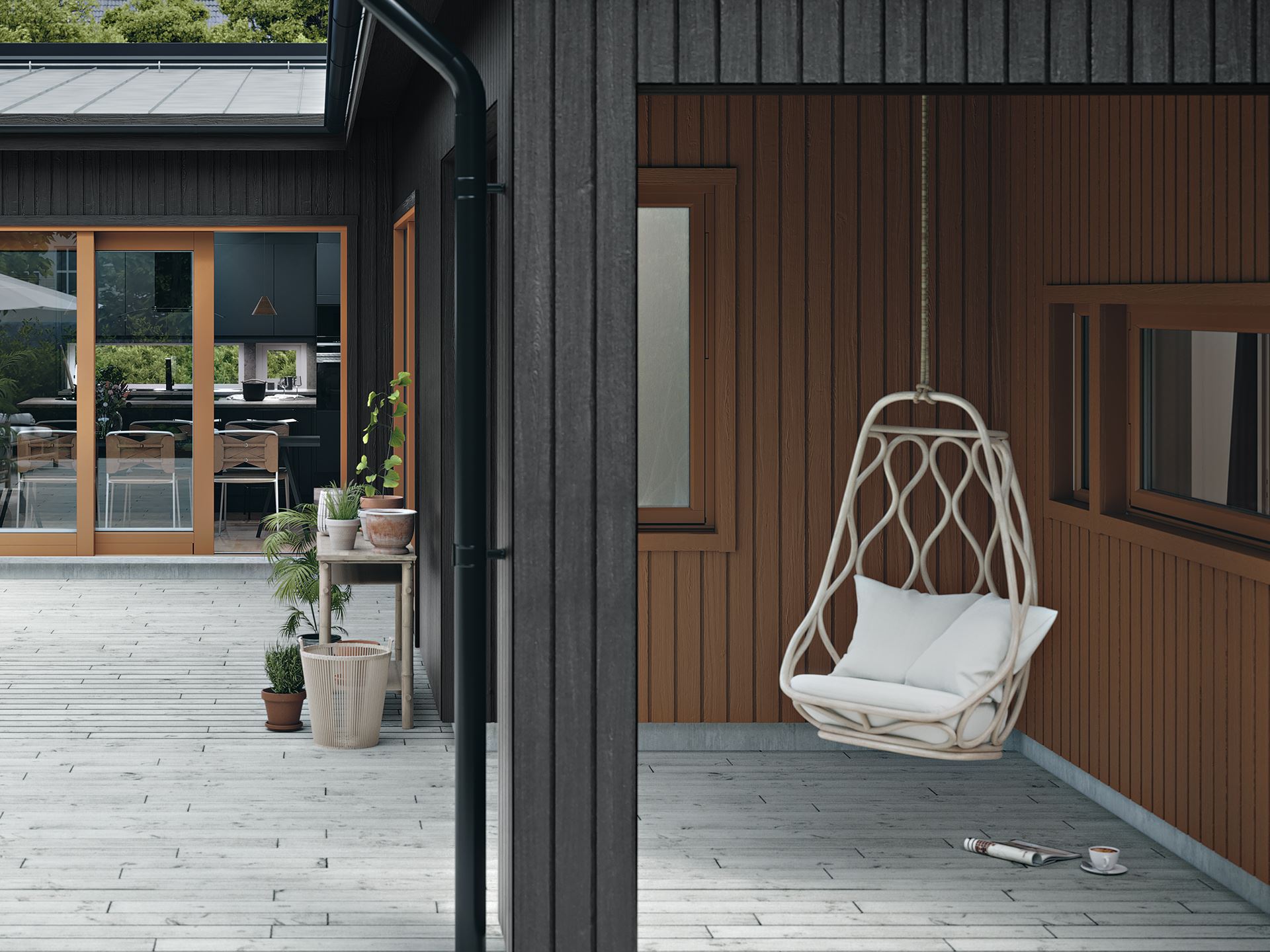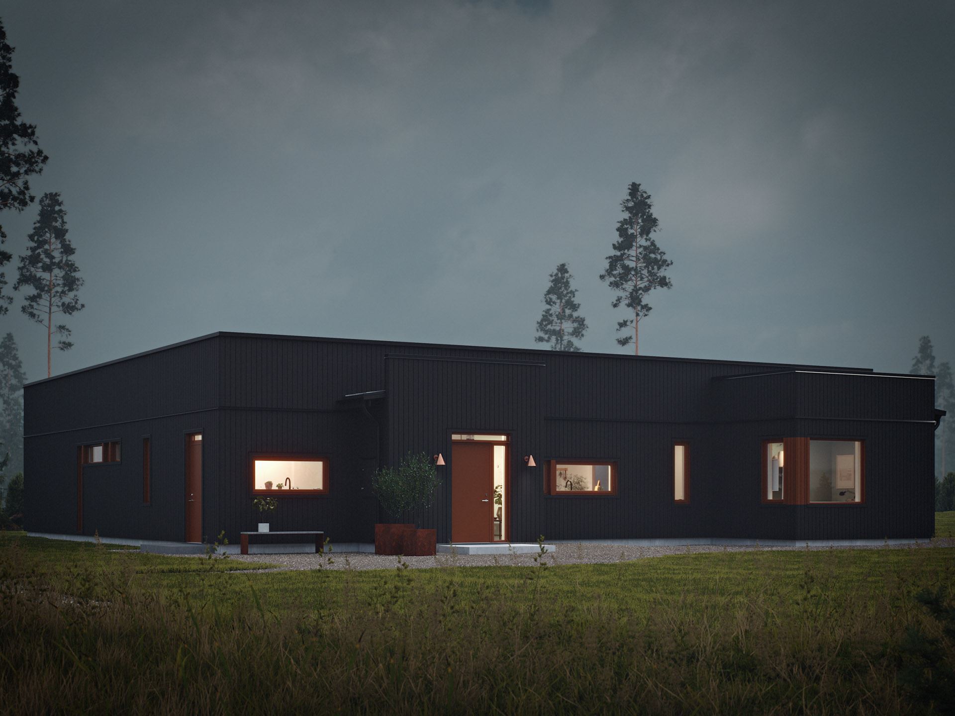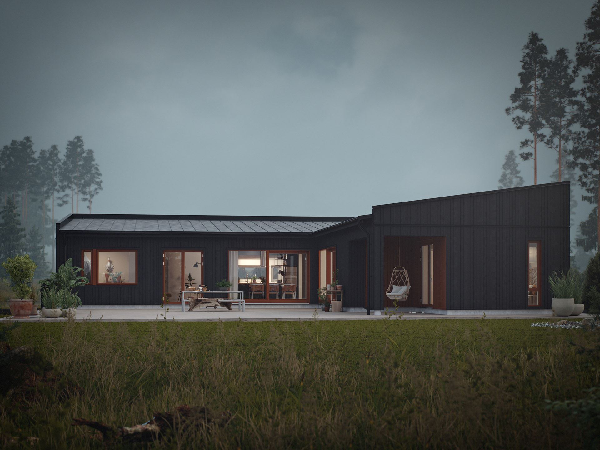 Den moderna tolkningen av Nymåne har pulpettak med kringbyggda sarger för att ge ett kubiskt uttryck. Den generösa fönstersättningen låter ljuset flöda och kombinationen av svart, stående panel och varmt ockrafärgade detaljer skapar en skön kontrast i tillvaron.