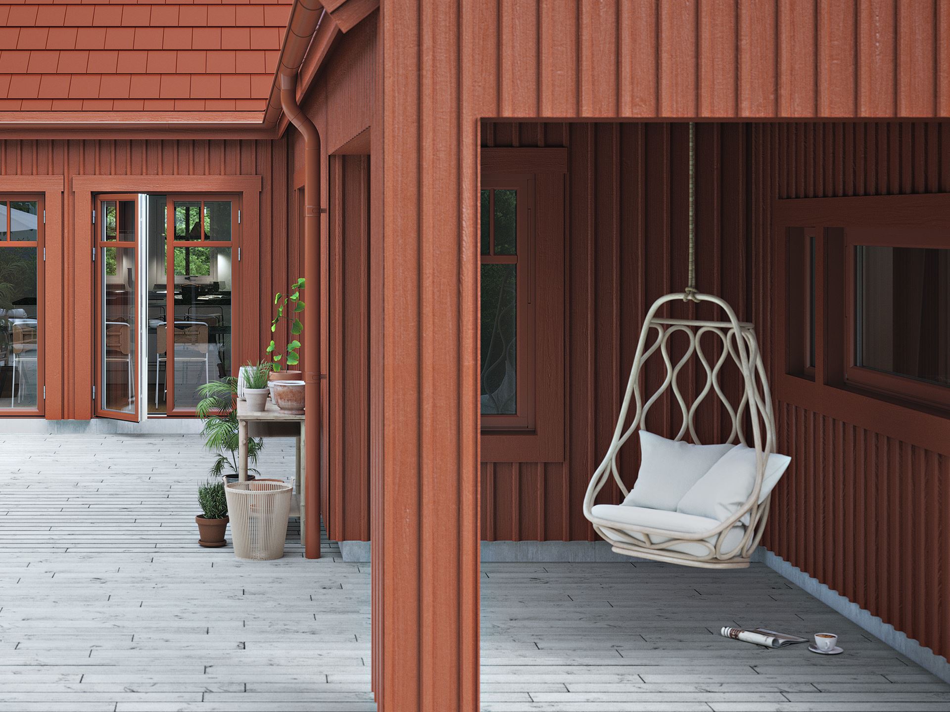 Nymåne i lantlig stil är vår tolkning av en faluröd stuga – fast paketerat på ett samtida sätt. De klassiskt spröjsade fönsterna och sadeltaket finns kvar, samtidigt som den monokromt röda färgsättningen ger huset en aktuell känsla.