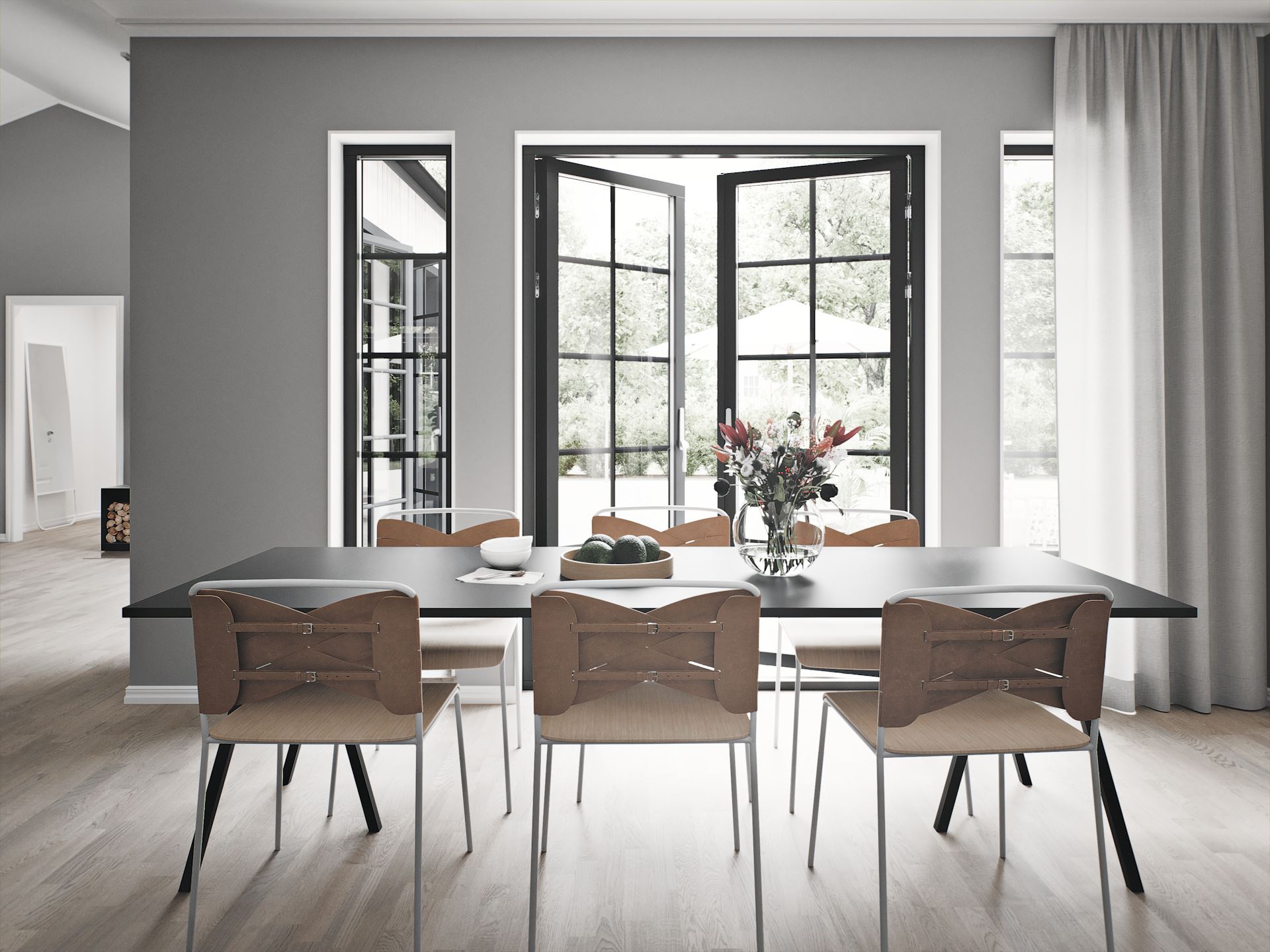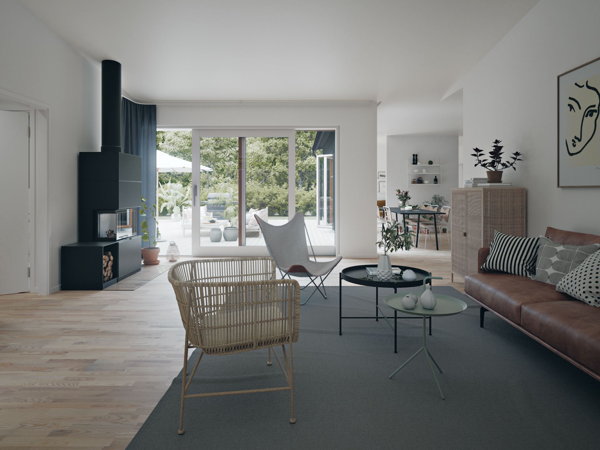 – Jag ville skapa sociala ytor med närhet till trädgården, där det i vinkeln naturligt växer fram en innergård intill vardagsrum och kök. Jag ville separera dessa rum för att få två ytor att umgås på, samtidigt som man inte störs av varandra. Idag är det trendigt med stora, öppna ytor men man ska inte glömma bort att skapa möjlighet för lite mindre och slutna delar för att ljudet inte ska flöda fritt i huset.