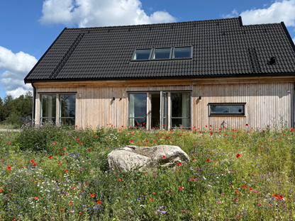 Hållbarhet är en naturlig del av vår vardag här på Myresjöhus. Dels i det större koncernperspektivet inom OBOS – men vi har också en förkärlek för hållbarhet i praktiken. Så när idén om att satsa på ängsmark vid våra visningshus dök upp var steget inte långt till handling. Som de rediga smålänningar vi är gillar vi att göra något åt saken. Att en blommande äng dessutom är vacker att se på är ju heller ingen nackdel.
