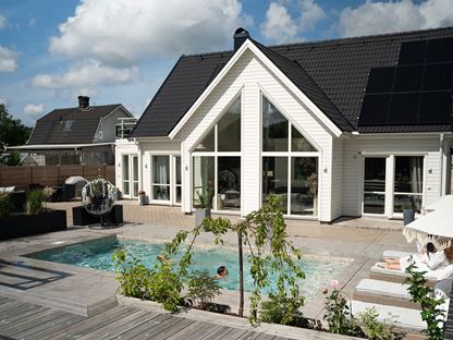 En annan stor fördel med att bygga nytt, enligt Lisa, är att få anlägga en trädgård från grunden. Eftersom familjen gillar att resa var en trädgård som kan klara sig själv ett tag ett av kraven. Ett annat var poolen. Lisa menar att det är toppen att slippa proppa in fyra barn i bilen och ta sig till någon sjö när man vill ta ett dopp. Men den som skaffar sig en trädgård behöver heller aldrig vara sysslolös.