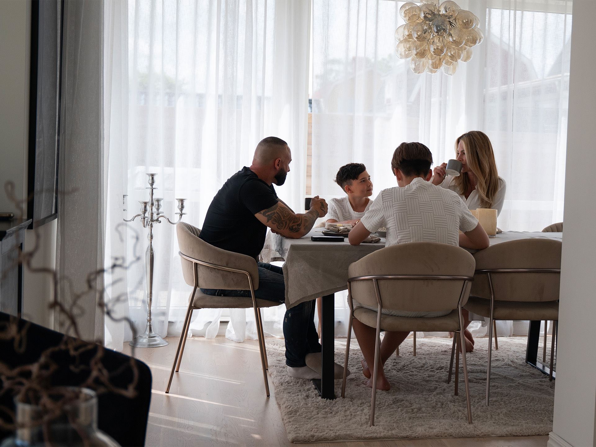 Med en stor familj och stort umgänge behövs både rejäla sociala ytor och gott om egna krypin. Men att hitta ett hus med fem sovrum var inte så enkelt, inte minst eftersom de inte fick bygga högre än ett 1,5-planshus. Här behövdes ändringar i planlösningen, och det blev ytterligare ett skäl att välja Myresjöhus, säger Lisa. Med utgångspunkt i en av Myresjöhus klassiker, husmodellen Kornett, tog familjens drömhus form.