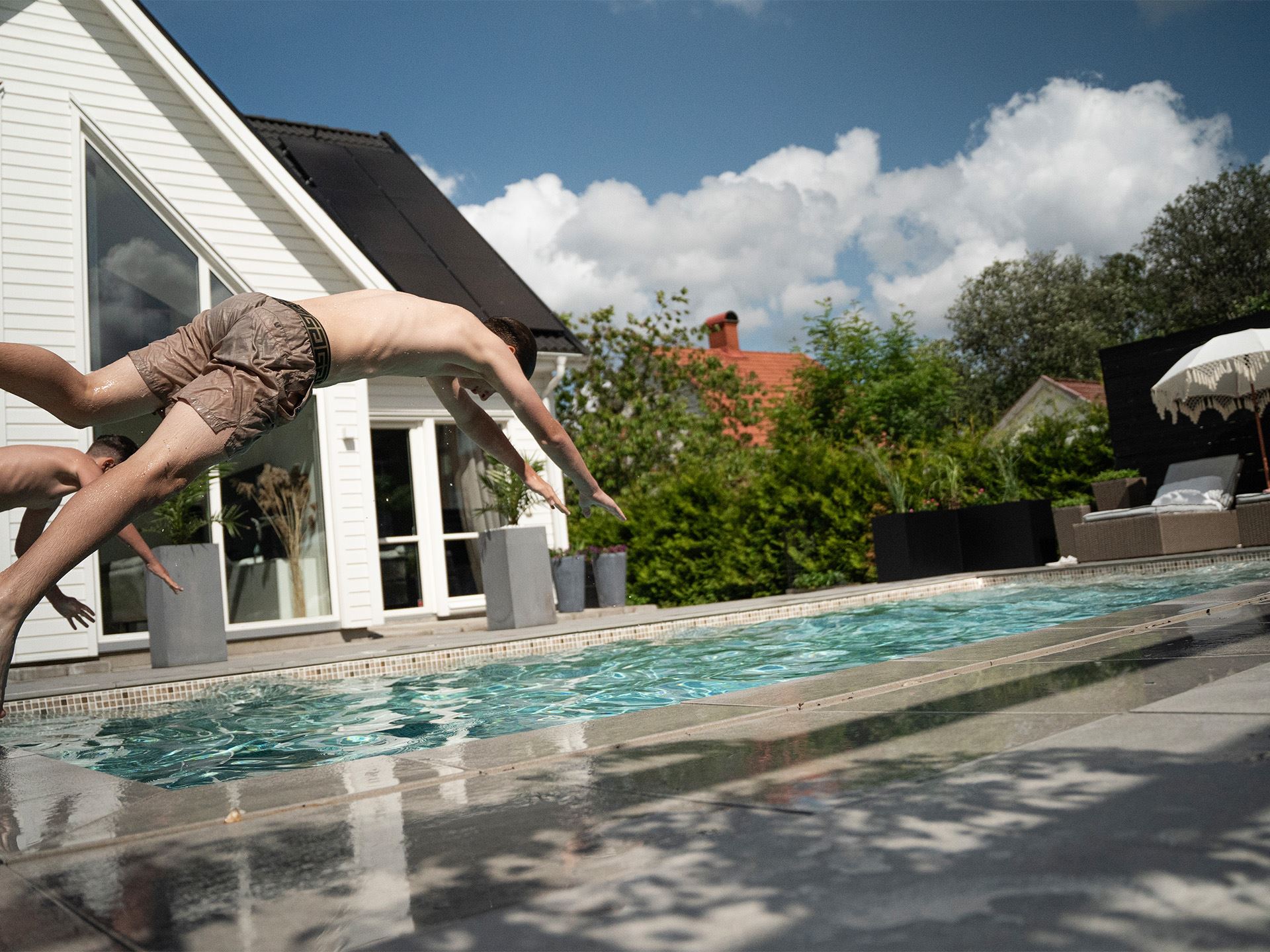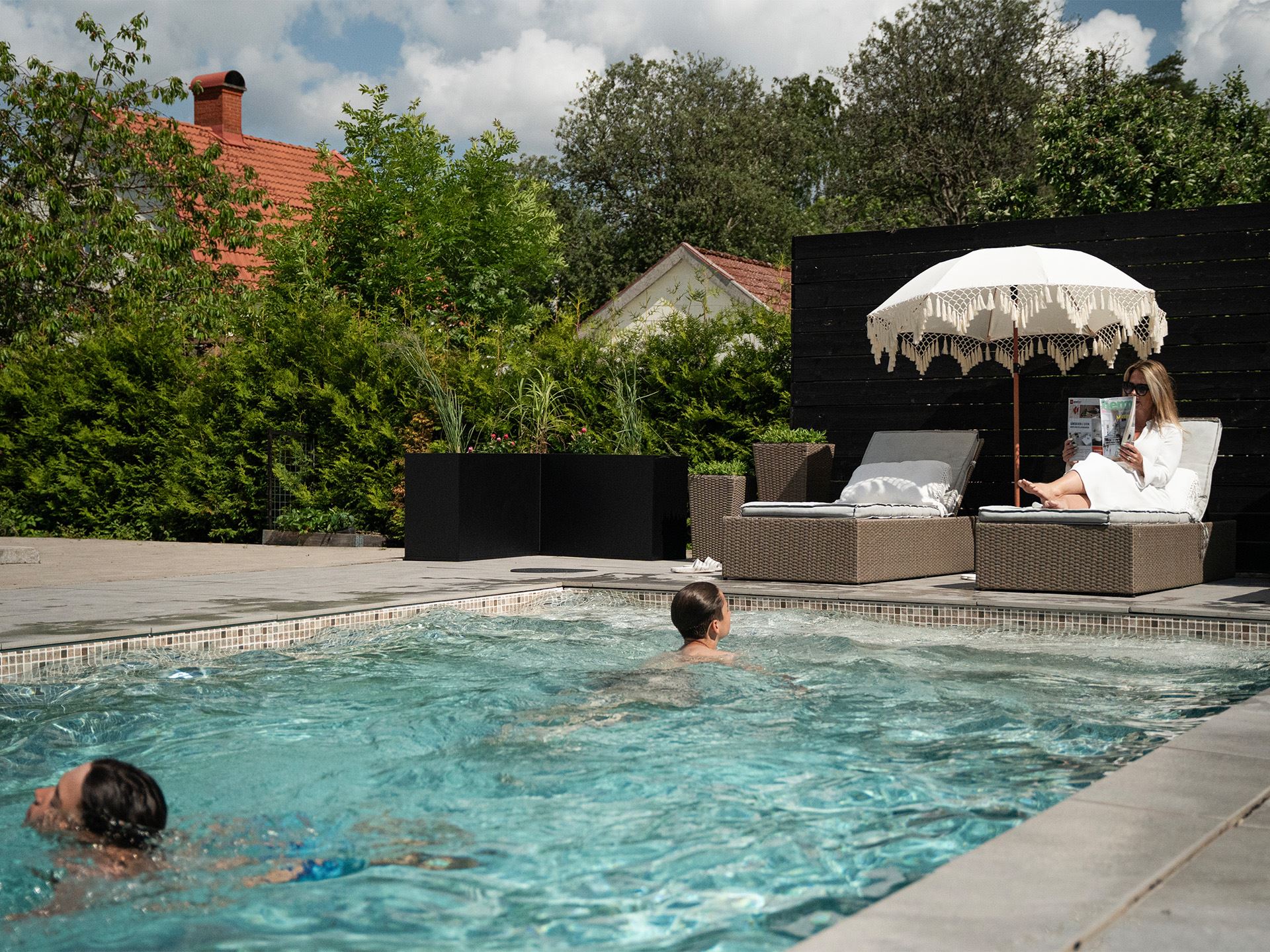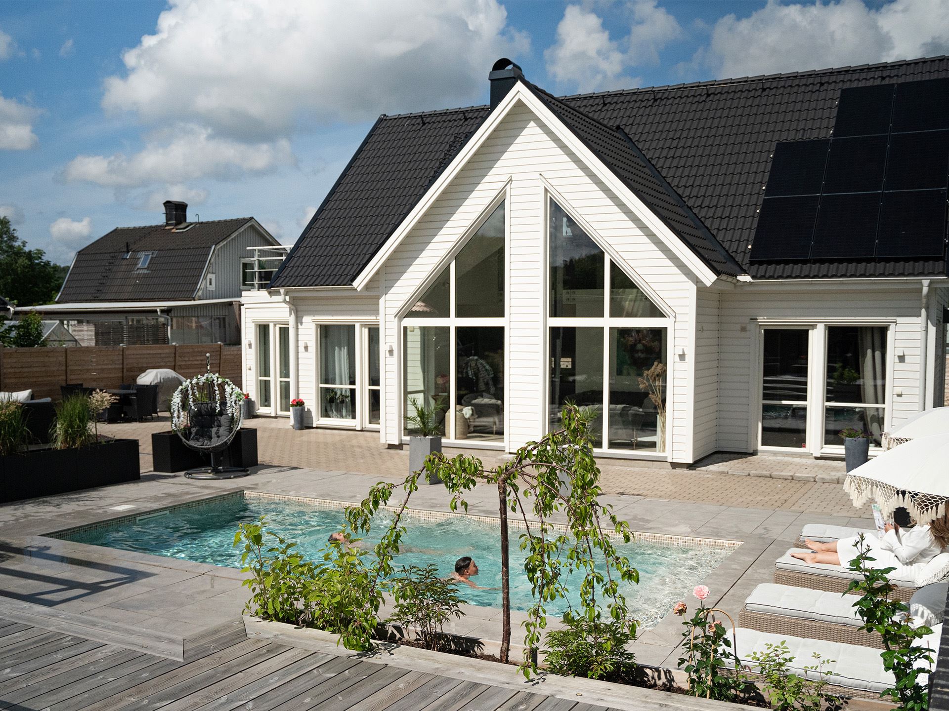 Lisa och Ermin: Vi älskar solen så mycket av planeringen gick ut på att få många solställen under hela dagen. Sedan var vi lite begränsade i placeringen på grund av prickmark.