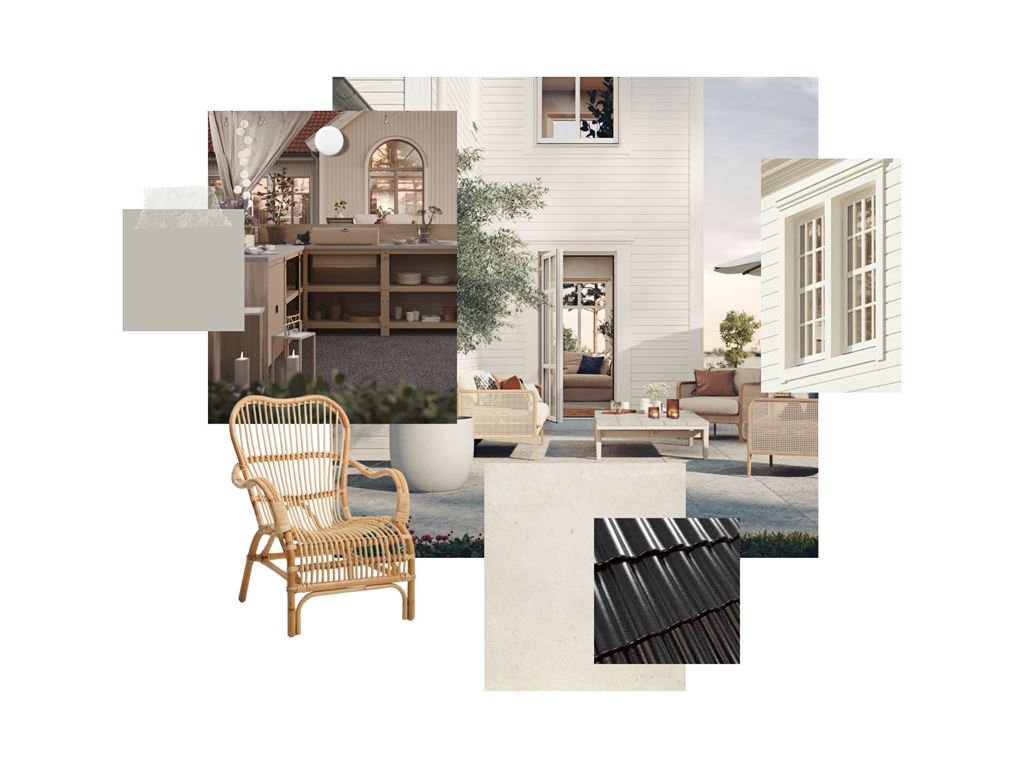 Självklart kan du välja att samla allt i en moodboard, men att få rum med allt på ett bräde kan vara en utmaning. Så vi föreslår att du skapar en för själva huset med lite extra fokus på exteriören, en moodboard för inredningen i huset – och en moodboard för din trädgård. Låt oss starta med huset, och några punkter som kan vara bra att checka av när du samlar inspiration och bygger din moodboard.