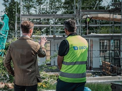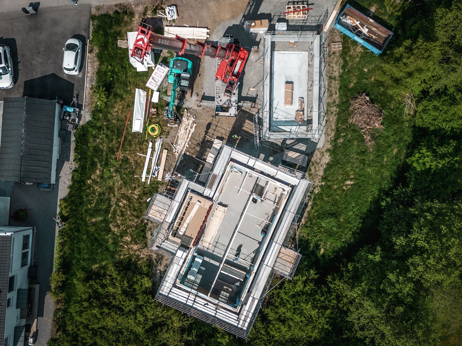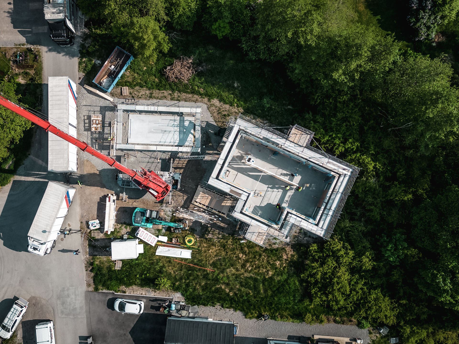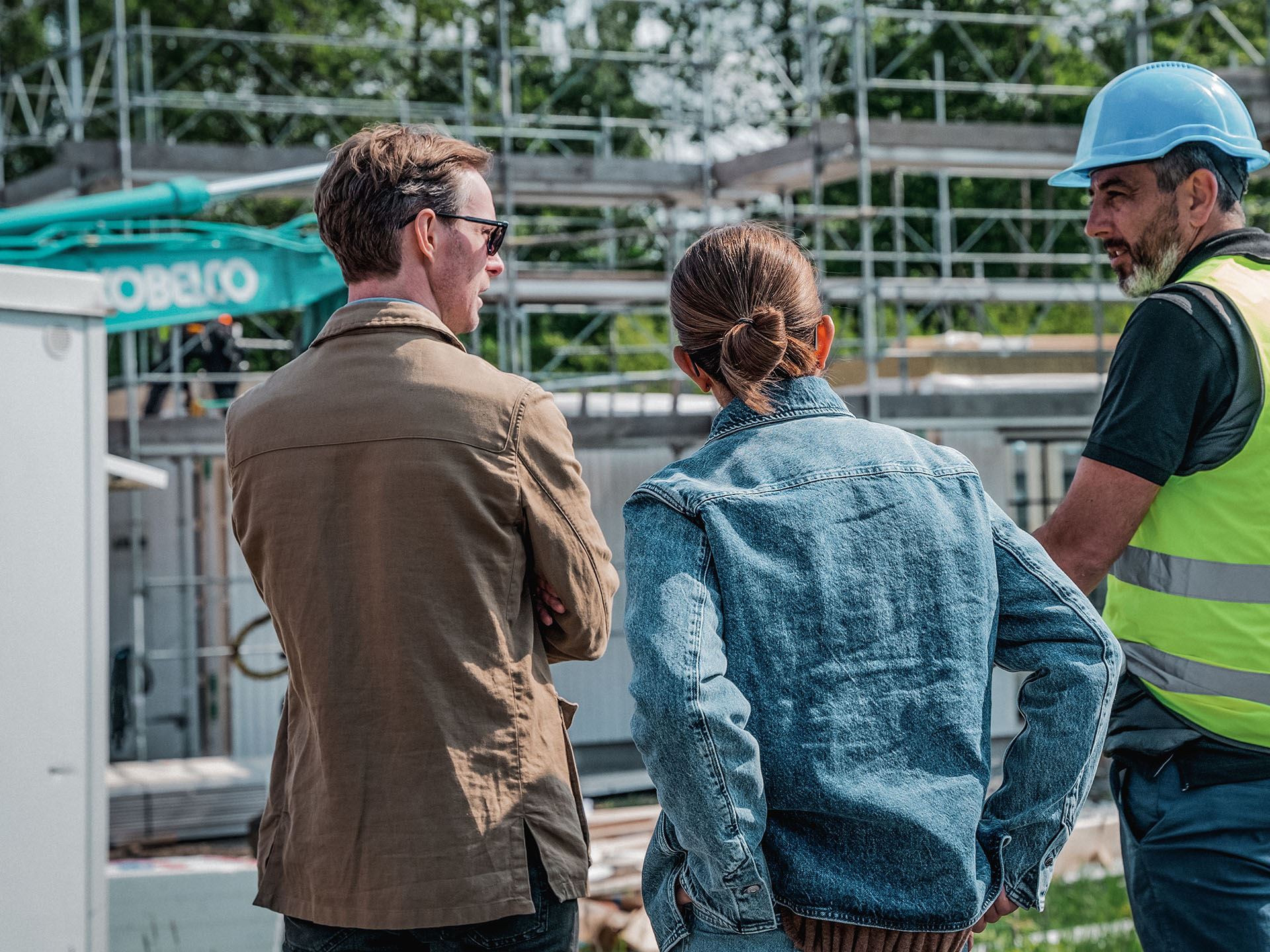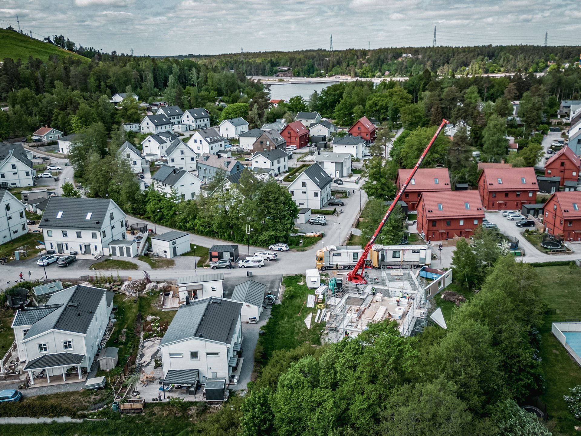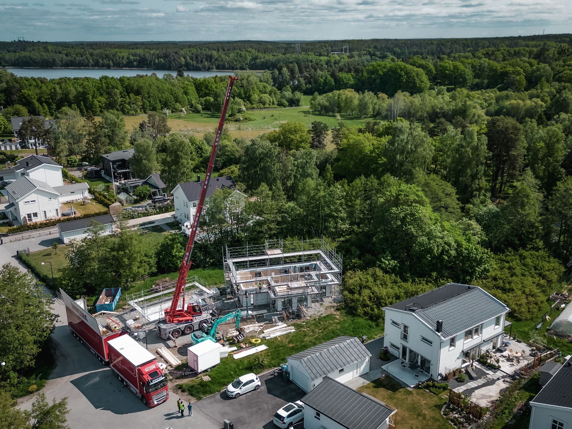 På byggplatsen händer det saker hela tiden. Delarna till huset lyfts på plats i tur och ordning, hammarslagen ekar över nejden – och det går inte att missa familjens glädje över att se sitt hus komma på plats.