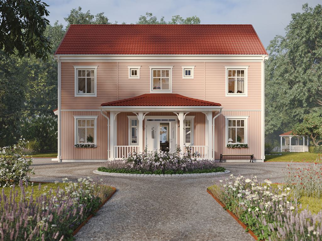 Detta är vår skandinaviska version av den ikoniska New England-stilen. Här kan du med fördel ta det exteriöra uttrycket till nästa nivå med ett matchande entrétak som bärs upp av runda stolpar utsmyckade med vacker kapitäl. Det skapar ett vackert samspel mellan entrén och husfasaden.