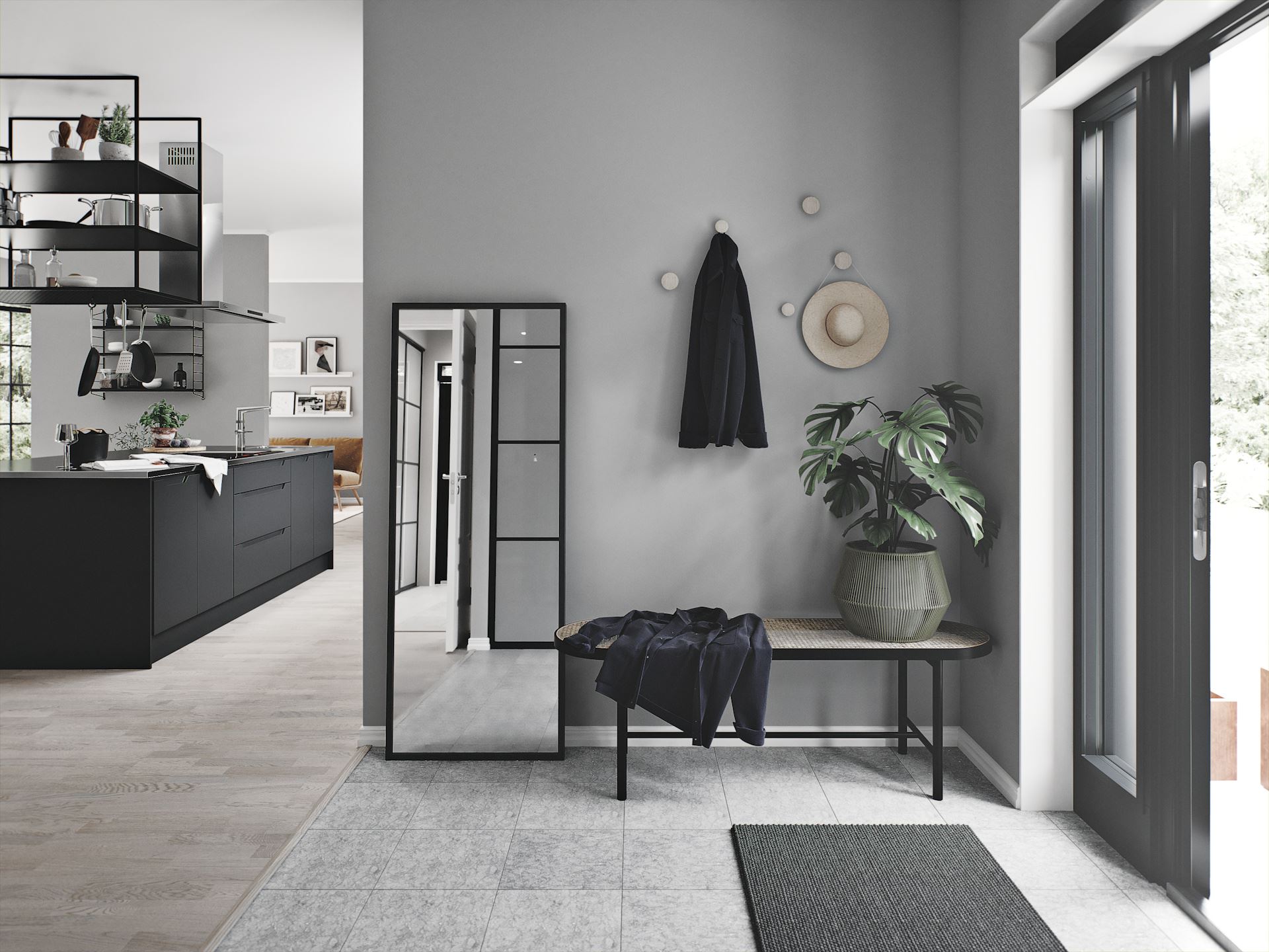 Nyckeln till stilen: lagom attityd. En färgpalett med grått, greige och svart, gärna mörkt trä och läder. Svarta spröjs på fönster och glaspartier, industriinspirerade möbler och detaljer. Balansera gärna med mjuka textilier och naturmaterial som värmer upp uttrycket.