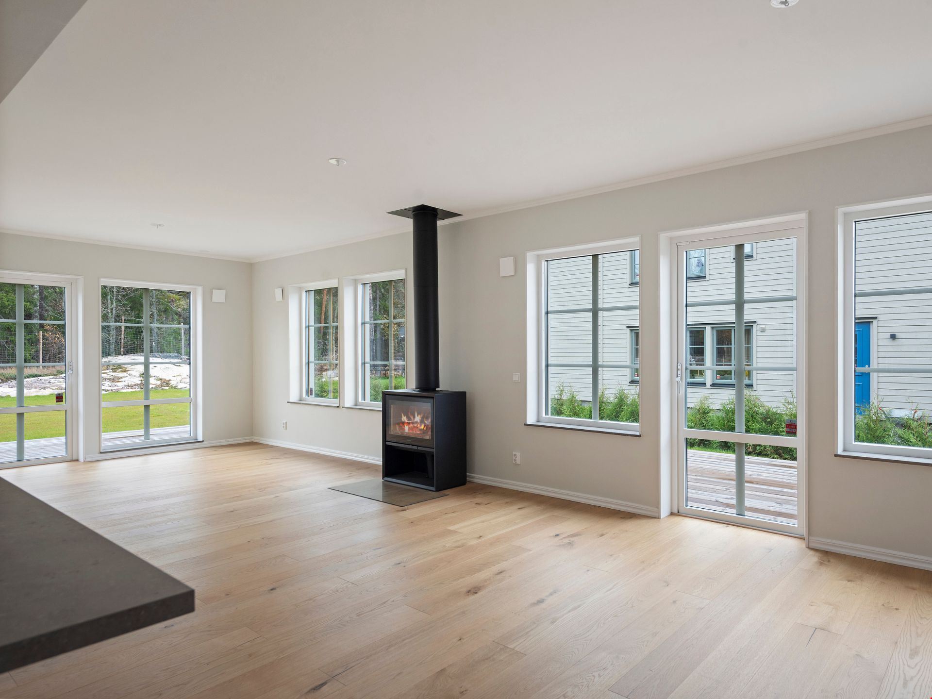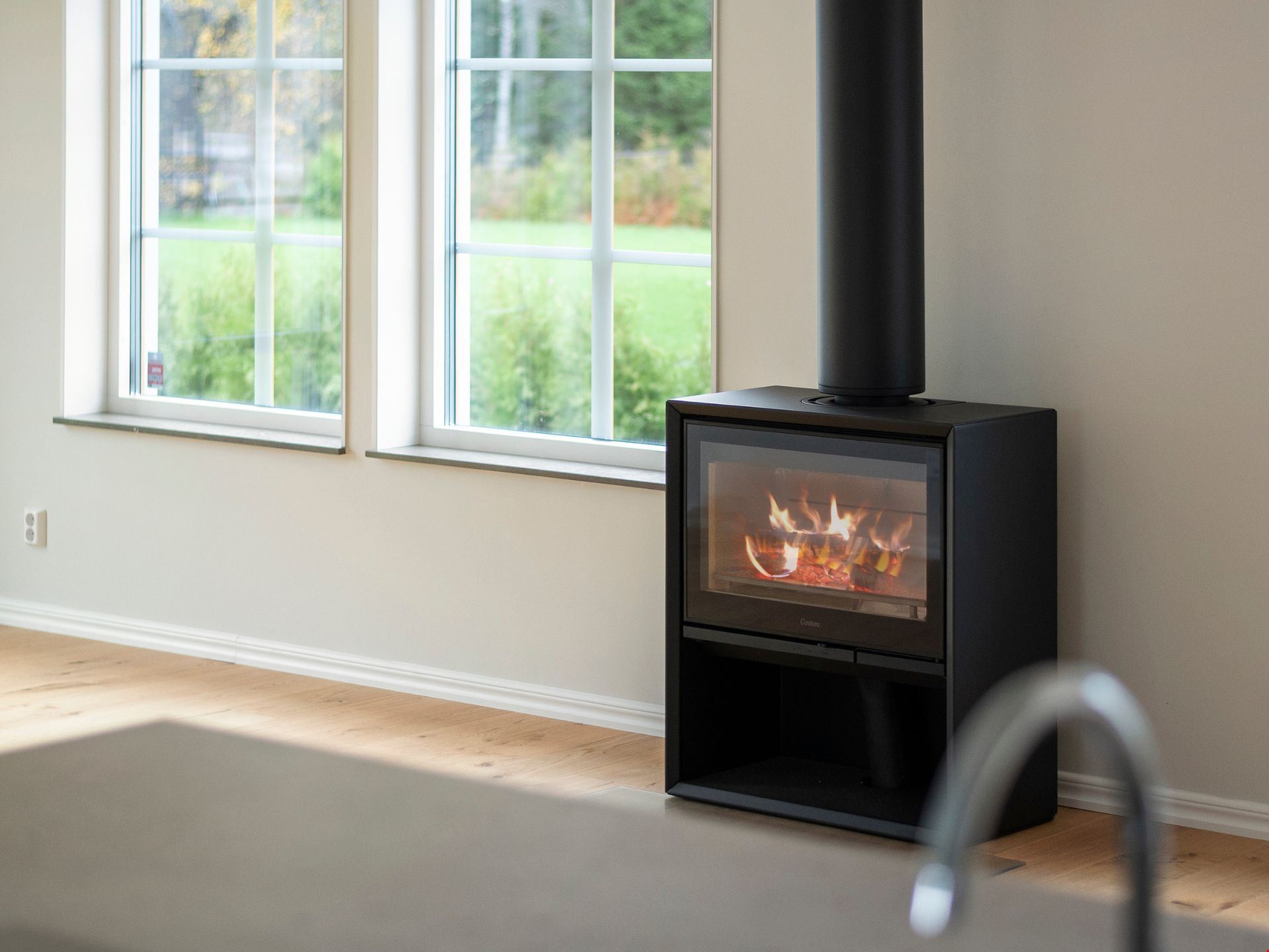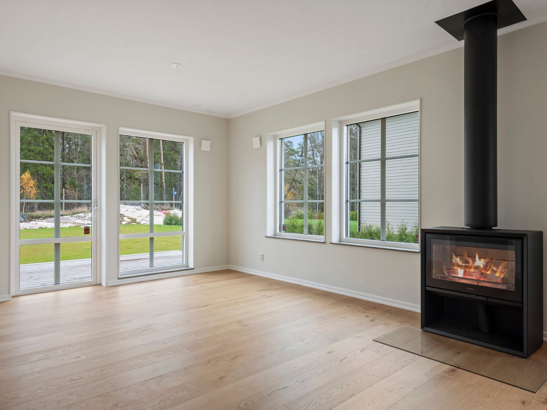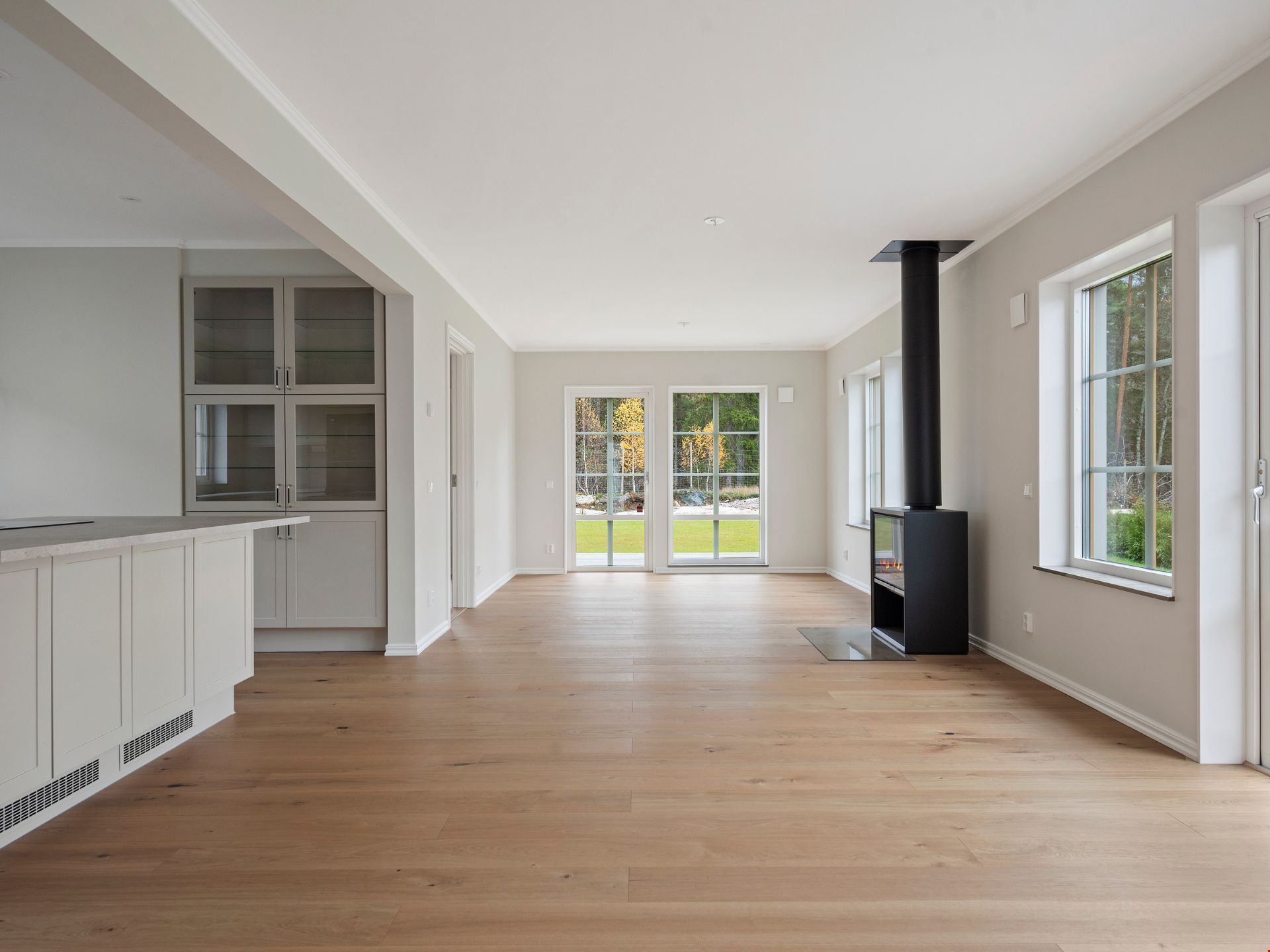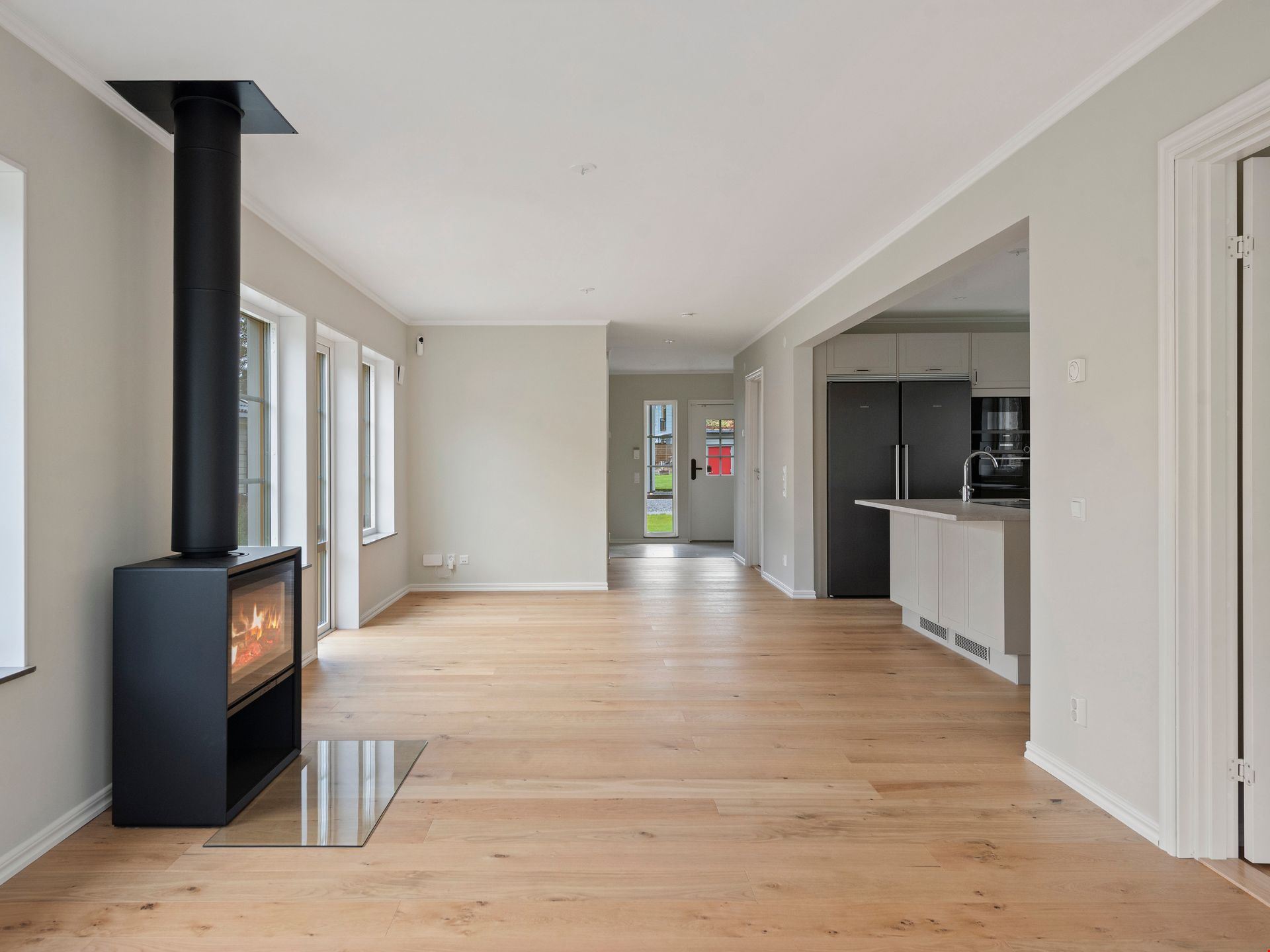 Valen av inredning och utrustning skapar tillsammans en välkomponerad helhet. Köket kommer från HTH och är utrustat med svarta vitvaror. Här hittar du alla hushållsapparater som du behöver för att laga dina festliga måltider som: inbyggnadsugn, mikro, kyl, frys, spishäll, fläkt, integrerad diskmaskin, dämpade fullutdragslådor och mjukstängande luckor. Vardagsrummet är utrutstat med en braskamin från Contura för att skapa rätt mysfaktor. Badrummen bjuder på kakel och klinker, handukstork, takdsuch och duschörn och inredning från Vedum. Badrummet på övervåningen har även ett badkar.