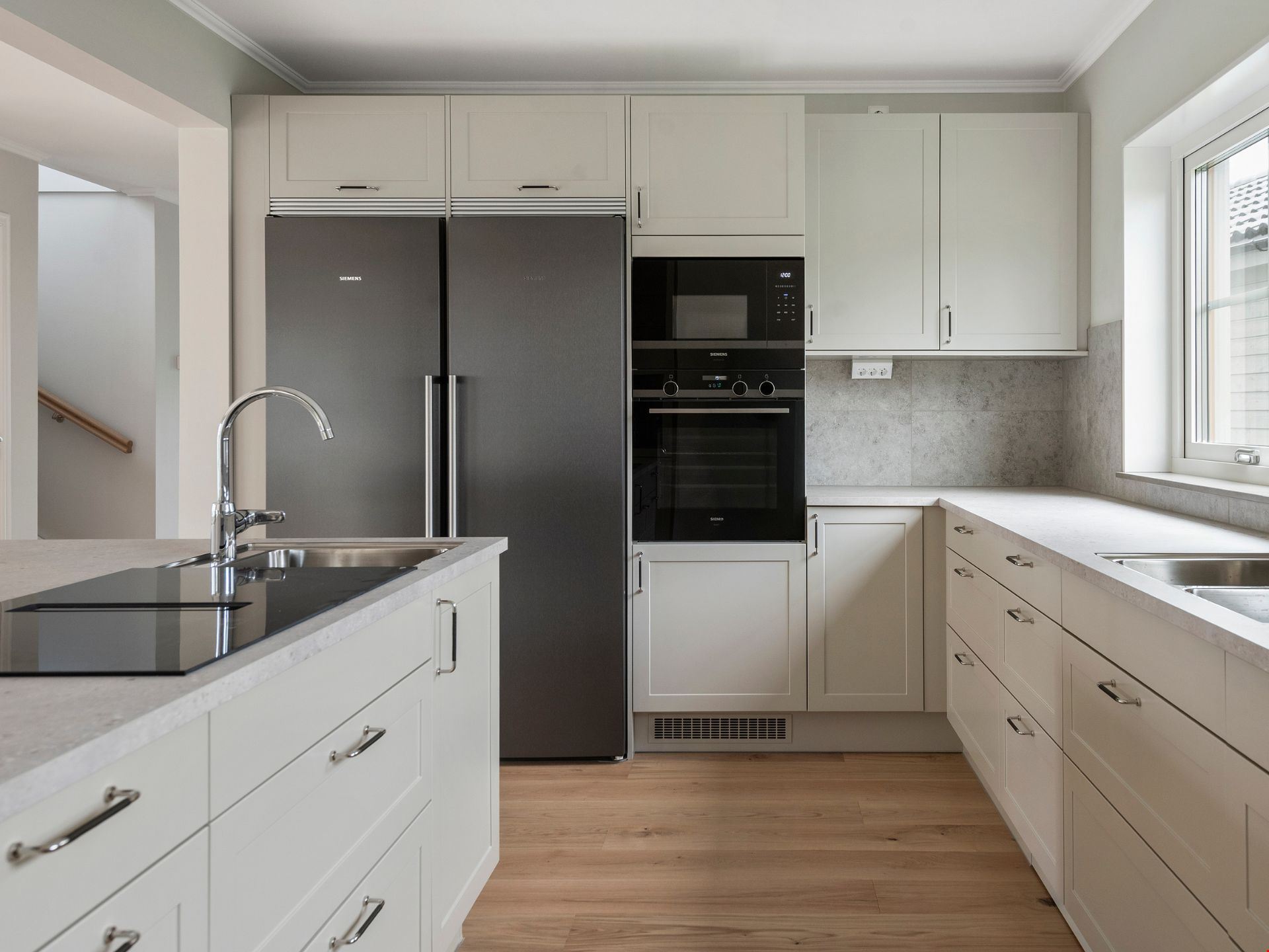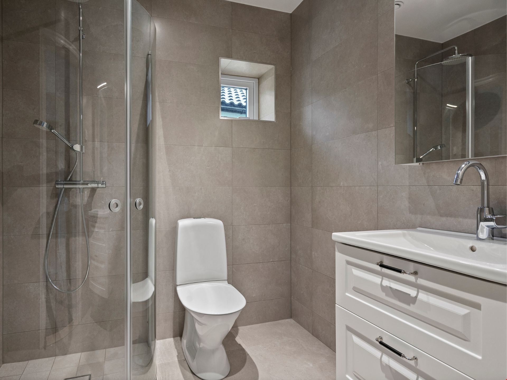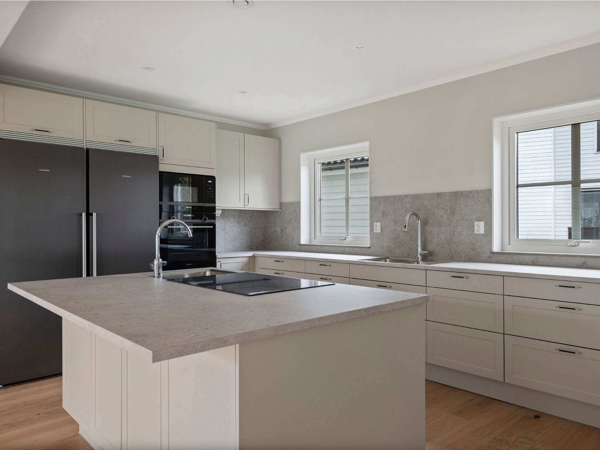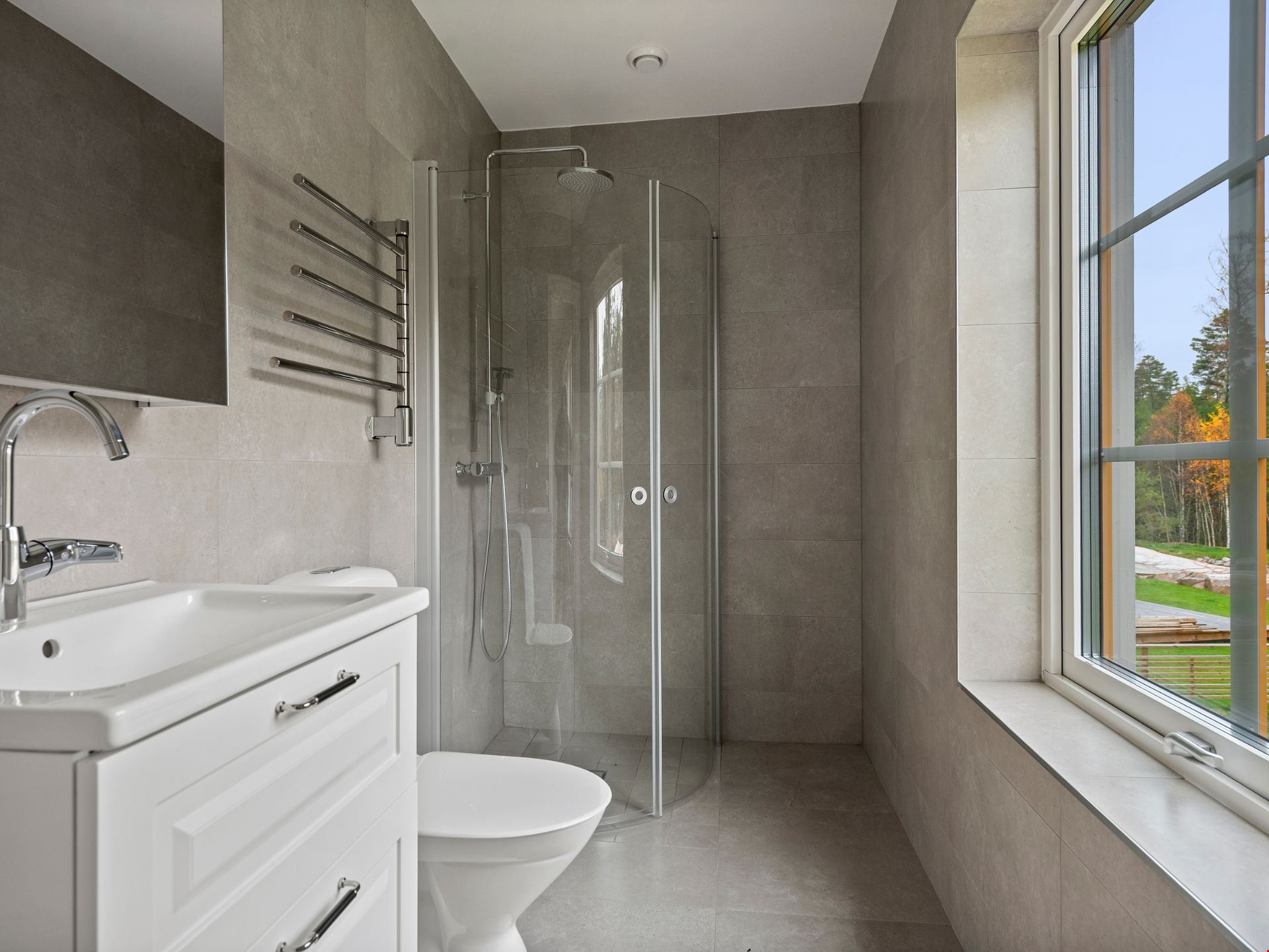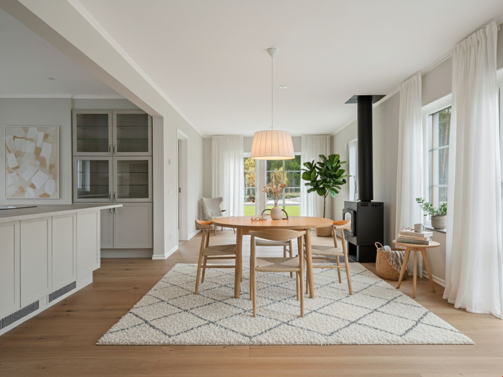 Valen av inredning och utrustning skapar tillsammans en välkomponerad helhet. Köket kommer från HTH och är utrustat med svarta vitvaror. Här hittar du alla hushållsapparater som du behöver för att laga dina festliga måltider som: inbyggnadsugn, mikro, kyl, frys, spishäll, fläkt, integrerad diskmaskin, dämpade fullutdragslådor och mjukstängande luckor. Vardagsrummet är utrutstat med en braskamin från Contura för att skapa rätt mysfaktor. Badrummen bjuder på kakel och klinker, handukstork, takdsuch och duschörn och inredning från Vedum. Badrummet på övervåningen har även ett badkar.