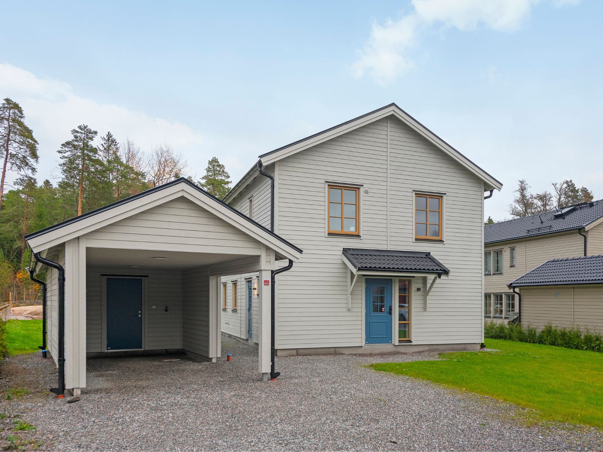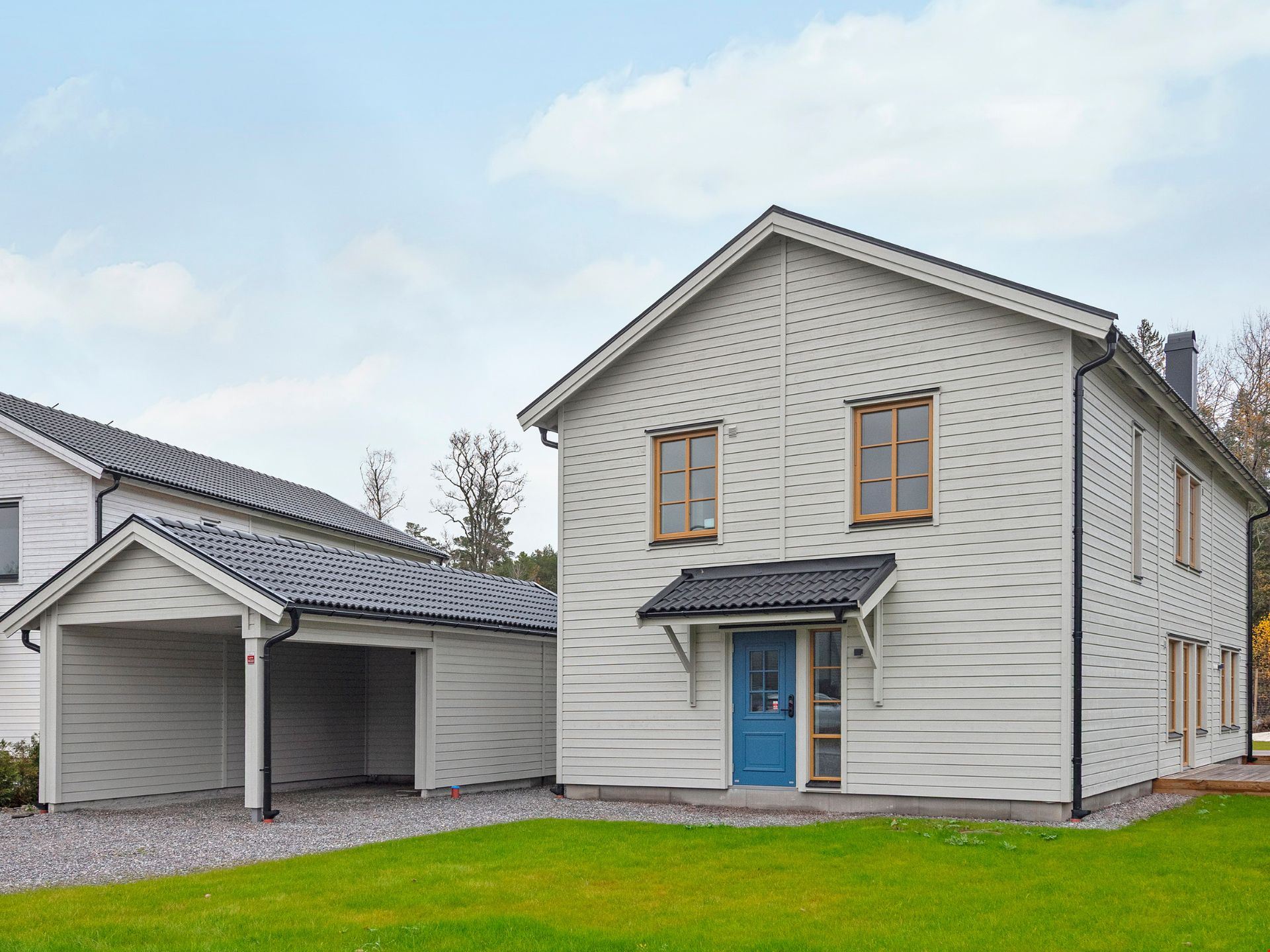 Till huset hör även en carport, altan och laddstolpe för elbil.