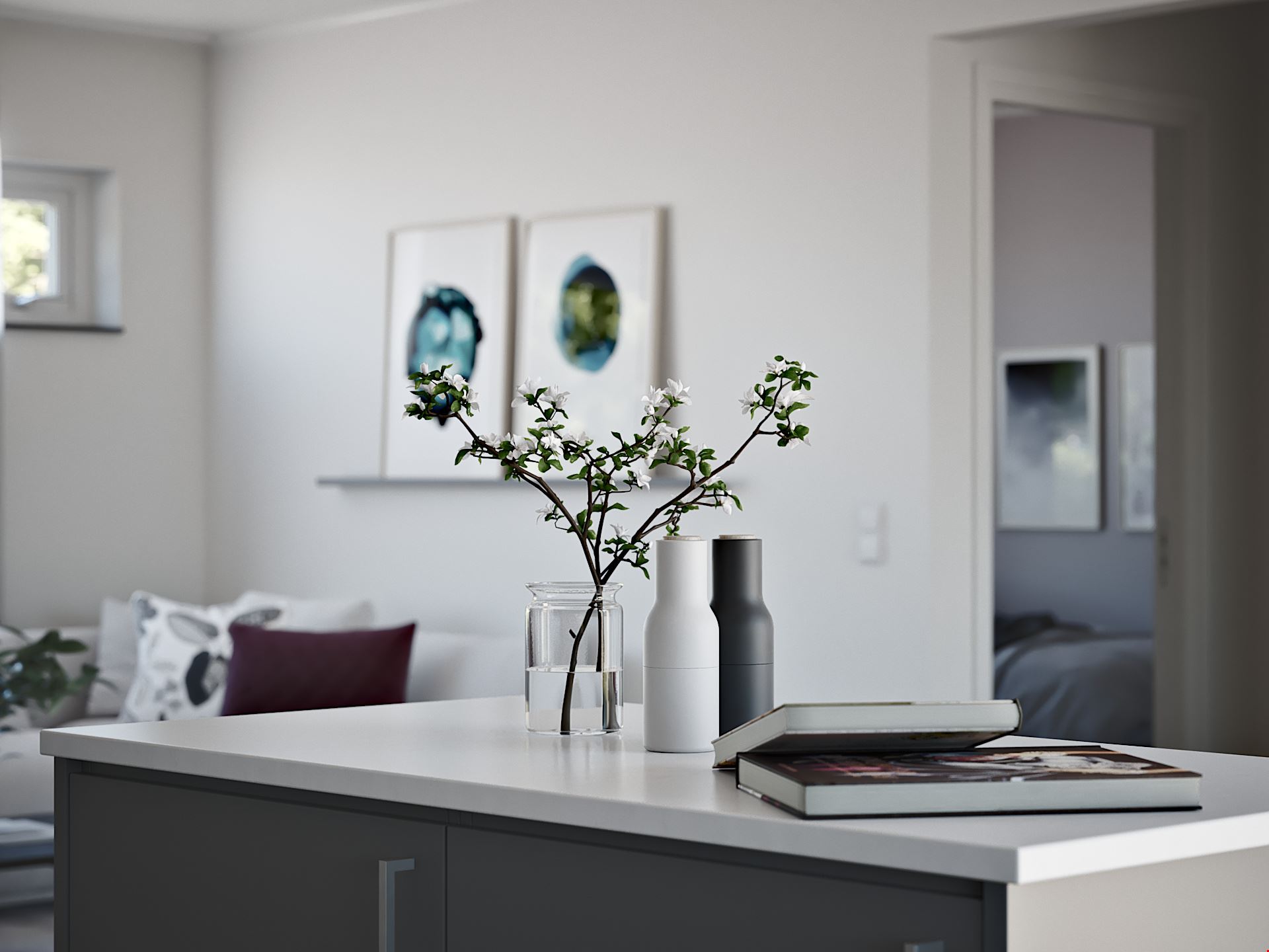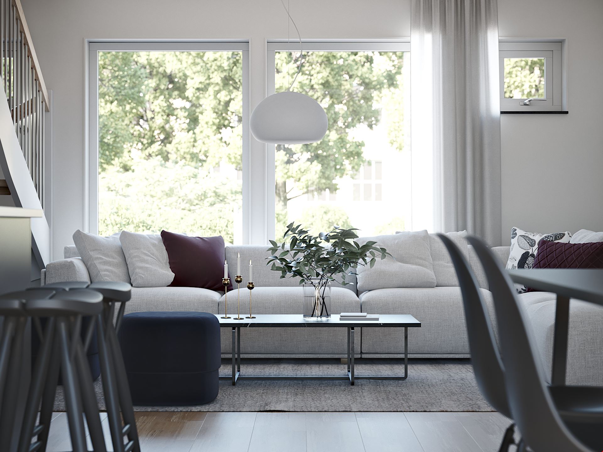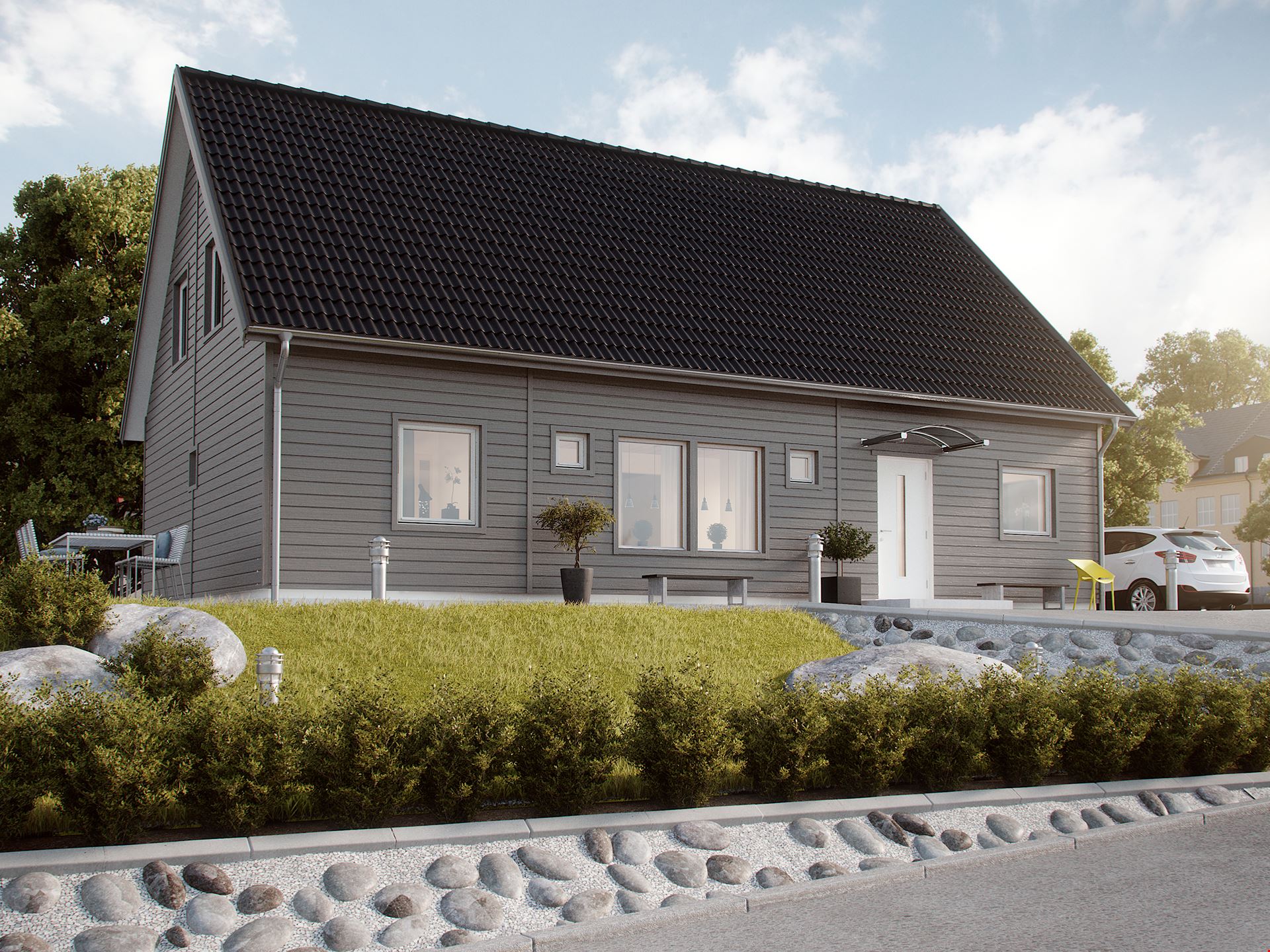 Smart 98+ är ett 1,5-planshus med inredningsbar övervåning som vi rekommenderar att bygga med putsad fasad på den här tomten. Det passar utmärkt för en familj som vill börja med ett mindre boende och en lägre investering, men fortfarande ha en smidig möjlighet att utöka sin boyta längre fram. Smart 98+ är ritat med en generös fönstersättning som ger en nära kontakt med trädgården och ökar känslan av rymd ytterligare.