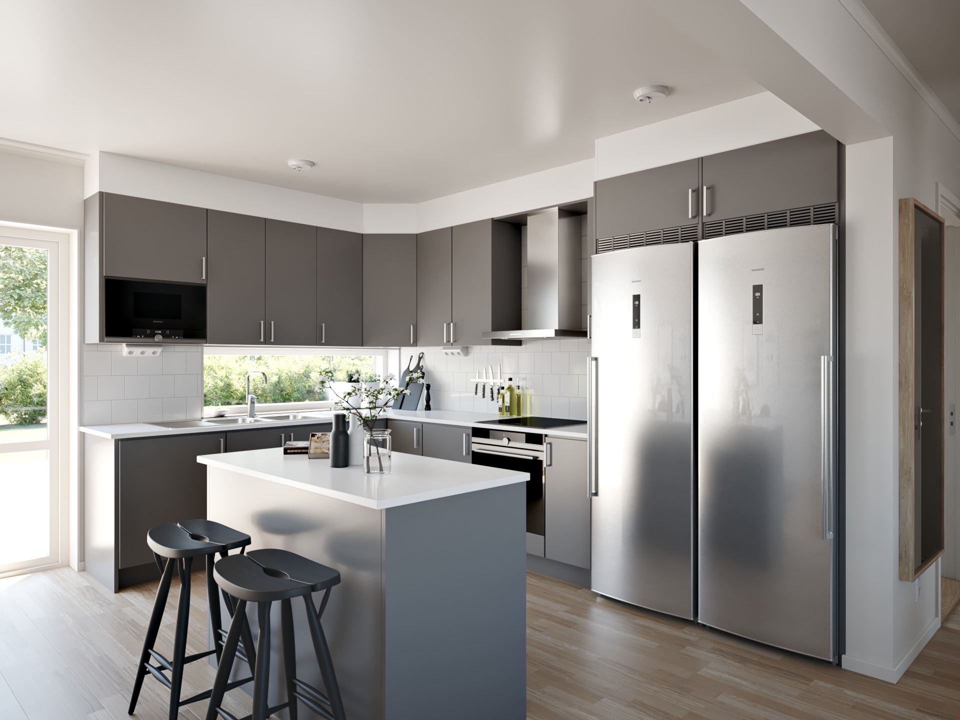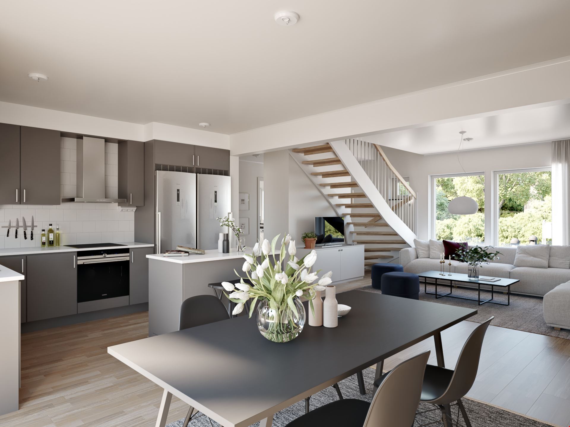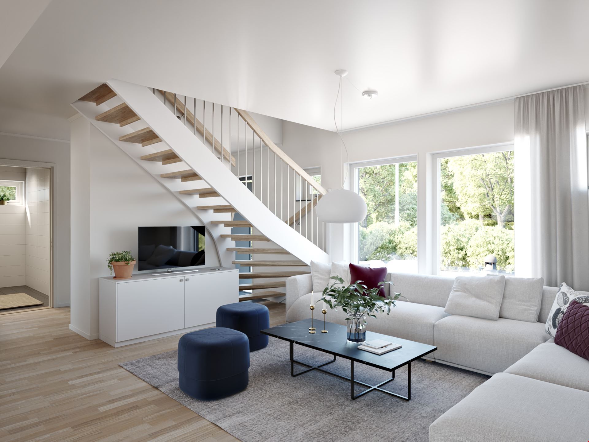Smart 98+ är ett 1,5-planshus med inredningsbar övervåning som vi rekommenderar att bygga med putsad fasad på den här tomten. Det passar utmärkt för en familj som vill börja med ett mindre boende och en lägre investering, men fortfarande ha en smidig möjlighet att utöka sin boyta längre fram. Smart 98+ är ritat med en generös fönstersättning som ger en nära kontakt med trädgården och ökar känslan av rymd ytterligare.