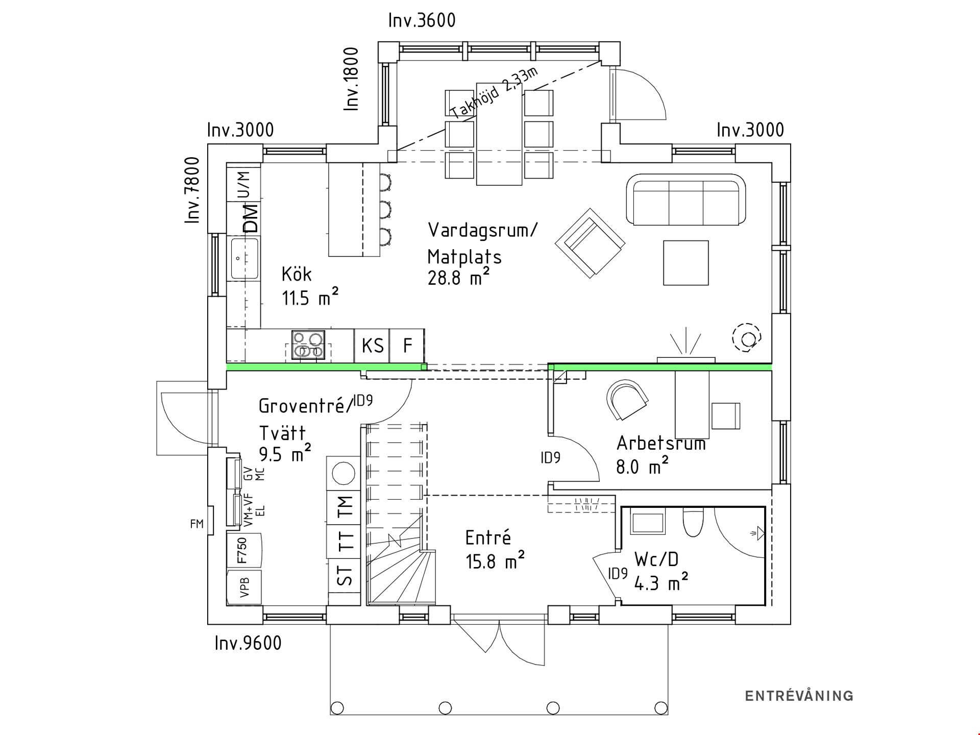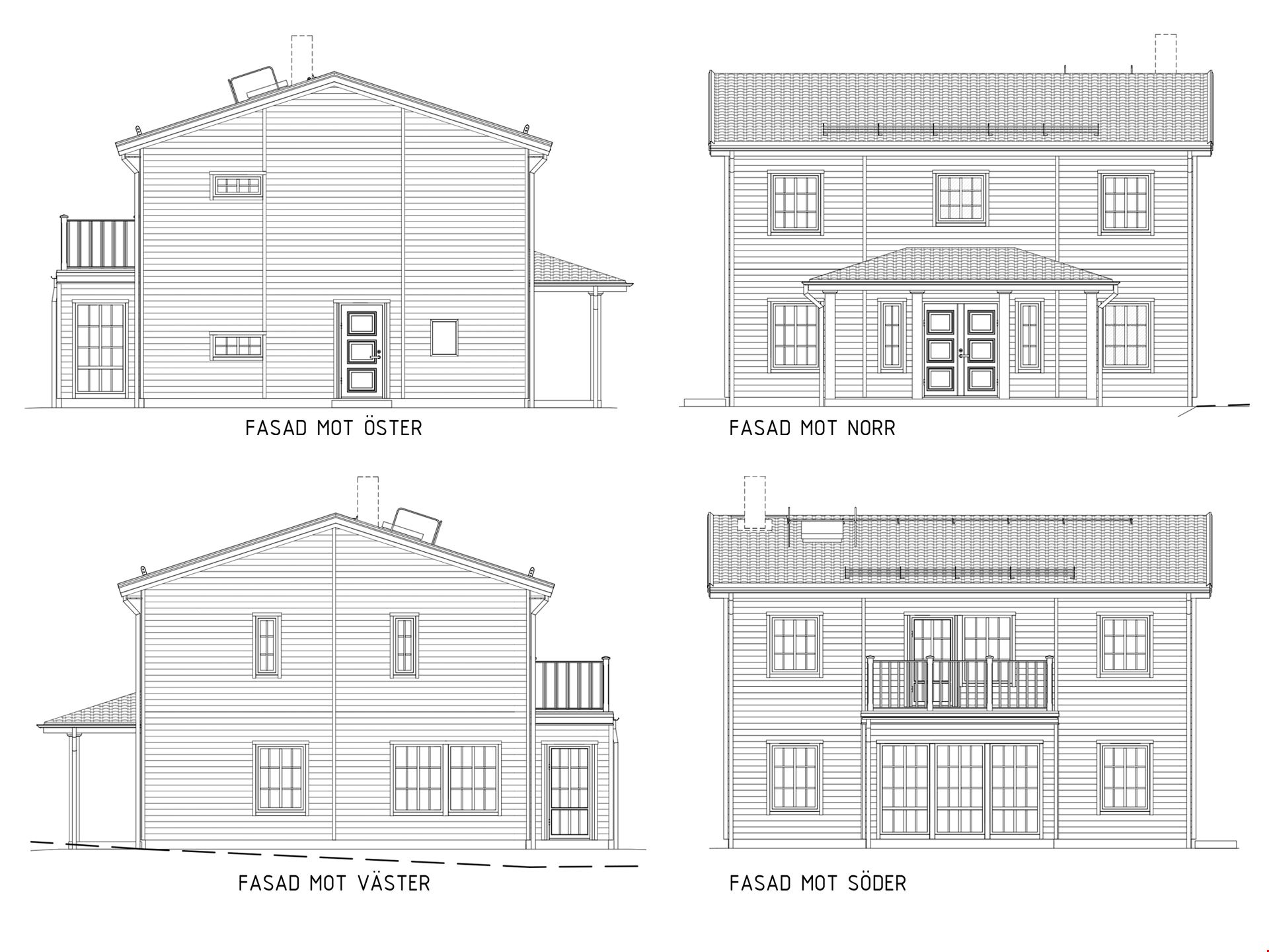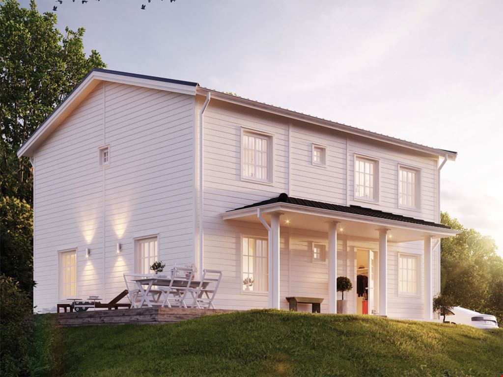Det här huset har vi byggt med en pampig entré med dubbeldörrar och stort entrétak med pelare. Baksidan ligger i söderläge och bjuder på kvällssol som du kan avnjuta från verandan eller genom de stora fönsterna från burspråket.