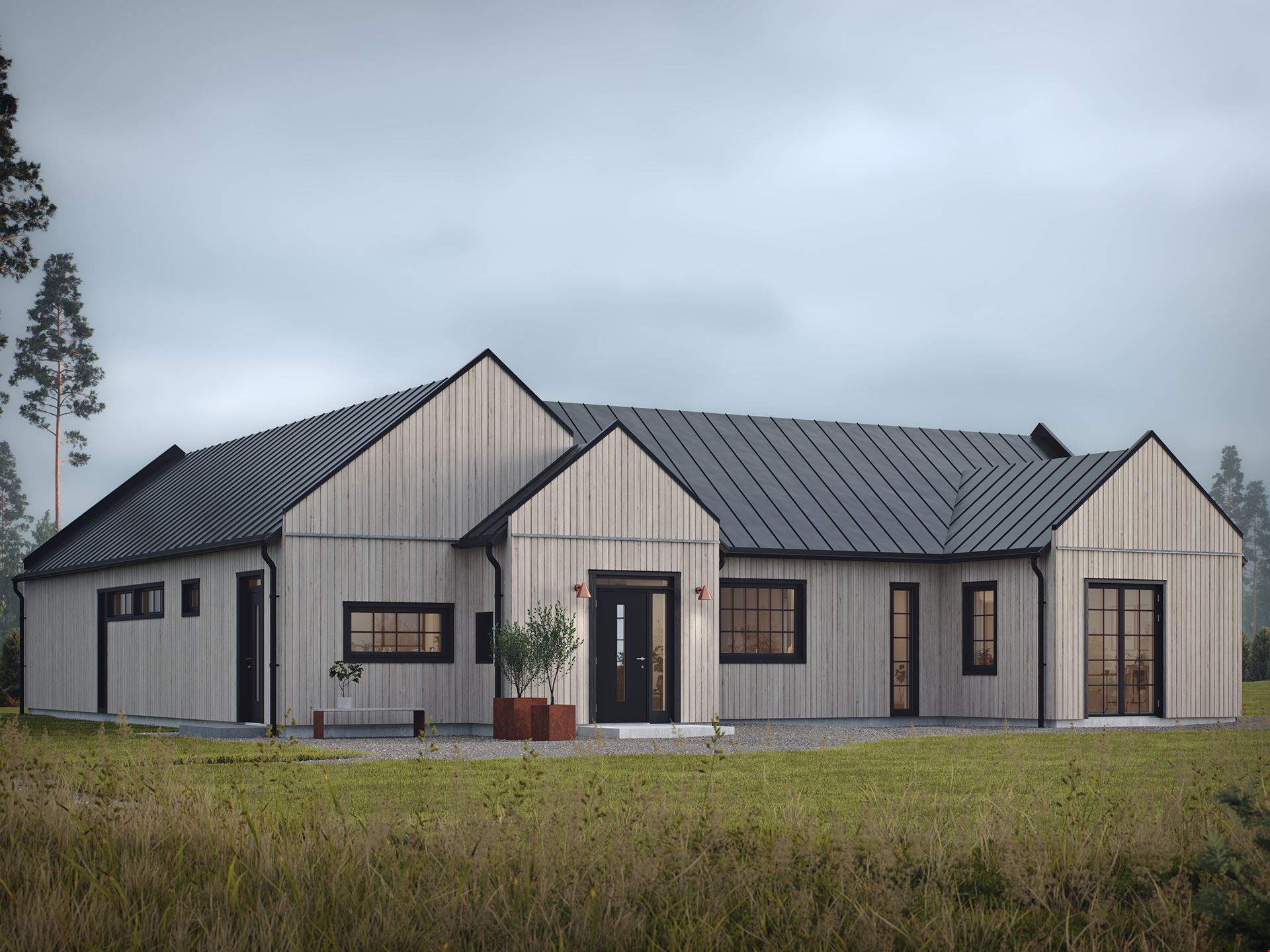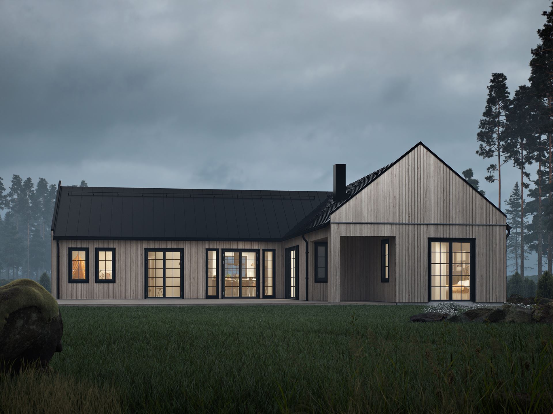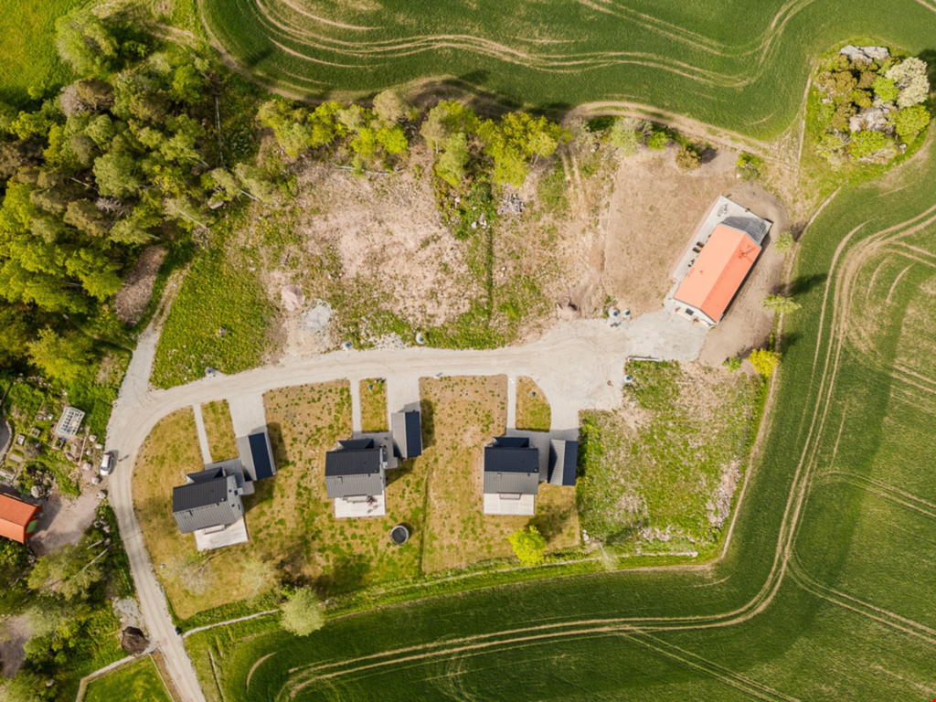 På denna tomt rekommenderar vi att du bygger något av våra 1-planshus. Förslagsvis modellen Nymåne, ett hus som är enkelt att anpassa efter en familjs specifika behov – både den mindre och lite större. Vinkelhusets stora glaspartier kommer släppa in ljuset och omgivningen och det öppna köket och vardagsrummet kopplas samman med en fri siktlinje.