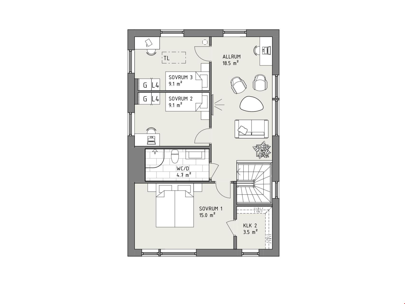 Smart 133 är ett tvåplanshus där varje kvadratmeter är noggrant genomtänkt. Här möts du av en öppen och inbjudande planlösning med generösa sällskapsytor på entréplanet och privata rum samlade en trappa upp. Flexibla lösningar gör det enkelt att anpassa efter just din familjs behov – kanske vill du skapa ett extra allrum, hemmakontor eller ett gästrum? Här får du plats med både liv och lugn, i ett hem som växer med dig.