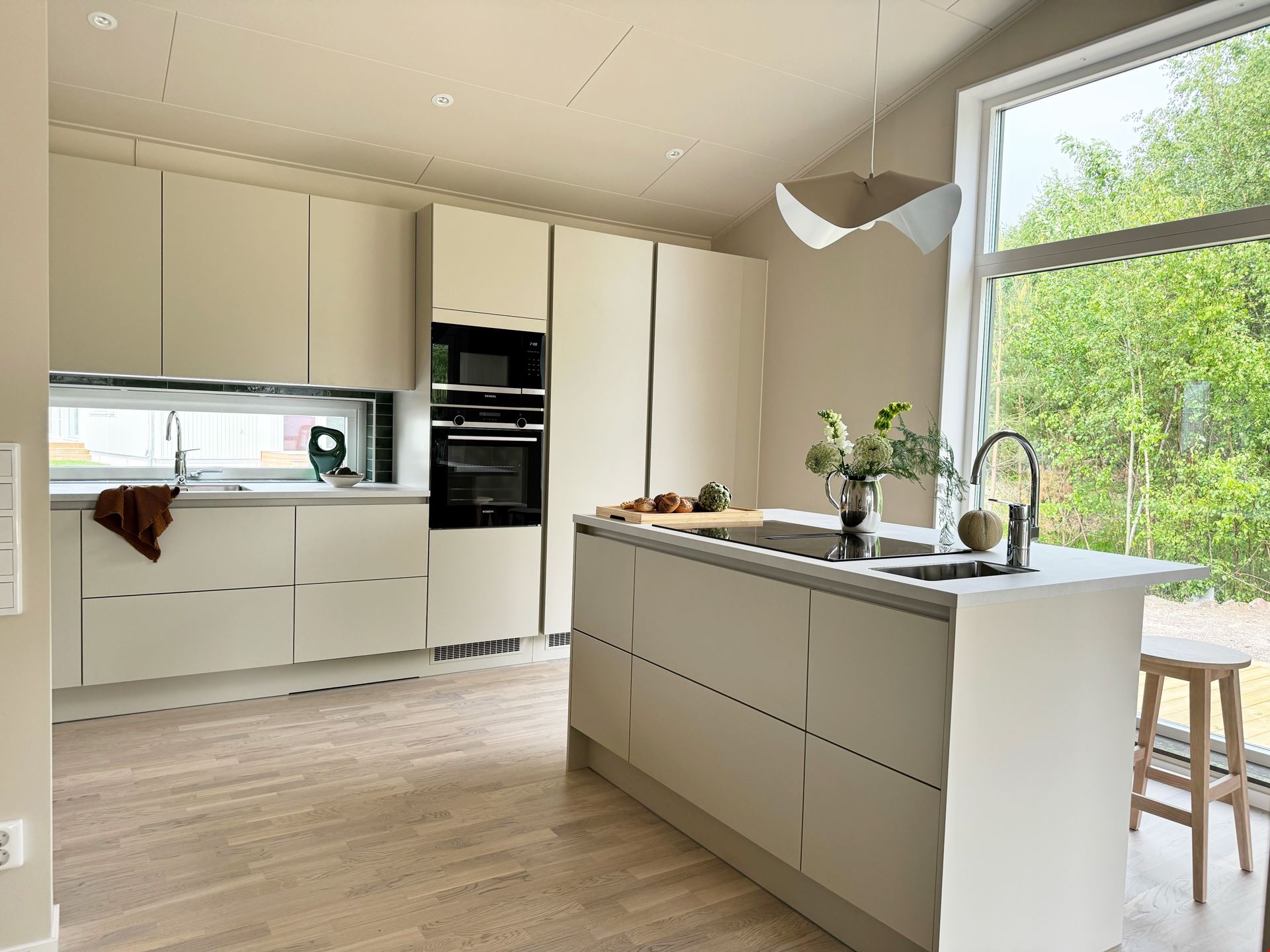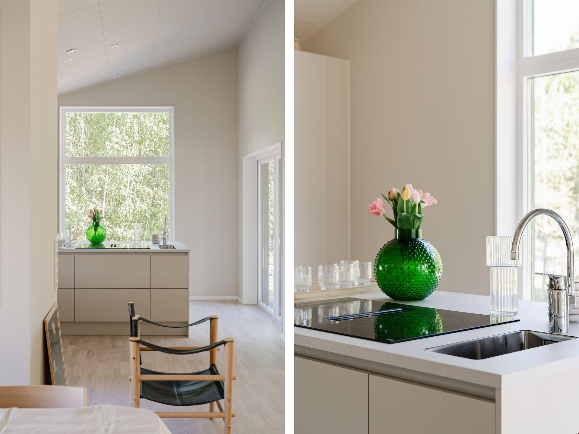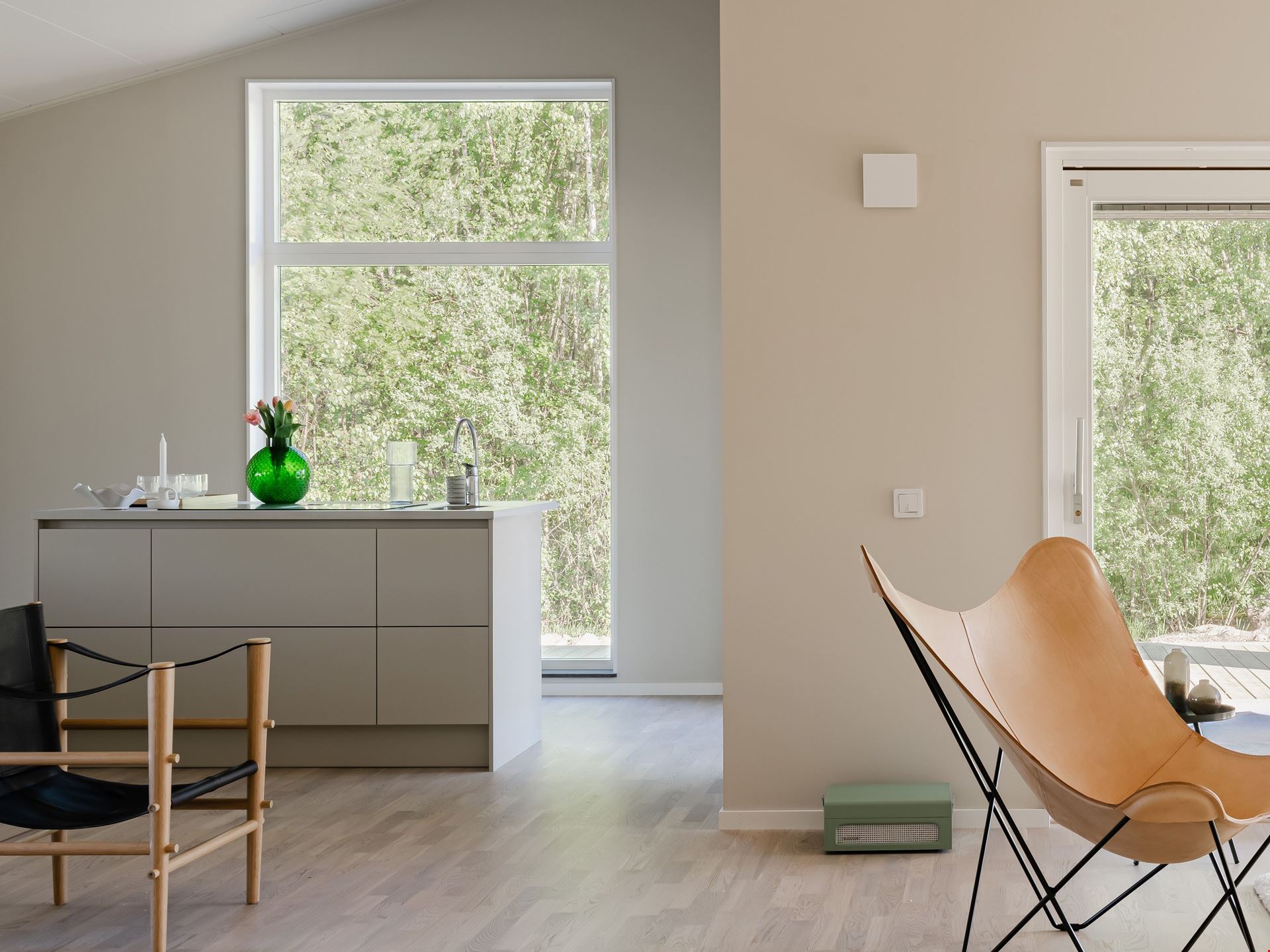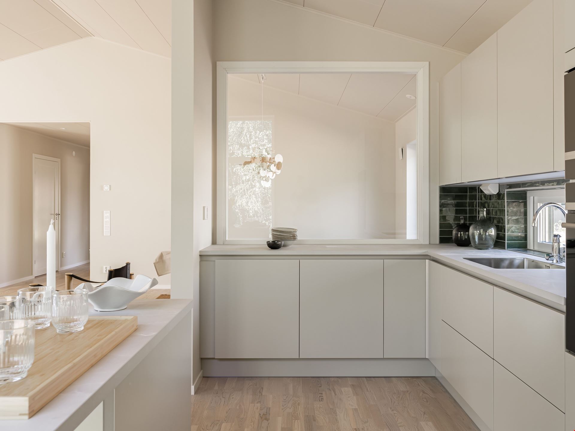 Både köket och vardagsrummet är smart planerat, vilket skapar ett härligt flöde mellan de två rummen som ligger i vinkel. I själva köket finns ett dekorativt glasparti mellan arbetsytan och matplatsen. Det knyter samman de två ytorna – samtidigt som det skapar olika rumsligheter. Här måste vi ju också nämna den ljuvliga, indragna uteplatsen som väntar utanför vardagsrummet.