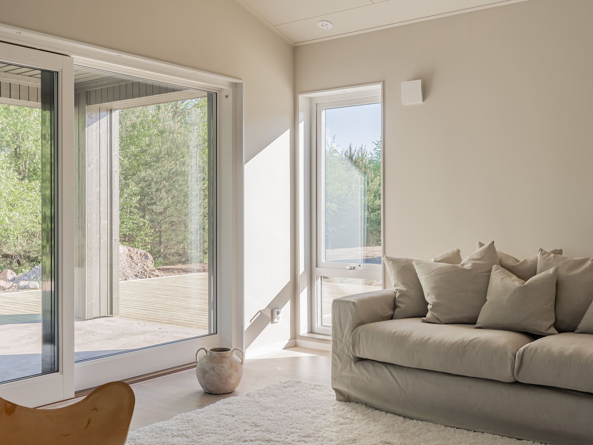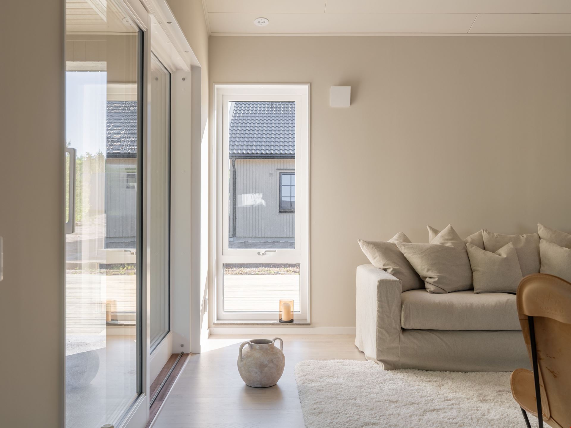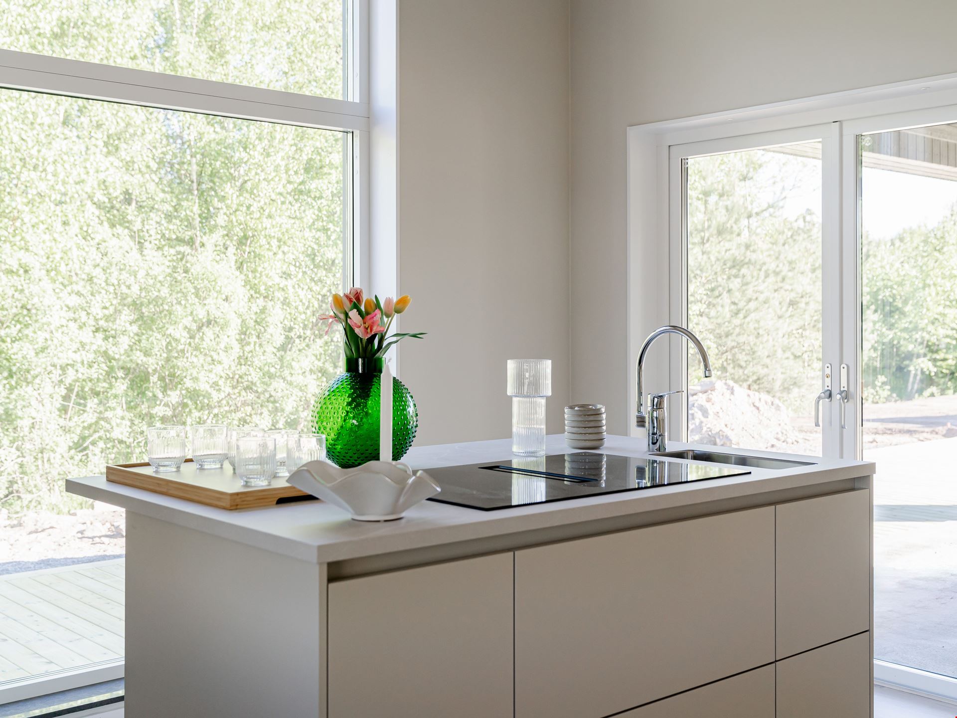Både köket och vardagsrummet är smart planerat, vilket skapar ett härligt flöde mellan de två rummen som ligger i vinkel. I själva köket finns ett dekorativt glasparti mellan arbetsytan och matplatsen. Det knyter samman de två ytorna – samtidigt som det skapar olika rumsligheter. Här måste vi ju också nämna den ljuvliga, indragna uteplatsen som väntar utanför vardagsrummet.