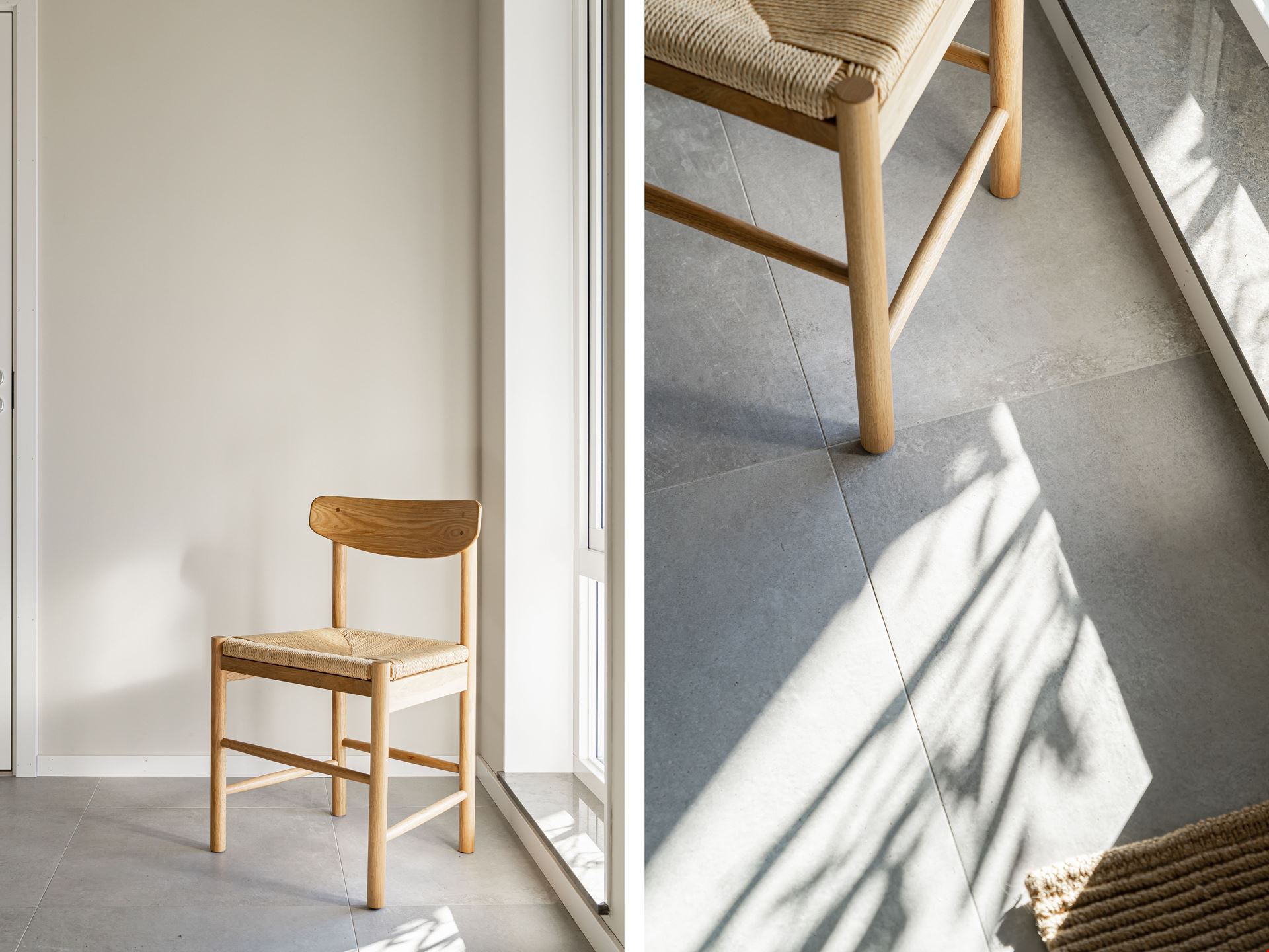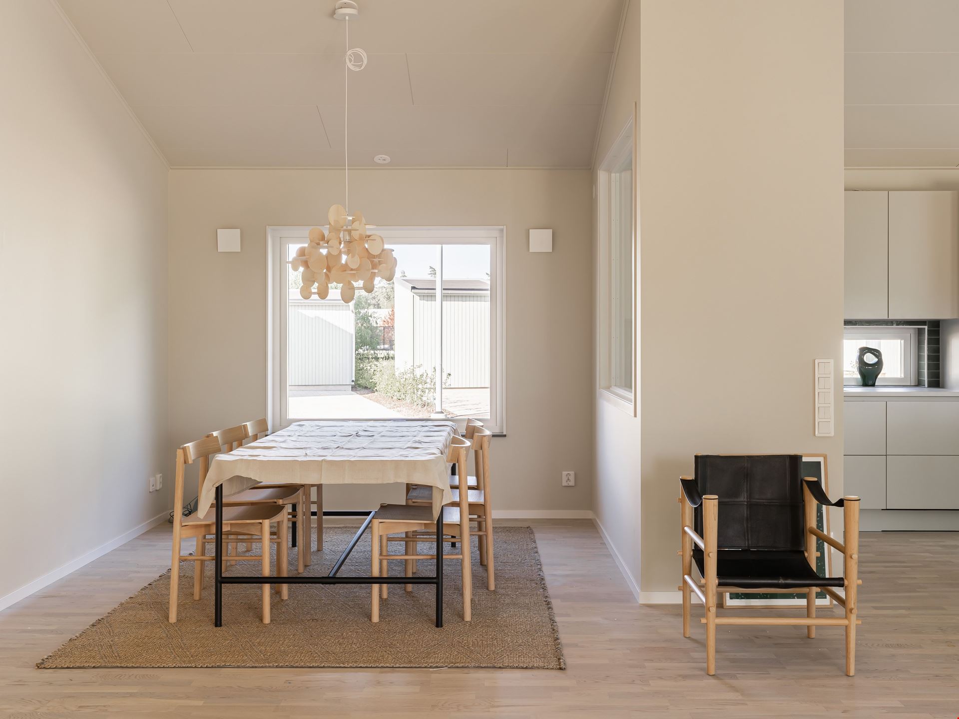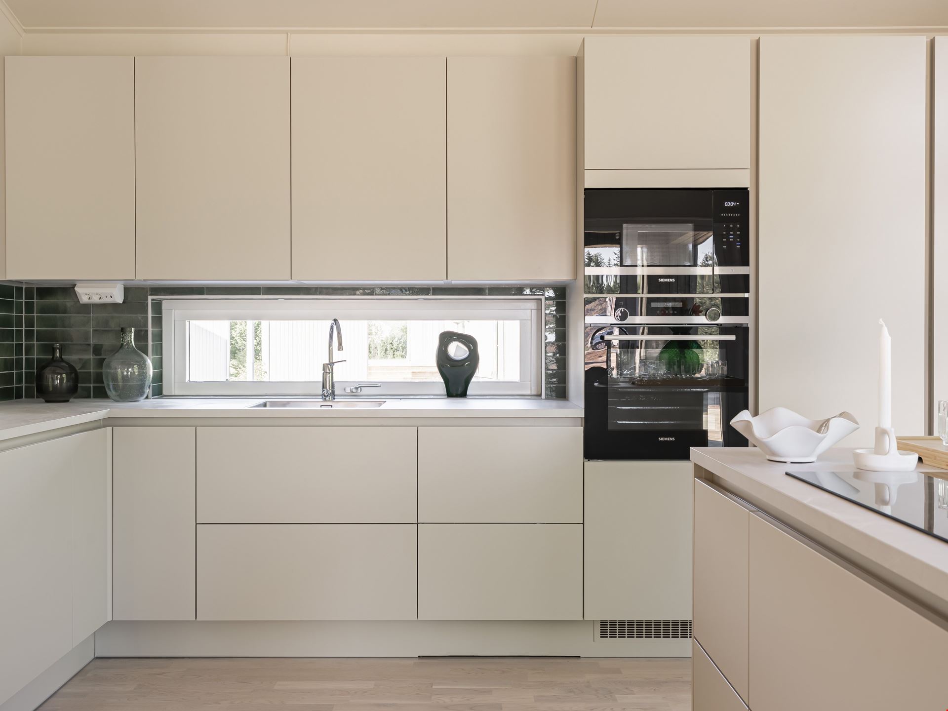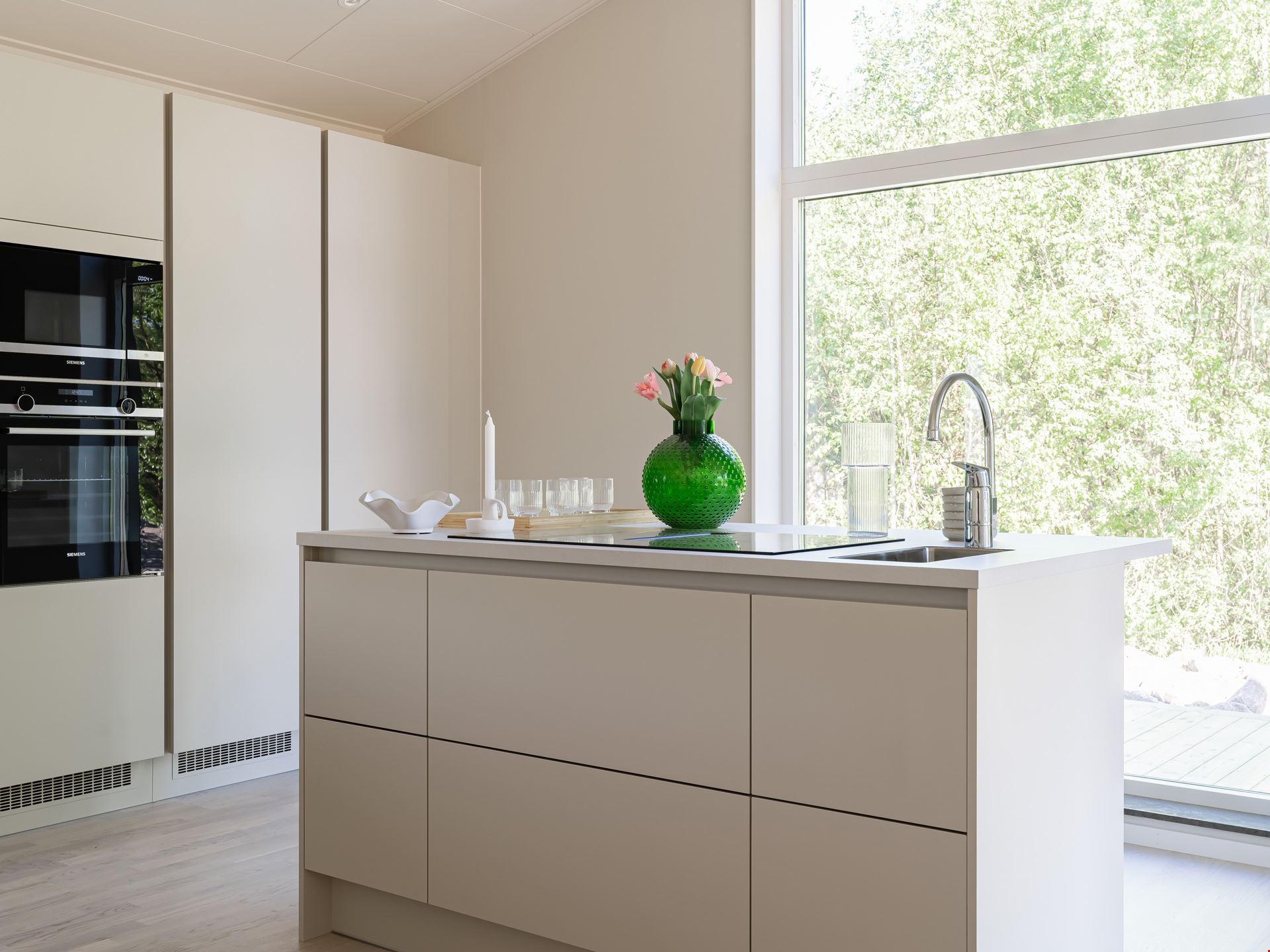 Både köket och vardagsrummet är smart planerat, vilket skapar ett härligt flöde mellan de två rummen som ligger i vinkel. I själva köket finns ett dekorativt glasparti mellan arbetsytan och matplatsen. Det knyter samman de två ytorna – samtidigt som det skapar olika rumsligheter. Här måste vi ju också nämna den ljuvliga, indragna uteplatsen som väntar utanför vardagsrummet.